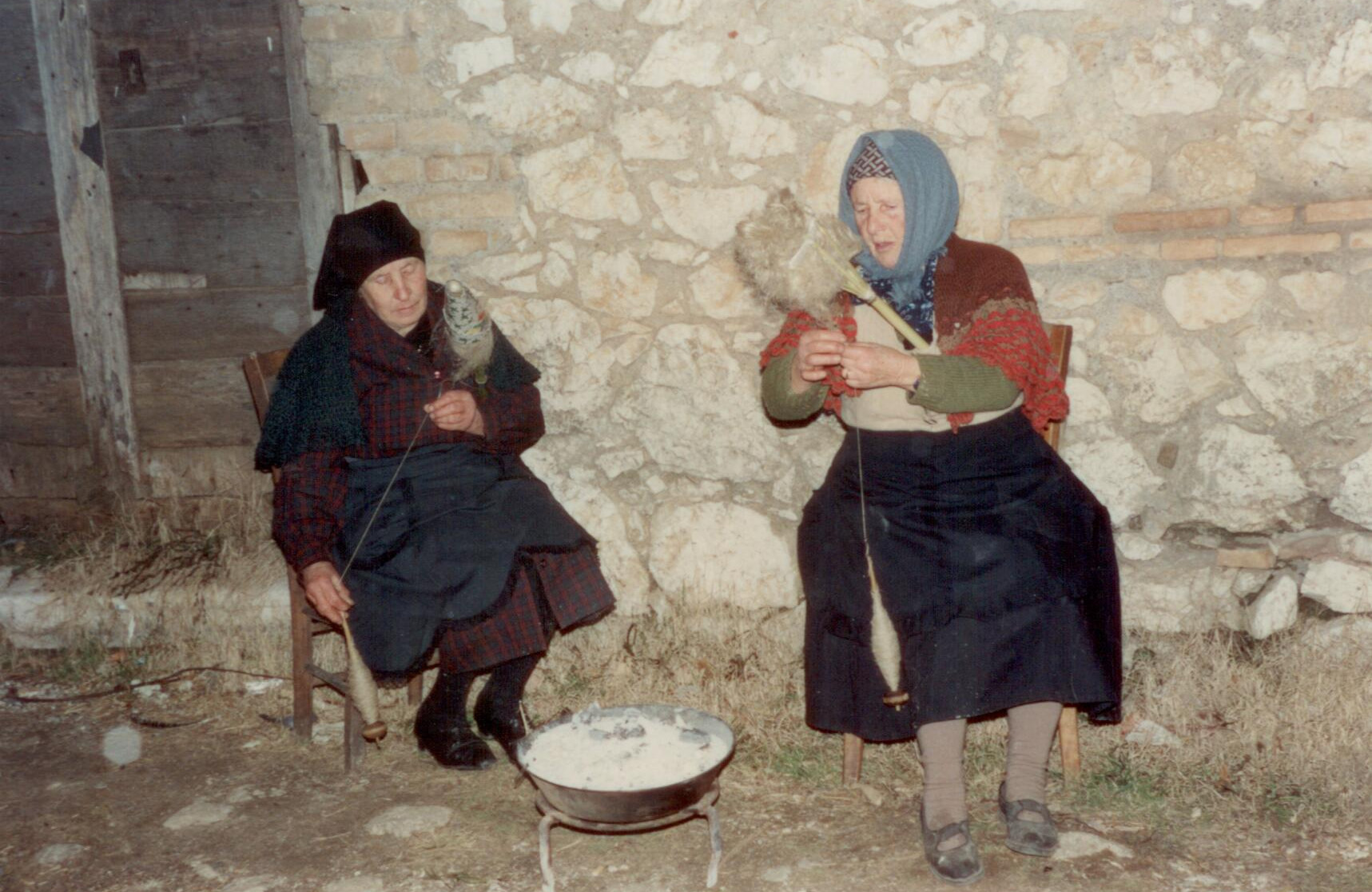 Secondina Marchionni (1927-2016): «Dopo che se passeva alla macigna, se scanzevano le parti legnose e se fileva co’ le conocchie. Ci lle faceva jo fratéjjo de zia Maria d’Agrippino che era de Cappelle. Po’ s’addopreva jo fuso pe’ fila’. Se ‘mbonneva jo fijo co’ llo sputato e se ‘ntrecceva. La sera ci radunèmmo co’ lle compagne alla casa de Pezzuchitto e facèmmo a aiutarèlla… Quanno s’erano fatte le matasse se mettevano all’acqua calla a ‘olli’ co’ lla cennere. Se resciacquevano e s’appicchevano a assuca’ comme le saocìcce. Quanno che erano belle assutte, erano pronte pe’ le tesse. Mamma me’ teneva jo telaro; j’era misso alla cantina e de notte “tunche e ttunche”… sentivi sempre quijo rumoro».