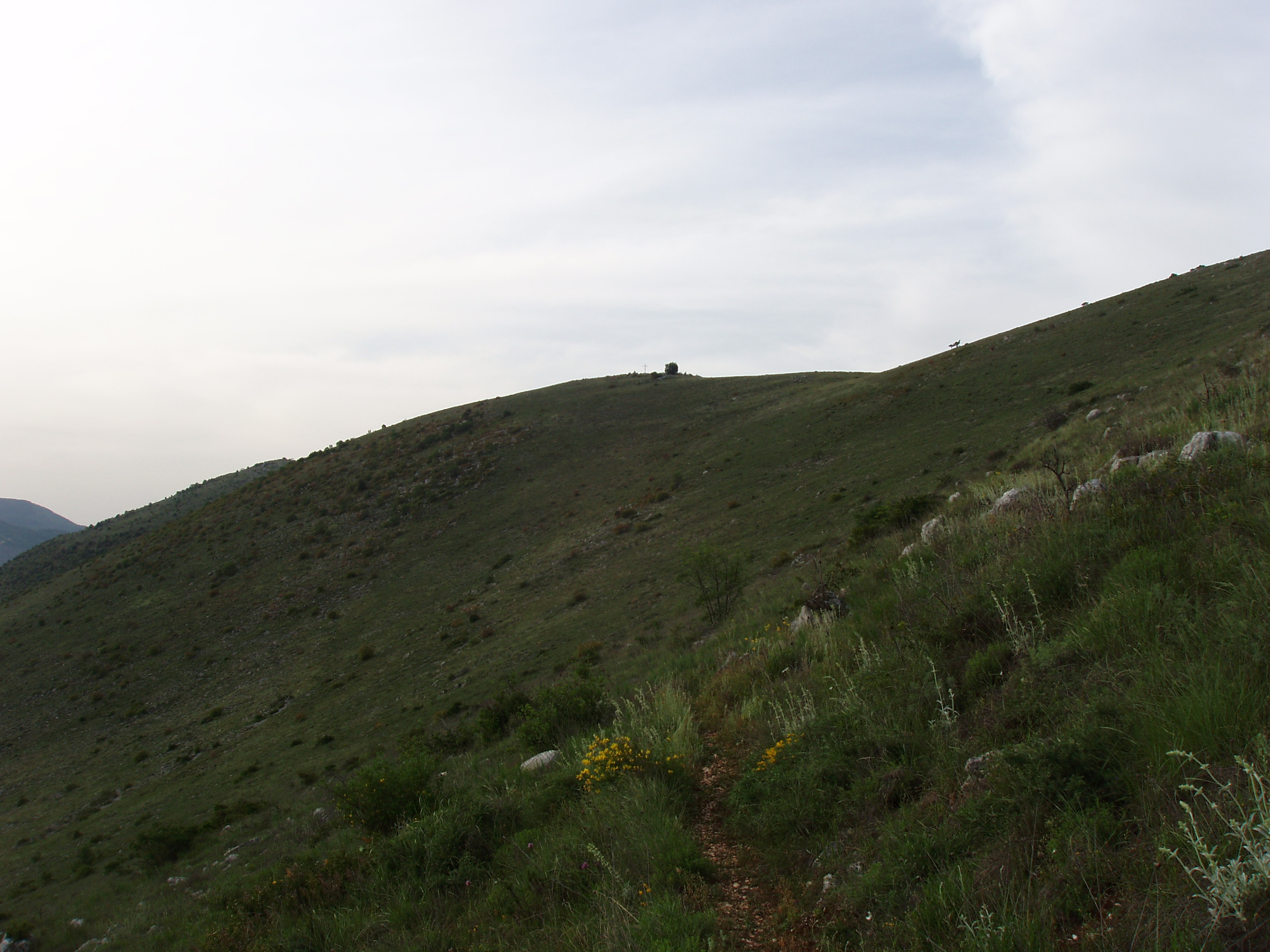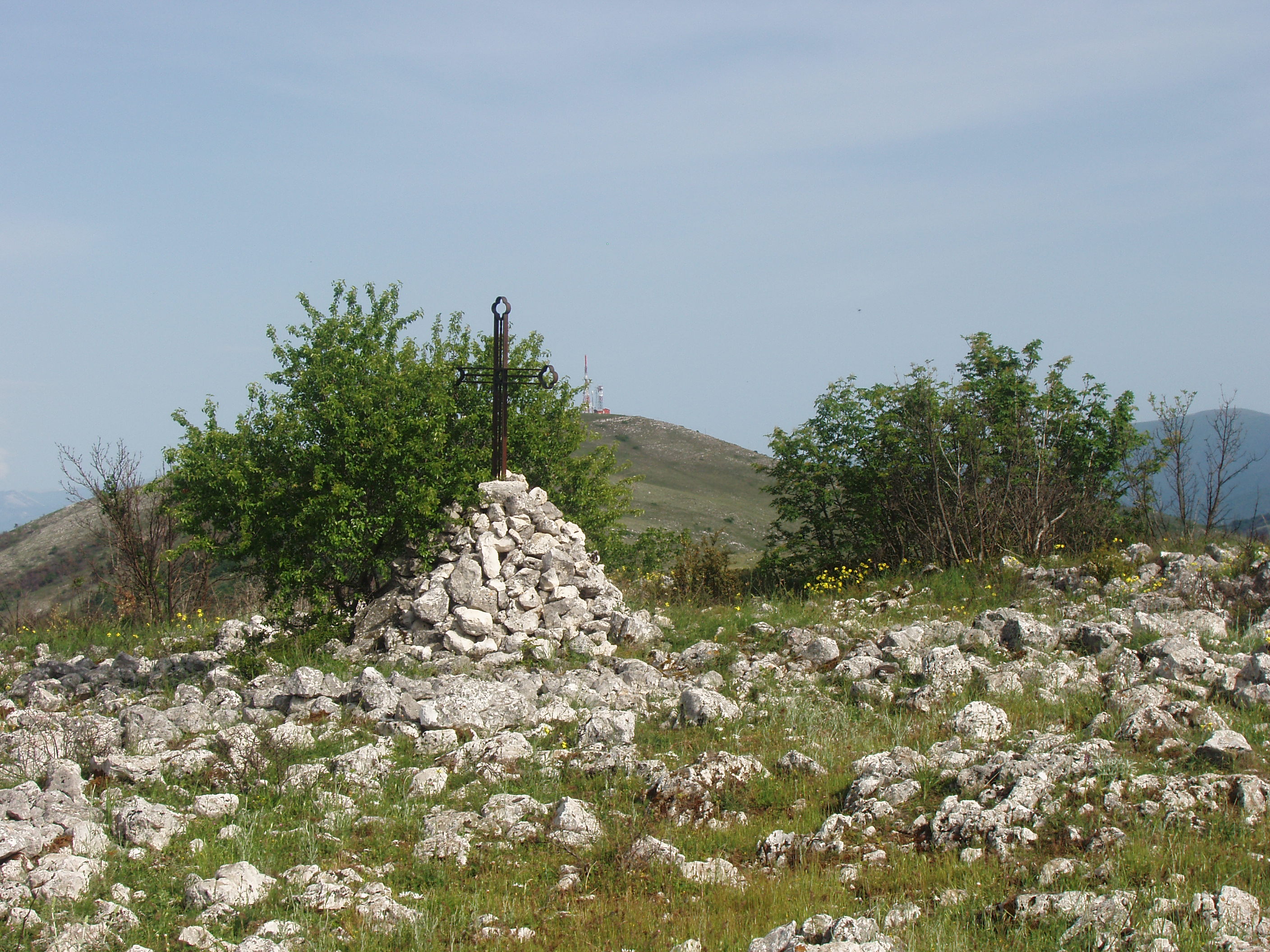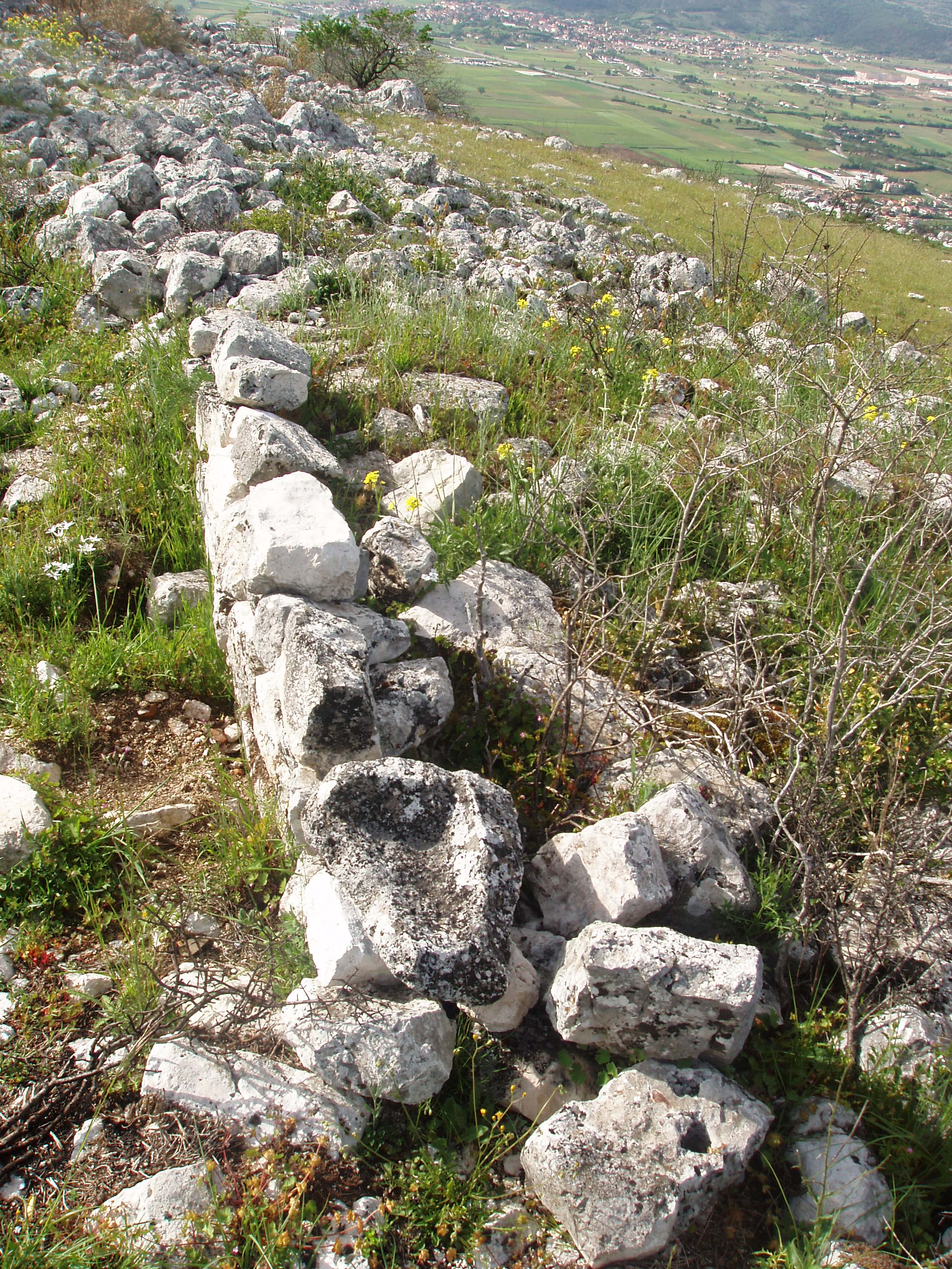Il quinto è ben riconoscibile sull’altura di Monte S. Felice, quota 1.030 che sovrasta la Stazione Ferroviaria di Cappelle. La sommità è ora erroneamente detta di San Felice[1], ma in passato era denominata “Cima di S. Giovanni d’Alezzo” o “di Alizio”. Qui si riconoscono i resti di tre cinte murarie, dotate di cinque porte “a corridoio interno obliquo”, e di due terrazzi interni con superficie occupata di 2,6 ettari. Il numero delle recinzioni difensive presuppone uno sviluppo cronologico del centro fortificato, dal primitivo nucleo ovoidale sommitale dell’età del Ferro alle altre due cinte delle epoche successive fino all’abbandono della fine del IV secolo con la probabile conquista romana. I ritrovamenti ceramici e la numerosa presenza di tegolame sui terrazzi interni documentano l’esistenza dell’abitato interno dalla prima età del Ferro all’età ellenistica. Il ritrovamento di un contenitore plumbeo con missili per fionda dello stesso metallo nell’interno, sono prova di una riutilizzazione dell’acropoli del centro da parte degli insorti italici durante il conflitto del Bellum Marsicum degli inizi del I secolo a.C. Nel medioevo, sulla sommità della prima recinzione, fu realizzata, probabilmente su un precedente terrazzo cultuale italico, la chiesa di Sancti Iohannis de Alitio, appartenente, forse, al feudo di Pietraquaria e di cui rimangono le sole fondazioni che disegnano la pianta di una struttura a tre piccole corte navate con abside centrale e vicina cisterna circolare esterna[2]. A partire dalla recinzione più esterna del centro fortificato prendevano vita due sentieri che si incrociavano nei pressi di una sorgente detta “di Santa Barbara”, collocata ad una quota di 998 metri sul livello del mare, la quale costituiva il più vicino luogo di rifornimento di acqua del centro fortificato.