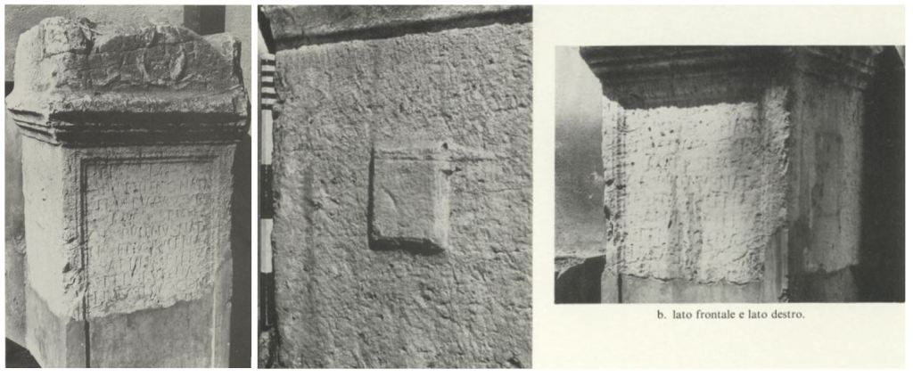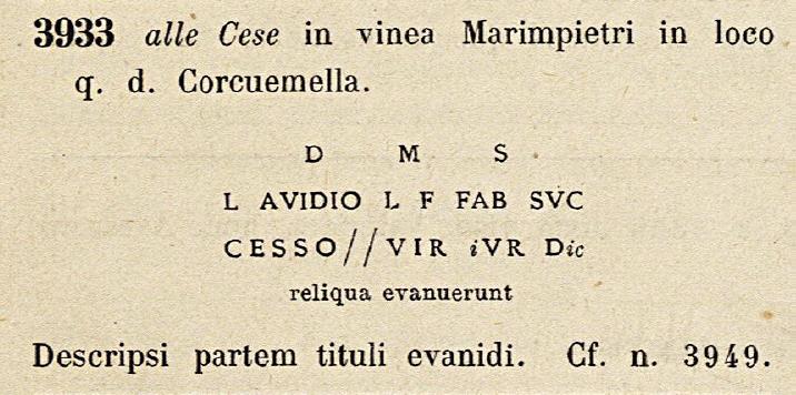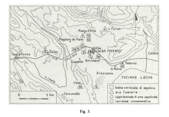Nel 1882 venne resa nota dal Garrucci un’iscrizione letta con molta fatica su un’ara funeraria posta accanto al portone della vigna Tomei alle Cese (comune di Avezzano, vedi carta figura 3) . Stranamente il testo, già mancante nelle Iscriptiones Regni Neapolitani Latinae (Liepzig 1852) del Mommsen, non fu neppure accolto nel volume nono del Corpus Inscriptionum Latinarum (Berlin 1883). In seguito l’ara fu trasportata ad Avezzano, insieme ad un’altra rinvenuta nel territorio delle Cese (CIL IX 3933), e posta accanto all’ingresso del Museo Civico. Nel catalogo delle epigrafi di questo museo, l’Orlandi non osava presentare una lettura dell’iscrizione, giudicata “illeggibile”. Preparando una revisione critica del materiale epigrafico di Alba Fucens abbiamo studiato anche il monumento in questione e mediante un calco siamo riusciti a restituire la maggior parte delle 10 righe del test. Nello stesso tempo ricerche di archivio, condotte da M. Buonocore nella Biblioteca Apostolica Vaticana, hanno riportato alla luce nel codice Ferraioli 513 f.30 una trascrizione della stessa epigrafe – risalente all’inizio del secolo scorso – alquanto diversa da quella pubblicata dal Garrucci e più conforme alla nostra restituzione basata su autopsia.