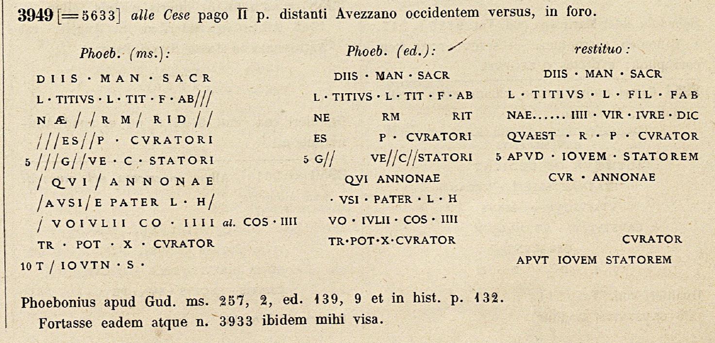 T. Mommsen, “Corpus Inscriptionis Latinarum” (C.I.L.), IX, 3949, Berlino, 1883.