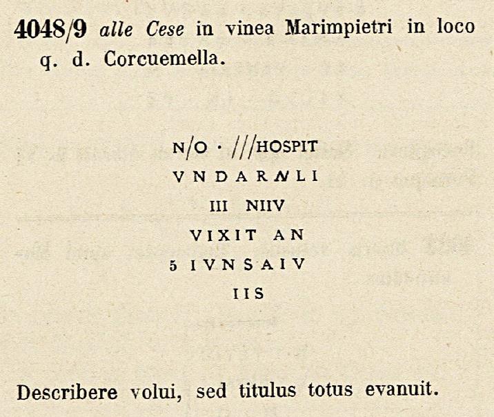 Questa stele è l’unica, tra le altre ora esaminate, che conserva l’indicazione dell’età del defunto: VIXIT AN(nis). Il testo è di dubbia ricostruzione. Nella prima linea è riferita comunque una interessantissima informazione che può riassumersi nel vocabolo HOSPIT(alis). È la conferma della presenza in questi luoghi di un ricco ed importante personaggio capace di relazioni clientelari ed economiche.