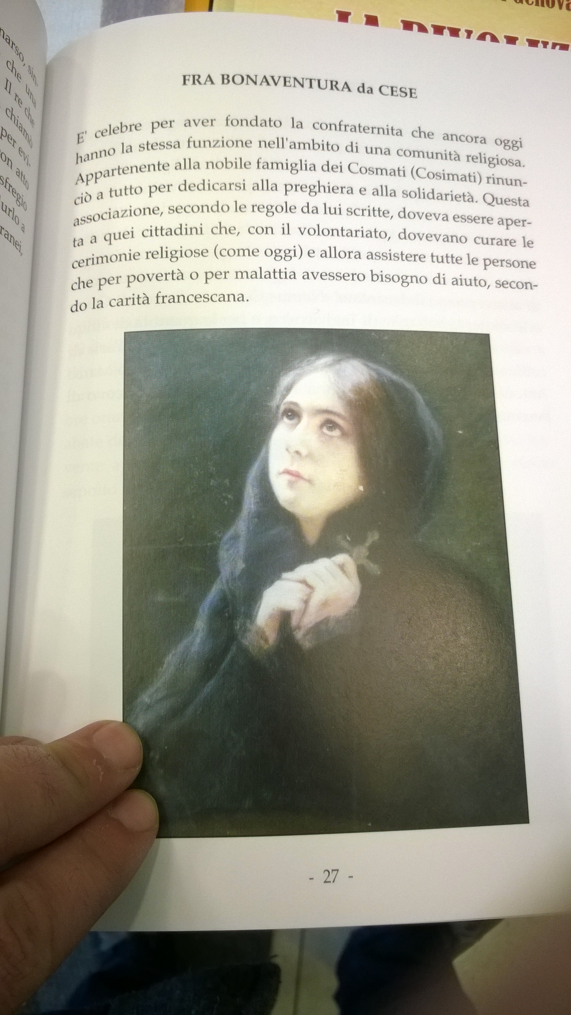 In un testo non meglio identificato si fa addirittura riferimento a Fra’ Bonaventura da Cese come fondatore delle confraternite di carità e si aggiunge un dettaglio inedito sul suo casato di origine. Si legge nello specifico: “Fra Bonaventura da Cese è celebre per aver fondato la confraternita che ancora oggi ha la stessa funzione nell’ambito di una comunità religiosa. Appartenente alla nobile famiglia dei Cosmati (Cosimati) rinunciò a tutto per dedicarsi alla preghiera e alla solidarietà. Questa associazione, secondo le regole da lui scritte, doveva essere aperta a quei cittadini che, con il volontariato, dovevano curare le cerimonie religiose (come oggi) e allora assistere tutte le persone che per povertà o per malattia avessero bisogno di aiuto, secondo la carità francescana”.