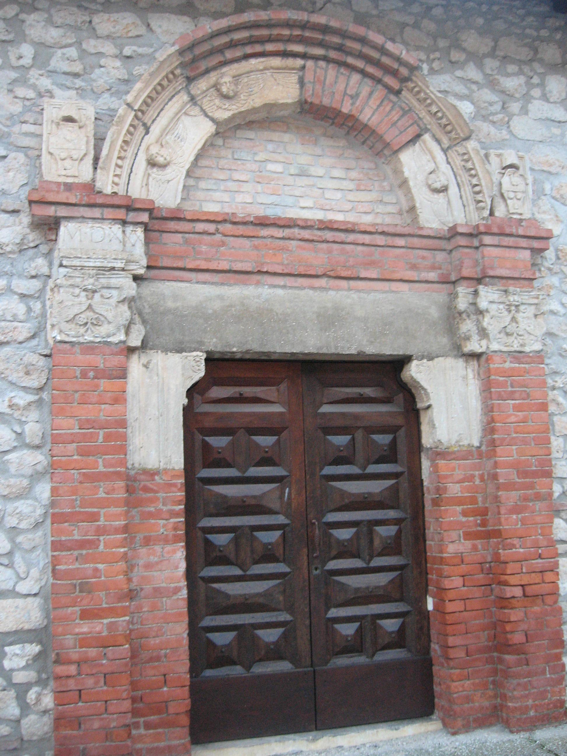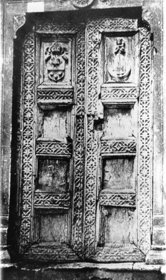 L’ingresso principale era chiuso da una porta di sambuco, con intagliature finemente rilevate nelle bordature bloccanti le otto posterule. Il disegno era composto secondo lo stile gotico, con un intreccio di vitigni privi di foglie costantemente intercalati da una perla a rilievo. Nelle due posterule superiori, una sull’anta fissa e l’altra su quella mobile, erano disposte a rilievo l’insegna episcopale dei Maccafani e l’effigie intera della Madonna coronata, con ai piedi la falce della luna ed in braccio il bambino. Tutte le posterule, quattro per anta, erano riquadrate a sbalze. Nel complesso la porta poteva dirsi ancora discretamente conservata nell’anno 1903, quando Piccirilli la fotografò. Oggi è rimasto un solo frammento relativo alla formella con la Madonna ed il Bambino.