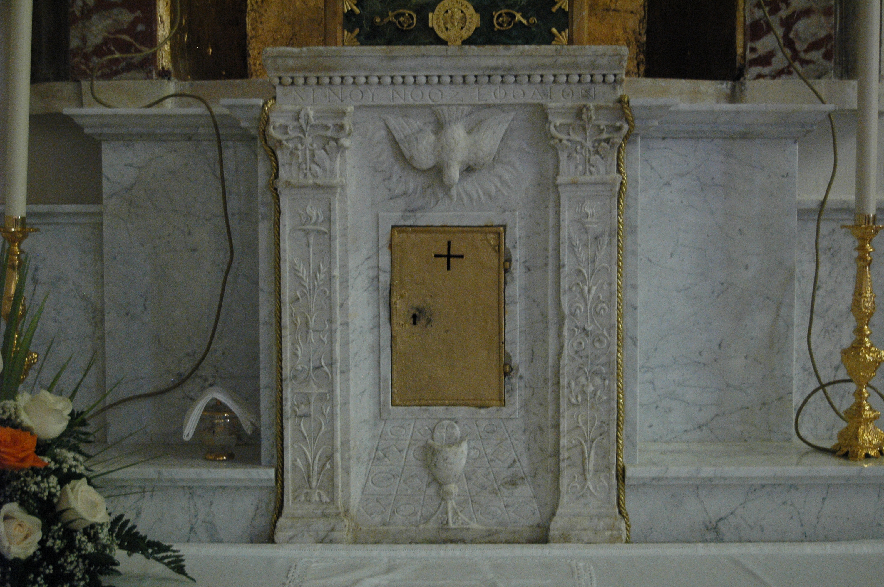 La lastra marmorea del tabernacolo, rimurata nella chiesa principale di Cese, è una pregevolissima particolarità architettonica relativa al restauro dell’antico tempio conclusosi nel 1532. È stata ritrovata in una stalla, dove era stata accantonata dal 1915[1]. Mentre nei capitelli i bachi da seta sono semiaperti, nella lastra del tabernacolo sono rappresentati aperti ed allineati lungo la trave che sormonta idealmente le colonnine laterali. I capitelli sono pregevolmente lavorati son movimenti floreali di vitigni, foglie e piante di grano che si allineano ed attorcigliano intorno allo stelo di una finissima coppa in cui arde il fuoco eterno. La lastra è pregevolissima nella forma e raffigura in prospettiva nel pavimento la forma ed il disegno dell’antica soffittatura del tempo cesense, composta da cassettoni quadrati alternati a quelli tondi. Sulla base della lastra è cesellato un calice dalla forma molto semplice e lineare, privo di stelo, con un cubo umbonato e la base quadrangolare, lateralmente abbellita di un fiore per lato. La porticina in ferro che chiude il tabernacolo è sovrastata da una colomba in altorilievo simboleggiante lo Spirito Santo. Sulla trave di copertura della struttura rappresentata è la scritta in greco: Olio del Sacro viatico”.
