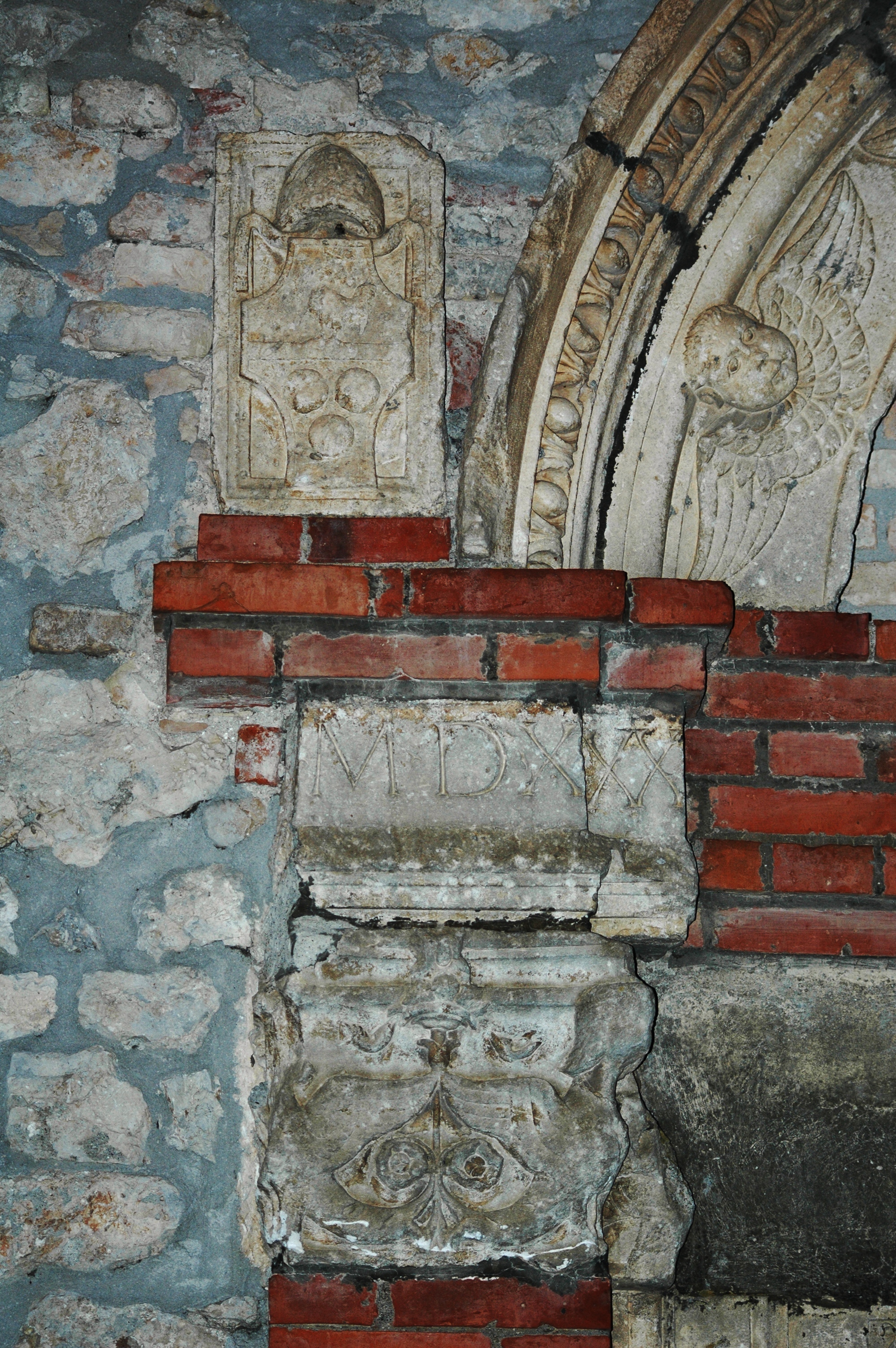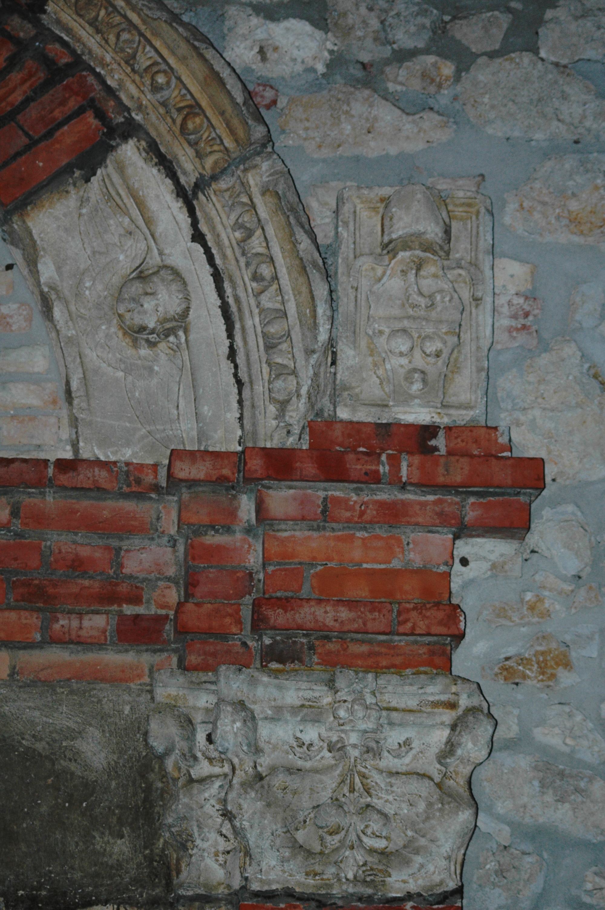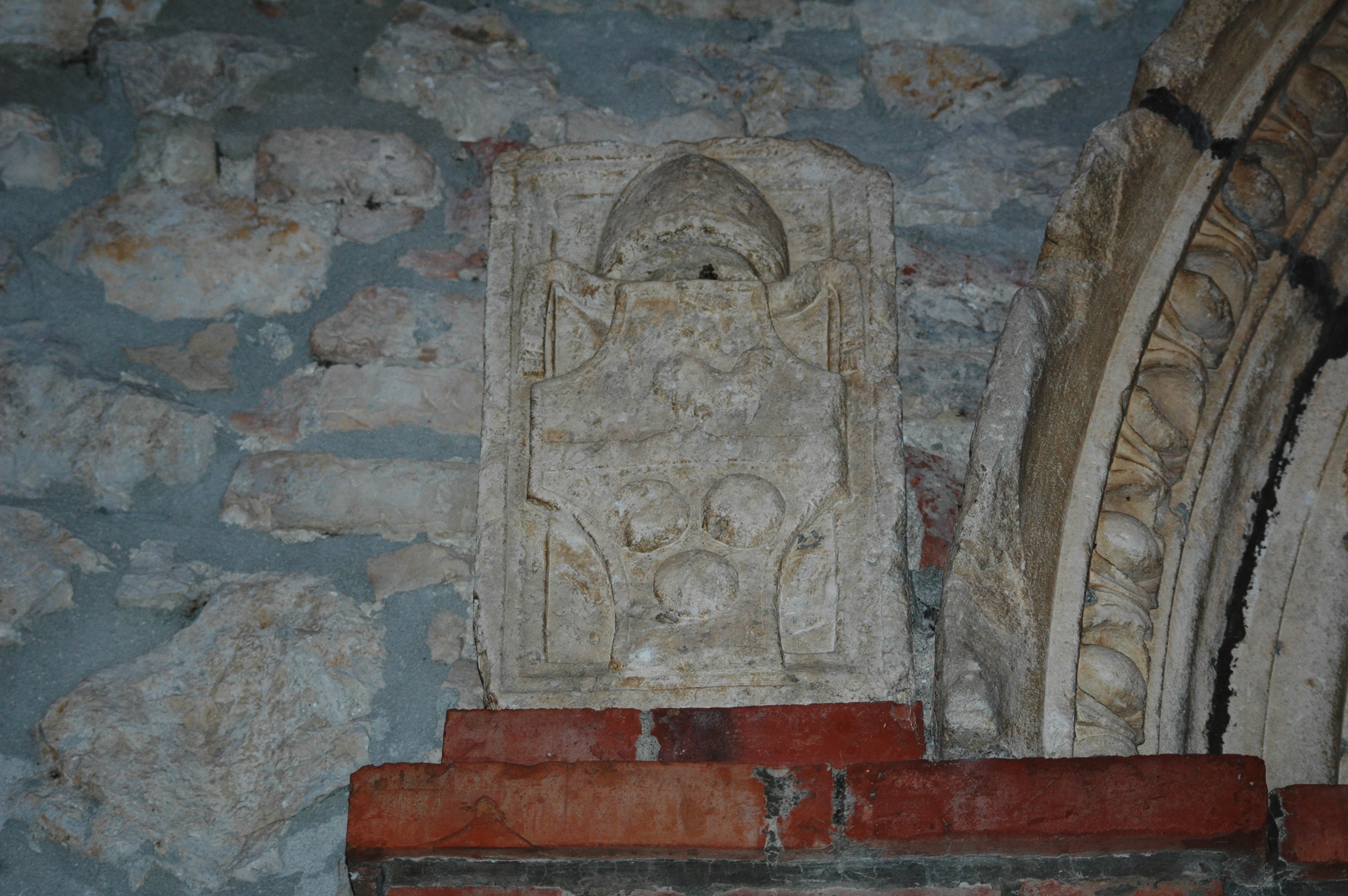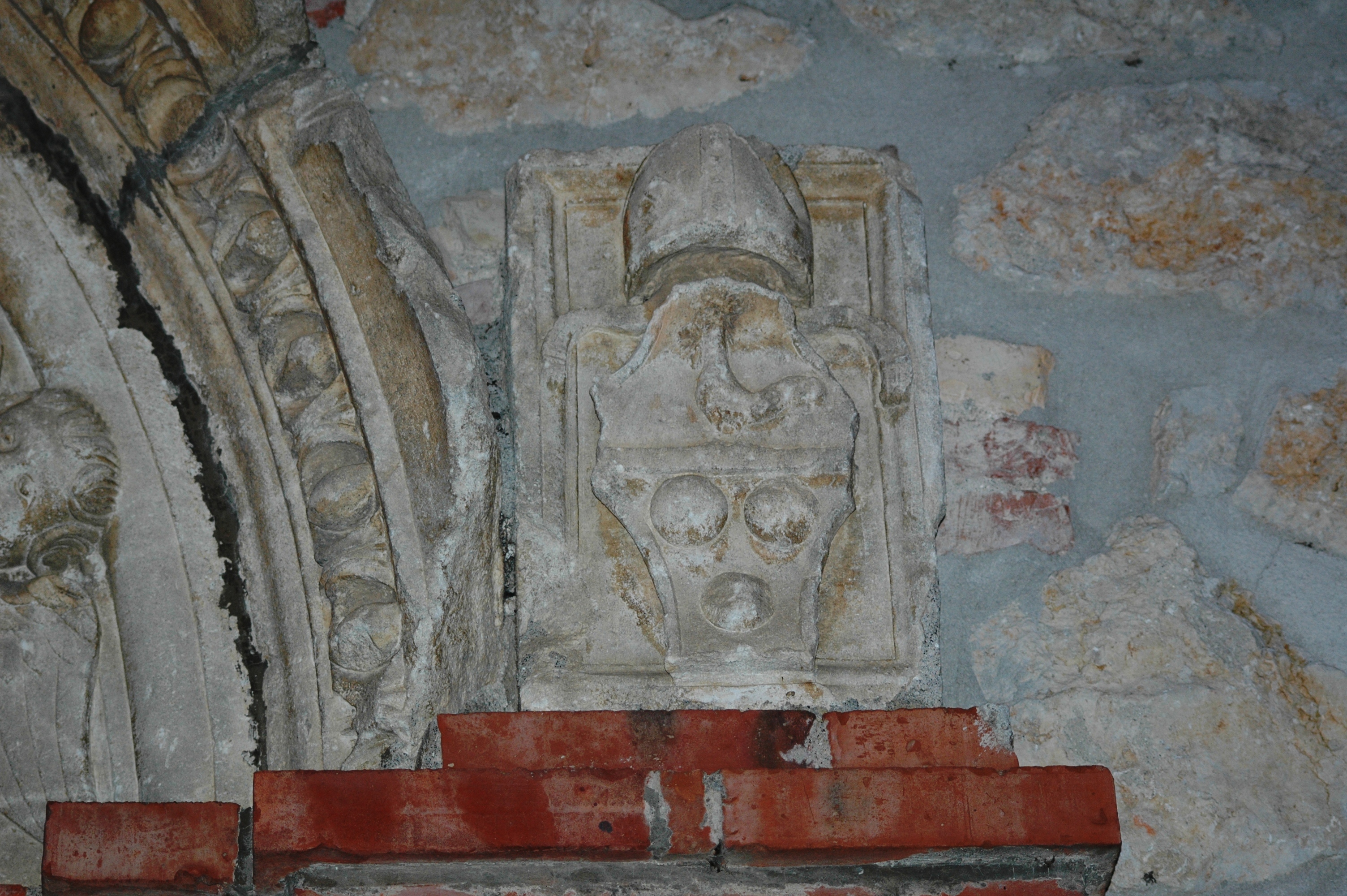 Sulla parete della ex-sagrestia sono state rimurate anche le lastre marmoree raffiguranti gli stemmi araldici delle famiglie patronali della chiesa. Tra essi figura quello della famiglia Maccafani, comprendente nella parte alta un gallo crestato e nella parte inferiore tre palle disposte a triangolo. L’altra insegna raffigurante la stella nascente tra due colline forse fu dei Crescenzi, di nobile prosapia romana. Infine v’è l’arma gentilizia di casa Colonna.