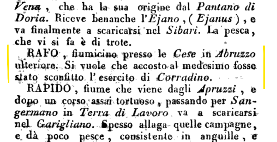 C’è inoltre da annotare che nel “Dizionario Geografico-Ragionato Del Regno Di Napoli” del Giustiniani viene riportato un riferimento al fiume “Rafo” come “fiumicino presso le Cese in Abruzzo ulteriore. Si vuole che accosto al medesimo fosse stato sconfitto l’esercito di Corradino”.