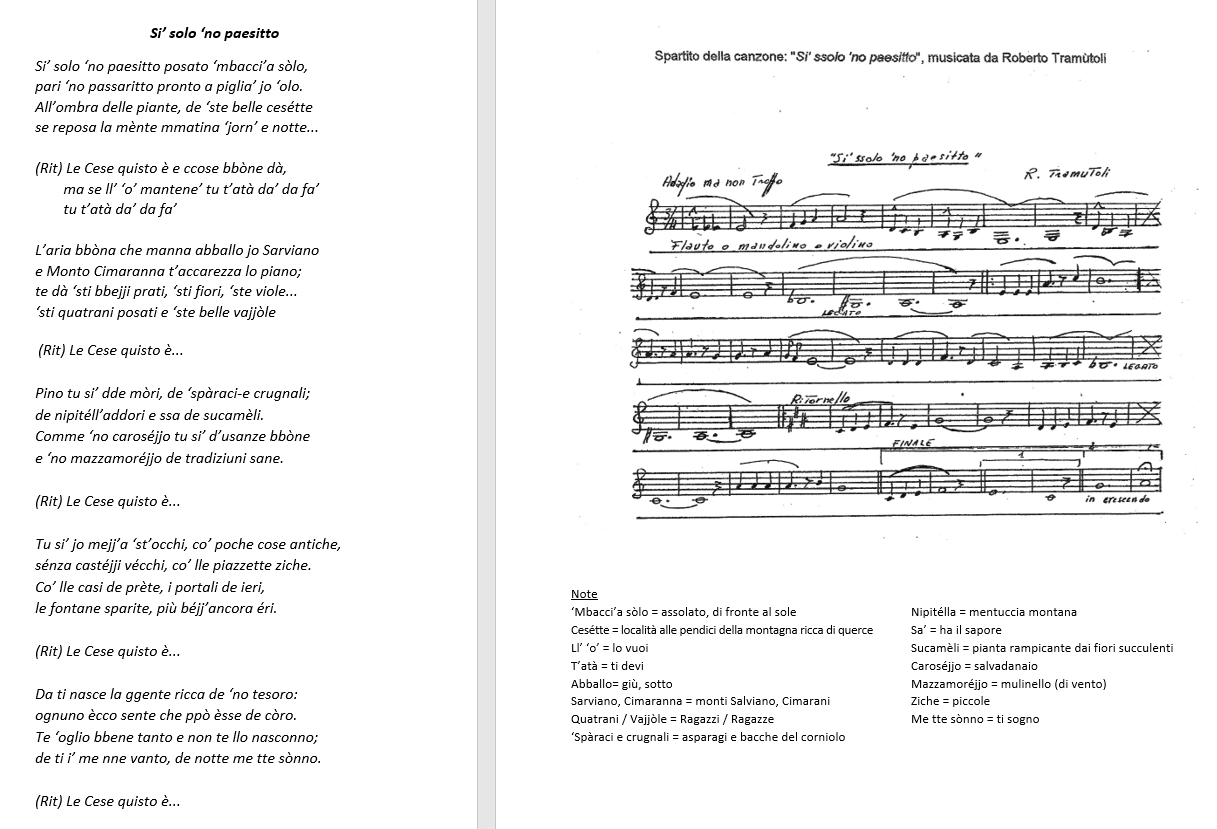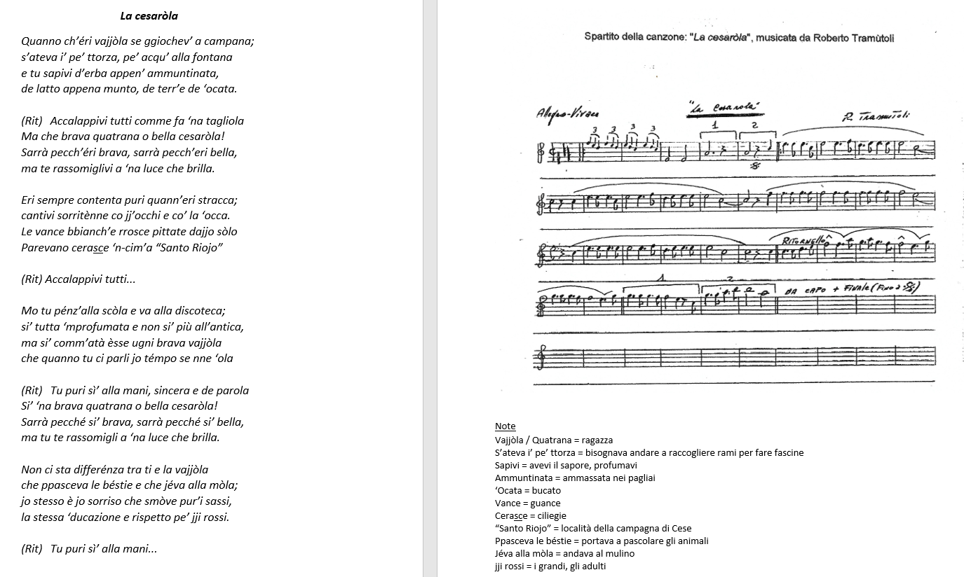 Dei brani relativamente recenti (ma che hanno superato i 30 anni di età) esistono anche partiture musicali composte da diversi maestri. I due testi noti ai più sono stati scritti da Osvaldo Cipollone intorno alla metà degli anni ’90 e pubblicati nel 1997 nella raccolta di brani, poesie, aneddoti e racconti storici dal titolo “Angeli co’ jji quajji”. Si tratta di due brani in dialetto cesense: “La cesaròla” e “Si’solo ‘no paesitto”. Nel primo si esaltano le virtù delle ragazze locali, ricordando le attività e le usanze del passato per poi concludere che anche le ragazze “moderne” conservano le medesime qualità morali e gli stessi valori di un tempo. Il secondo si sofferma sulle bellezze paesaggistiche e naturali del luogo, richiamando alla necessità di conservare il paese attraverso l’impegno personale. I brani sono stati eseguiti per la prima volta a metà anni ’90 da diversi cori locali (alcuni formati da adulti e ragazzi, altri solo da giovani) all’interno di manifestazioni popolari svoltesi a Cese in occasione di presentazioni di libri o rassegne artistiche. Si riportano i testi e gli spartiti originali di entrambi; la musica è opera del maestro Roberto Tramutoli.