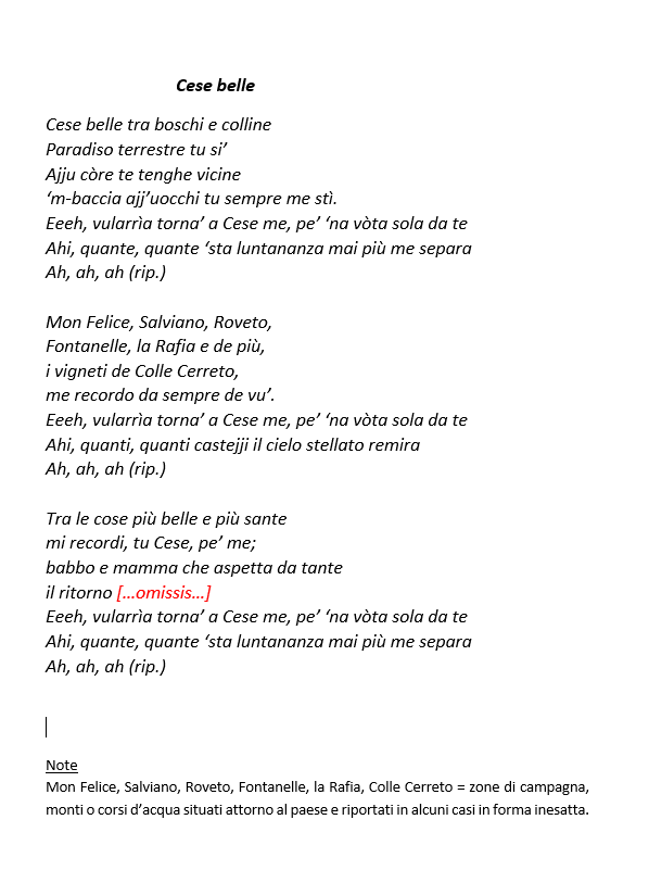 [1] Si possono citare a titolo esemplificativo: “ajju còre” anziché “ajjo còro” (“al cuore”); “me stì” anziché “me sta’” (“mi stai”); diverse forme verbali e avverbiali con vocale finale “e” (“tenghe”, “quante”, “tante”) anziché tronche o con finale “o”; uso diffuso della “u” all’interno di termini che in dialetto cesense prevedrebbero la “o” (“uocchi”, “vularrìa”, “luntananza”).