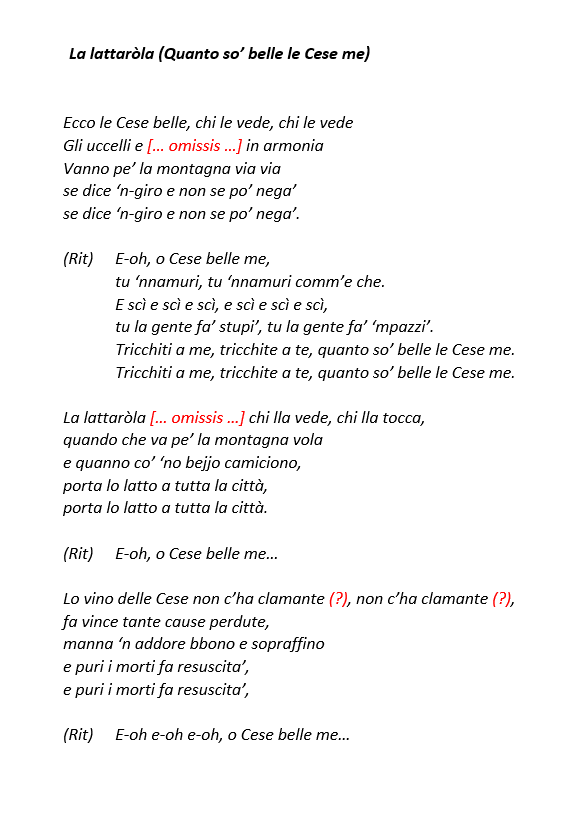 Un altro canto storicamente interessante è quello nel quale viene citata la “lattaròla” che “quando va alla montagna vola…”. Si tratta, come noto, della figura della lattaia, che già negli anni ’30 del secolo scorso raccoglieva il latte in paese per poi raggiungere la cittadina di Avezzano (superando a piedi il Monte Salviano con il carico sulla testa) per rivendere il prezioso prodotto presso i propri clienti. Il brano rappresenta non solo un omaggio a questa figura, ma anche alle qualità del paese, tra le quali trova spazio anche il vino locale, al tempo molto apprezzato nella zona. Il ritornello contiene diverse forme vocali riempitive (“e-oh”, “e scì”, “tricchite”) e chiude la celebrazione del luogo con la frase “quanto so’ belle le Cese me’”. Sulla paternità del brano non esistono notizie certe; secondo alcune fonti, sarebbe stato composto da una maestra, la signora Carli dell’Aquila, che ha insegnato a Cese attorno agli anni ’30 del ‘900, periodo in cui fu plausibilmente eseguito per la prima volta. L’ultima esecuzione di cui si ha traccia è del 1994, all’interno di una rassegna artistico-musicale svoltasi in paese, quando il brano è stato cantato da un gruppo di 7 anziane. Le stesse al tempo hanno eseguito un altro brano molto datato di cui non si conosce paternità né origine esatta; il canto, dal titolo “Le quattro stagioni di Cese”, è l’unico noto in lingua italiana e descrive l’avvicendarsi delle stagioni attraverso le attività tipiche della campagna e delle persone del luogo. Quella del 1994 è l’unica esecuzione ad oggi conosciuta.