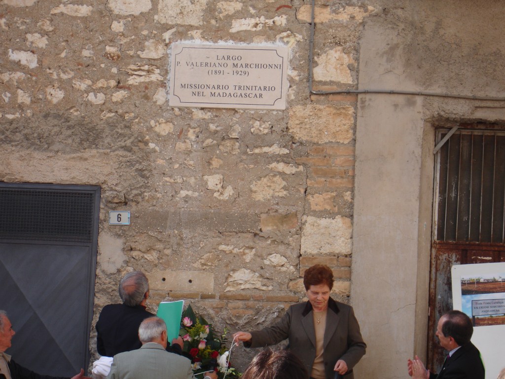 “Ha fatto della sua vita come un ferro …”, così si legge nella lapide murata sulla tomba monumentale di Padre Valeriano Marchionni a Soavinandriana. Ordinato Sacerdote Trinitario nel 1925 insieme al fratello Padre Ignazio, dopo neanche un anno era partito Missionario in Madagascar approdando lì il 2 agosto 1926. Fu mandato solo a Soavinandriana, Diocesi di Miarinarivo, nel centro del Madagascar, percorrendo quella che ancora oggi è una strada stretta, battuta, dissestata, polverosa in una terra rossa, arida, stepposa. Per quasi tre anni è stato solo ad evangelizzare con grande fede, forza e volontà. Dalla sua corrispondenza si è potuto dedurre che è stato un lavoro meticoloso, faticoso ed estenuante, portato avanti visitando tutti i villaggi del distretto; tanto che il Nunzio Apostolico scriveva al Padre generale dell’Ordine: “I suoi religiosi hanno un solo difetto, quello di non curarsi della salute”. Infatti non si è fermato di fronte a nessun ostacolo, non ha pensato alla sua salute quando, malato, fu chiamato a salvare un altro malato, prendendo freddo e acqua che gli procurarono una broncopolmonite e gli tolsero la vita; era il 15 aprile 1929. Per il distretto di Soavinandriana è un Martire, un Santo; non solo per l’ultimo atto eroico, ma per una vita consumata per loro, piena di bontà, di solidarietà, di altruismo. “Ha fatto della sua vita come un ferro (arnese) perso per salvare un malato…”; un arnese, uno strumento che gli altri hanno usato, adoperato per loro; la sua vita non era sua, era per gli altri, per loro. Il suo corpo è sacro, la sua tomba è un monumento meta di preghiera e venerazione. Soavinandriana non permetterà di portarlo via, neanche ai PP. Trinitari che ora non sono più nel distretto.