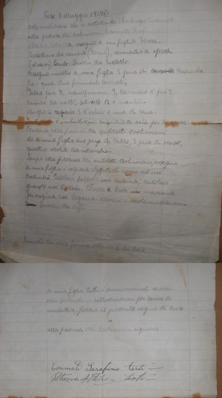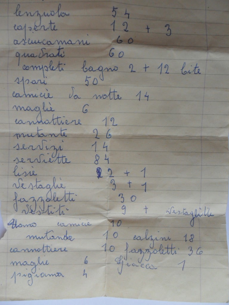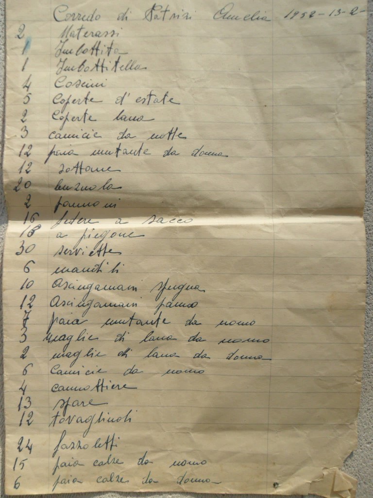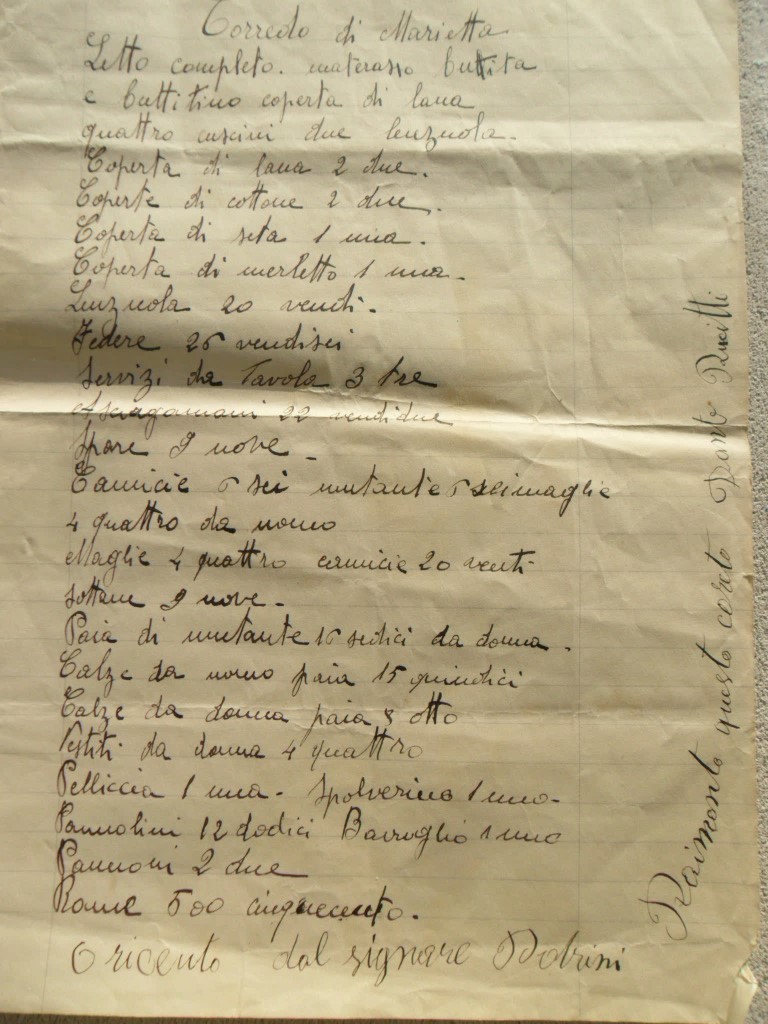 Secondina Marchionni: «Na ‘òta che jo corredo era pronto, se occupevano tutte le stanze pe’ espone j’apprézzo e fajjo vede’ alla gente. Ci potevano i’ puri j’atri a curiosa’, ma non quanto se faceva la “conta”. Jo spuso veneva co’ la famiglia, ma la più ‘nteressata era la mamma. Se non la teneva, ci jeva ‘na zia o la cognata più anziana. I’ che sò’ stata la prima a sposàreme, sò’ ita a quasci tutte le cognate, ma ‘nzémmia co’ la socera. Lòco se conteva tutto e ugnuno scriveva sopri ‘no fóglio i pézzi. Tu penza che a mmi, mamma m’ha fatto scrive pe’ ffino jo zinalo, la spara, l’ombrella, tutto. Na ‘òta fenito j’apprézzo, se faceva la cena. Dóppo se sparecchieva e se metteva tutto dentro le casce. La conta se faceva pe’ appunta’ e testimonia’ la dote. Siccomme che ajji maschi ci sse devano le fabbriche, alle femmone ci devano jo corredo pe’ compenza’ e giustifica’. Pe’ questo se segneva tutto: ‘no matarazzo, quattro coperte, dièce linziòla, ddudici assucamani, ddudici spari, quest’ e quest’ atro… La sòcera poteva dice puri: “E, ma solo ‘ste poche linziòla ci sta’ ffa’ porta’?… Ma ‘sta coperta non te pare tróppo fina? Comm’è che all’atra figlia ci si ffatta la machina da coscì e a questa no’?”. ‘Ne succedevano de commèddie…».