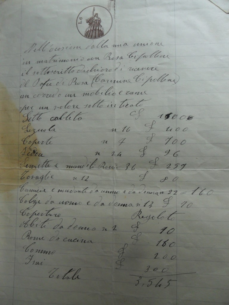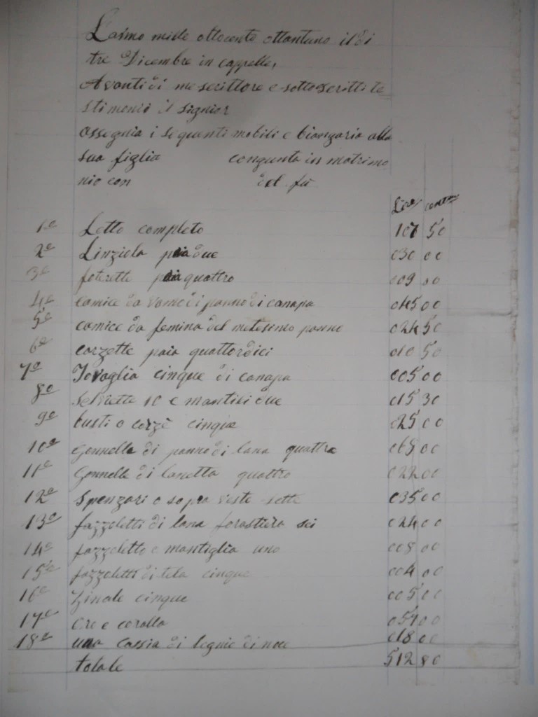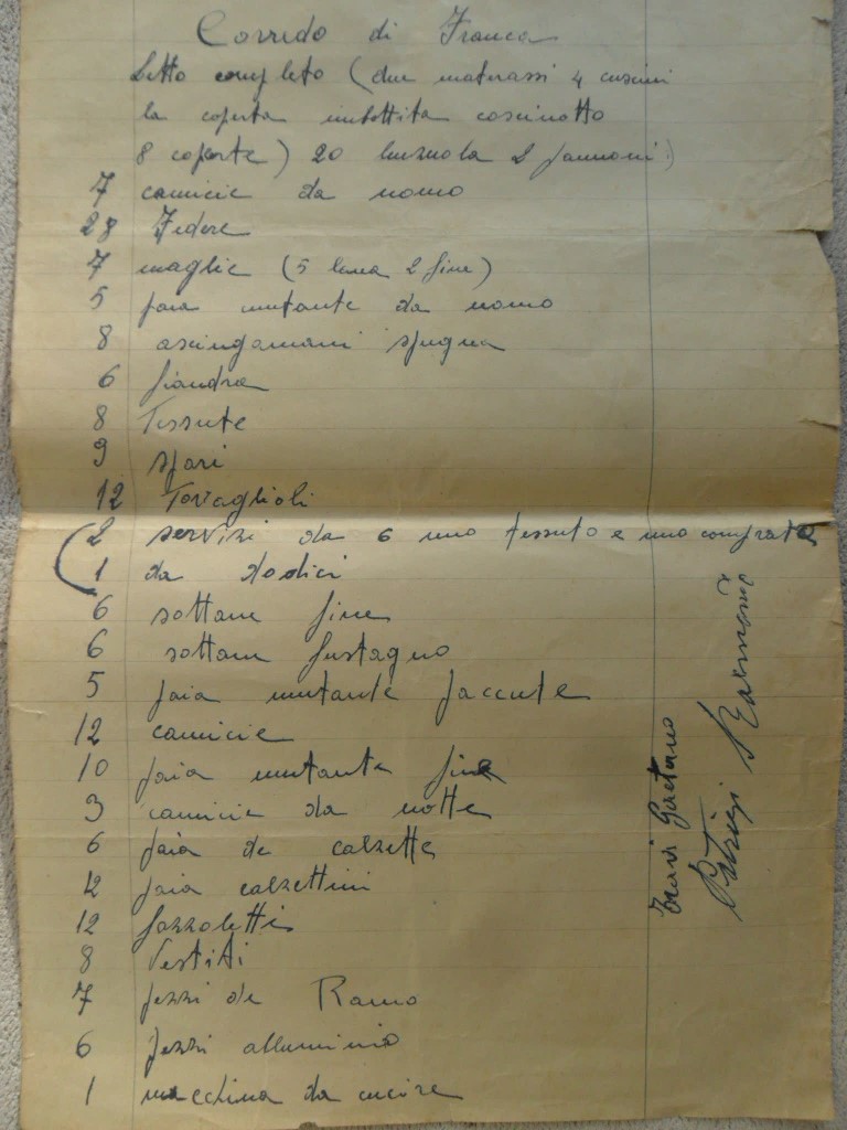 Negli elenchi si riportavano numero e valore della biancheria, degli oggetti da cucina e della mobilia che veniva concessa dai genitori alle figlie. Persino gli elementi di modesto valore come “i pannuni” trovavano spazio sulla nota. La lista serviva per due scopi: “fermare” il valore dei capi donati e documentare quanto dato alla sposa, anche a beneficio degli altri fratelli e sorelle che avrebbero così potuto avere un opportuno riscontro in seguito. Ogni lista, inoltre, elencava anche gli indumenti relativi allo sposo che erano a carico della sposa. In epoche remote, la sposa omaggiava la suocera con un indumento di uso pratico, il tipico “zinalo” che poteva essere di raso o di altra stoffa. Per il futuro marito, invece, sceglieva la camicia da indossare durante la cerimonia, e gliela donava quando riceveva l’abito da sposa e la sottoveste. La suocera, fra l’altro doveva regalare alla nuora un vestito da utilizzare la domenica successiva al matrimonio. Era quello che avrebbe indossato nell’occasione di “rescì’ spósa”. Lo sposo, oltre alla casa, doveva provvedere alla struttura del letto, alle reti, “ajjo pagliariccio”, “ajjo pèto dejjo baccilo”, alla brocca e al vaso da notte. In pratica, aveva l’onere di procurare elementi e suppellettili della camera da letto.