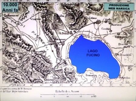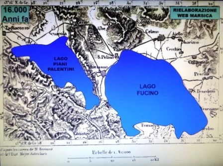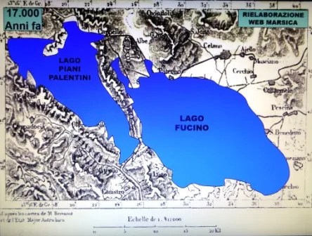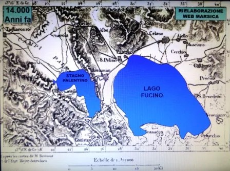 Secondo gli speleologi il lago era molto più grande di quanto non si pensasse e comprendeva sicuramente i Piani Palentini, quindi la sua ampiezza era almeno di 22.000 ettari circa […]. La conferma di questa teoria è la presenza tra Alba Fucens, Massa d’Albe e Forme di profonde cavità scavate da fiumi e torrenti portanti, in epoche molto remote. In cima al monte Salviano sono stati trovati reperti e pietre con concentrazioni di conchiglie, a significare che il lago raggiungeva il livello sino alla sommità. La gola ove sorge Capistrello, lo affermano alcuni geologi, non avrebbe quella configurazione senza pensare all’opera di scavo delle acque del lago quando le medesime traboccavano e tracimavano dalla sede naturale.