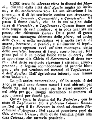 CESE terra in Abruzzo ultra in diocesi dei Marsi, distante dalla città dell’Aquila miglia 20 incirca, e dal mediterraneo 80. La sua situazione è in pianura, e il di lei territorio confina con Avezzano, Cappelle, Scurcola, Corcumello e Capistrello. Vi passa il fiume Imele, che ha la sua origine dalle terre di Verrecchie, e Tagliacozzo. Questo fiume nel solo tempo di està produce, e in poca quantità un pesce, che chiamano Lasca. Dalla parte di greco tiene una montagna chiamata delle pietre, ed anche delle Cese, e nella medesima vi è molta caccia di starne, beccacce, e pernici, e similmente di lepri. Dalla parte opposta evvi un’altra montagna detta delle grottelle, boscosa di faggi, aceri, leccine. Nel piano poi vi è un picciol bosco tutto di cerri, che si appartiene alla Chiesa di Santamaria di detta terra. Dal detto territorio ricavano i cittadini grano, granone, e legumi soprabbondanti al proprio bisogno, che poi vendono nei mercati di Tagliacozzo, e dell’Aquila. Dall’agricoltura infuori, non hanno altra industria.