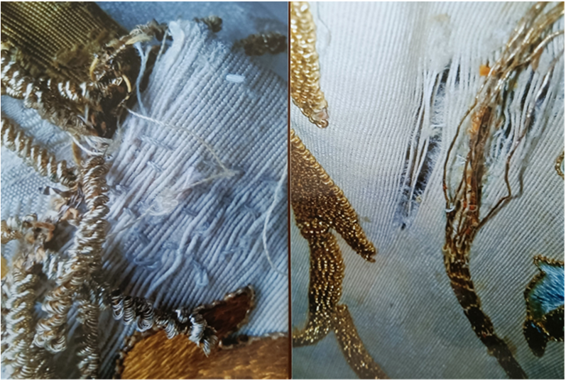 (In foto: dettagli delle condizioni pre-restauro; lo stendardo restaurato)