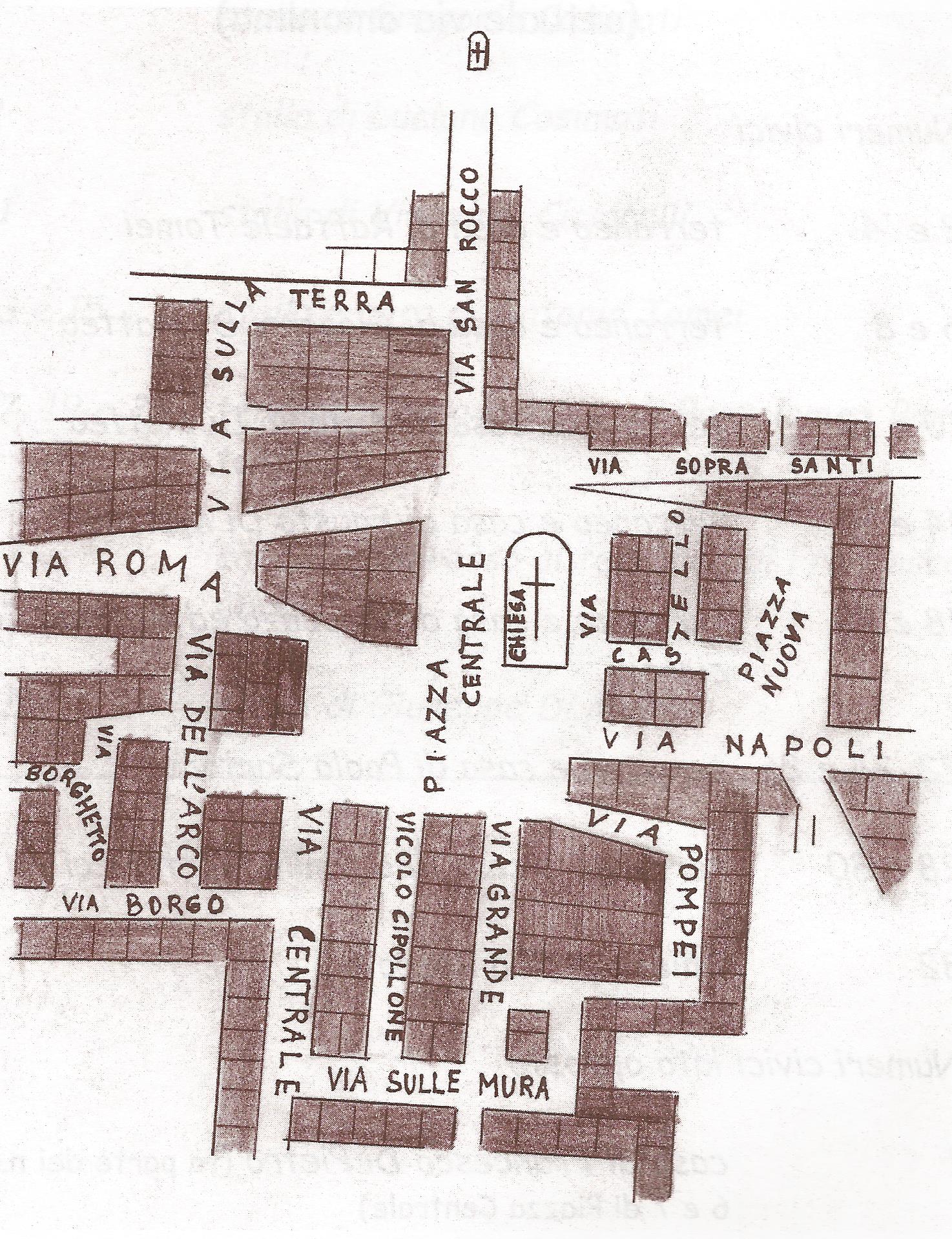 Per quanto riguarda la fonte toponomastica antecedente il terremoto del 1915, è interessante notare che in corrispondenza della citata Via Castello viene specificato che “manca il numero al supporticato della chiesa”, e che nell’antica Via Sopra Santi (attuale via XI Febbraio), al numero 2 è riportata la “casa dell’abate Don Antonio De Angelis (facente parte dei numeri 2 e 4 di Via San Rocco)”. Si può dunque immaginare che il monastero dei benedettini occupasse un’ampia porzione di terreno e che la parte trasformata poi in palazzo vescovile arrivasse fino all’antica Via Sopra Santi. D’altra parte risulta che la torre campanaria, posta pressappoco dove è attualmente collocato il monumento all’alpino, avesse un cunicolo di collegamento con lo stesso palazzo vescovile. O, se volete, con il “castello”.