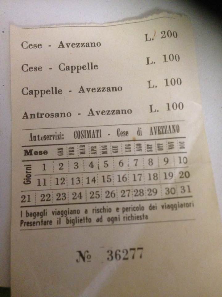 - In relazione al servizio di linea Avezzano-Cese, la delibera risale al 1951; si legge infatti negli Atti del Comune di Avezzano: “Il 28.05.1951 il consiglio deliberava un appalto per i concessionari delle autolinee, fra i quali Cosimati per l’autolinea Avezzano – Cese”. ↩︎