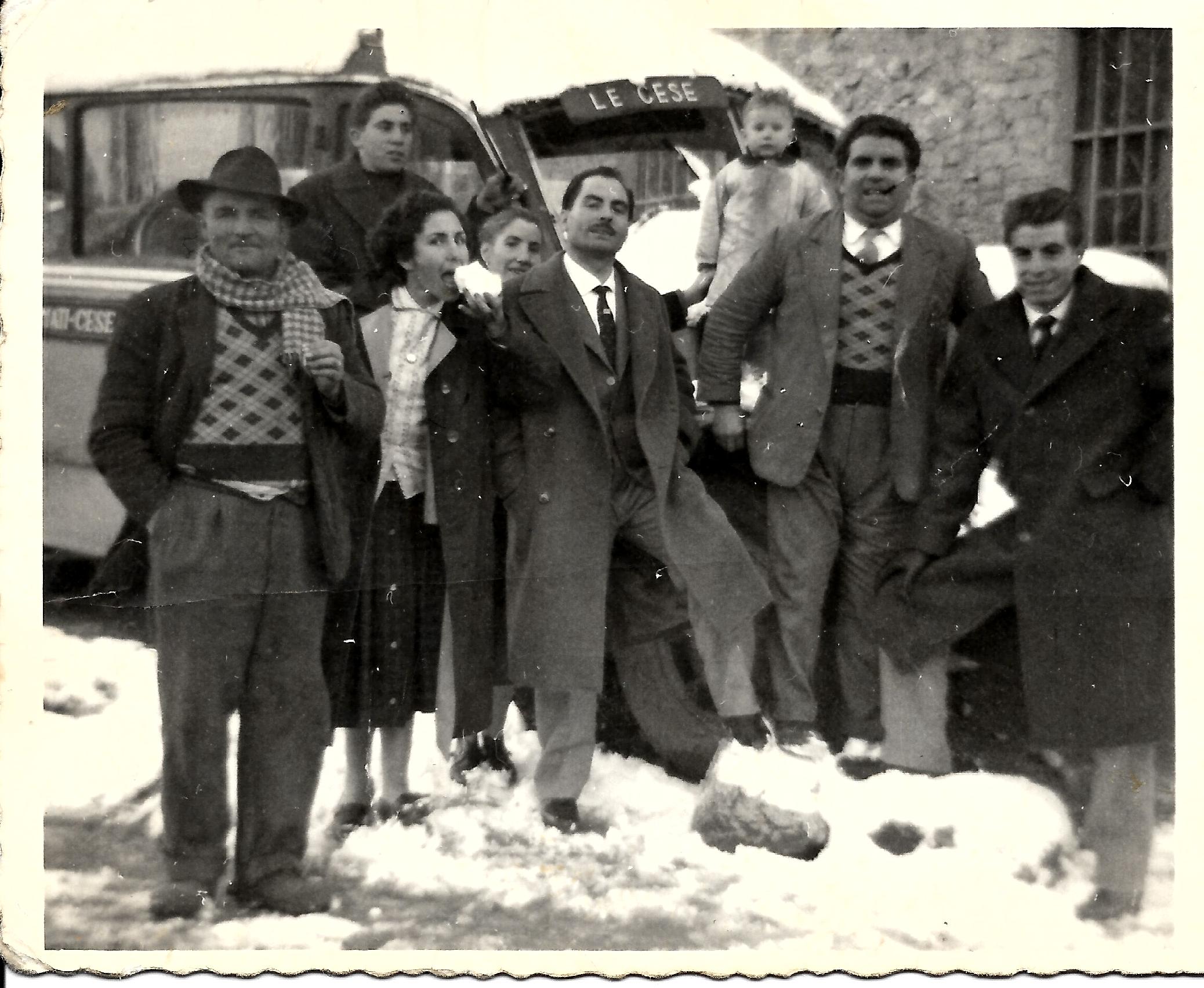 Un’attività cresciuta nel tempo, dunque, che necessitava ovviamente di un’adeguata organizzazione. «Uno degli autobus rimaneva in un garage in affitto ad Avezzano», spiega Maria, «un altro in piazza, nello spazio di nostra proprietà, e il terzo, quello che conduceva Vincenzo, a Santa Lucia». «All’inizio non c’era la rimessa come si vede adesso», specifica Vincenzo, «poi è stato fatto il garage. E la mattina dovevo svegliarmi ancora prima per cominciare a scaldare il motore. Mica c’erano i sistemi di adesso… Si viaggiava senza riscaldamento, e mi ricordo che avevamo una bottiglietta di antigelo per sghiacciare i vetri dall’interno!». Le difficoltà del periodo invernale ricorrono in gran parte delle memorie e degli aneddoti. «Una volta un autobus rimase bloccato al ritorno a Corcumello per la grande quantità di neve», racconta Oreste. «A quel tempo le strade erano bianche, e mica c’erano gli spazzaneve… quindi si dovette aspettare qualche giorno perché si sciogliesse un po’, e poi andarono a liberare l’autobus con qualche trattore». «Nel periodo invernale papà si svegliava di notte per andare ad avviare l’autobus in piazza», ricordano Maria, Rosanna e Iride «e doveva accendere un braciere sotto al motore per scaldarlo un po’. Per metterlo in moto a volte era necessario avviarlo in discesa verso l’Ara, con la strada che non era ancora asfaltata; all’Ara faceva inversione e risaliva in piazza per caricare». Maria ricorda inoltre che come officina veniva utilizzata quella che si trova ancora oggi su via Roma, all’ingresso di Avezzano. «In più c’era un accordo di reciprocità con gli altri gestori (Micangeli, Liberati, Passalacqua…), in caso di indisponibilità di un mezzo». «Tra di noi ci si aiutava», conferma Vincenzo. «Ricordo che una volta un autobus di Passalacqua aveva i tergicristalli rotti e doveva arrivare giù nella Valle Roveto in una giornata di pioggia fortissima. Insomma passò qui a Cese, si prese un autobus dei nostri, caricò i passeggeri e così poté proseguire, lasciando il suo autobus qui».