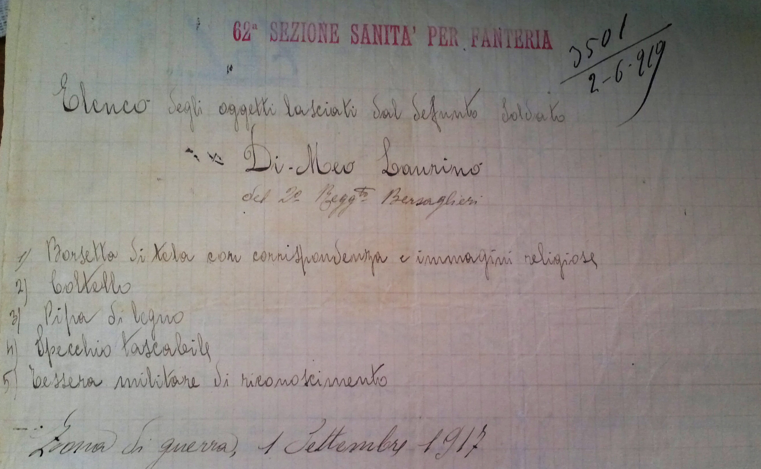 Neanche su Lauro Di Meo si hanno molte notizie. Si sa che era figlio di Domenico De Meis e di Rosa Barbarossa; infatti nell’albo d’oro dei Militari caduti nella Grande Guerra è riportato come “De Meis Laurino”. Tuttavia non c’è dubbio che si tratti della stessa persona poiché coincidono sia i genitori che il luogo e la data di nascita e di morte (il 31 agosto del 1917, “in seguito a ferite”). Alla sua morte, la 62a Sezione di sanità inoltrò al Comune di Avezzano la lista di oggetti appartenuti al soldato e successivamente inviati alla famiglia: “borsetta di tela con corrispondenza e immagini religiose”, un coltello, una pipa di legno, uno specchio tascabile e la tessera militare di riconoscimento.
