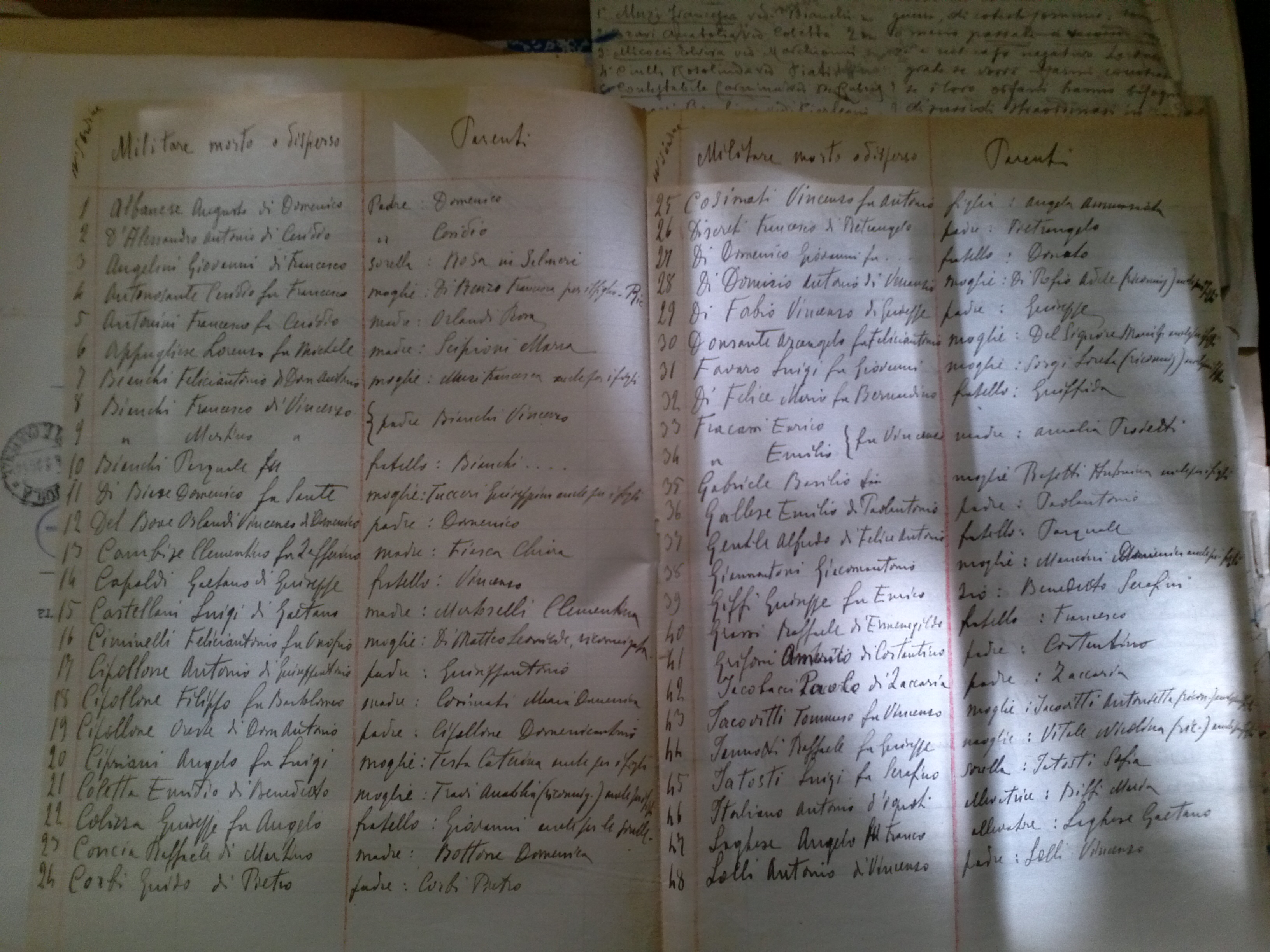 È proprio la dimensione umana a rendere queste storie straordinarie e intime al tempo stesso. Una dimensione che si affianca e si fonde con quella popolare, con quella sorta di fatalismo che ne accompagna ancora il racconto. È morto in guerra, punto. Perché la guerra, come le calamità, arrivava quando voleva, e non c’era modo di governarla. La preghiera, quella solo rimaneva. Nella stessa dimensione popolare rientrano anche quegli aspetti di tradizione familiare che, nel tempo, sono diventati tracce scritte. Mi riferisco soprattutto alla diffusa consuetudine, più volte incontrata, di ricordare i nomi dei Caduti nei nuovi nati della famiglia, con i quali si “rallevavano” i cari morti in guerra. È sicuramente questo uno degli aspetti più interessanti (e a tratti quasi sorprendenti) della ricostruzione genealogica legata ai diversi nominativi. In almeno 20 casi, infatti, si può individuare lo stesso nome del Caduto tra i discendenti diretti o tra i familiari. Un modo naturale, doloroso e assieme sentito, di non dimenticare quei cari morti troppo giovani.