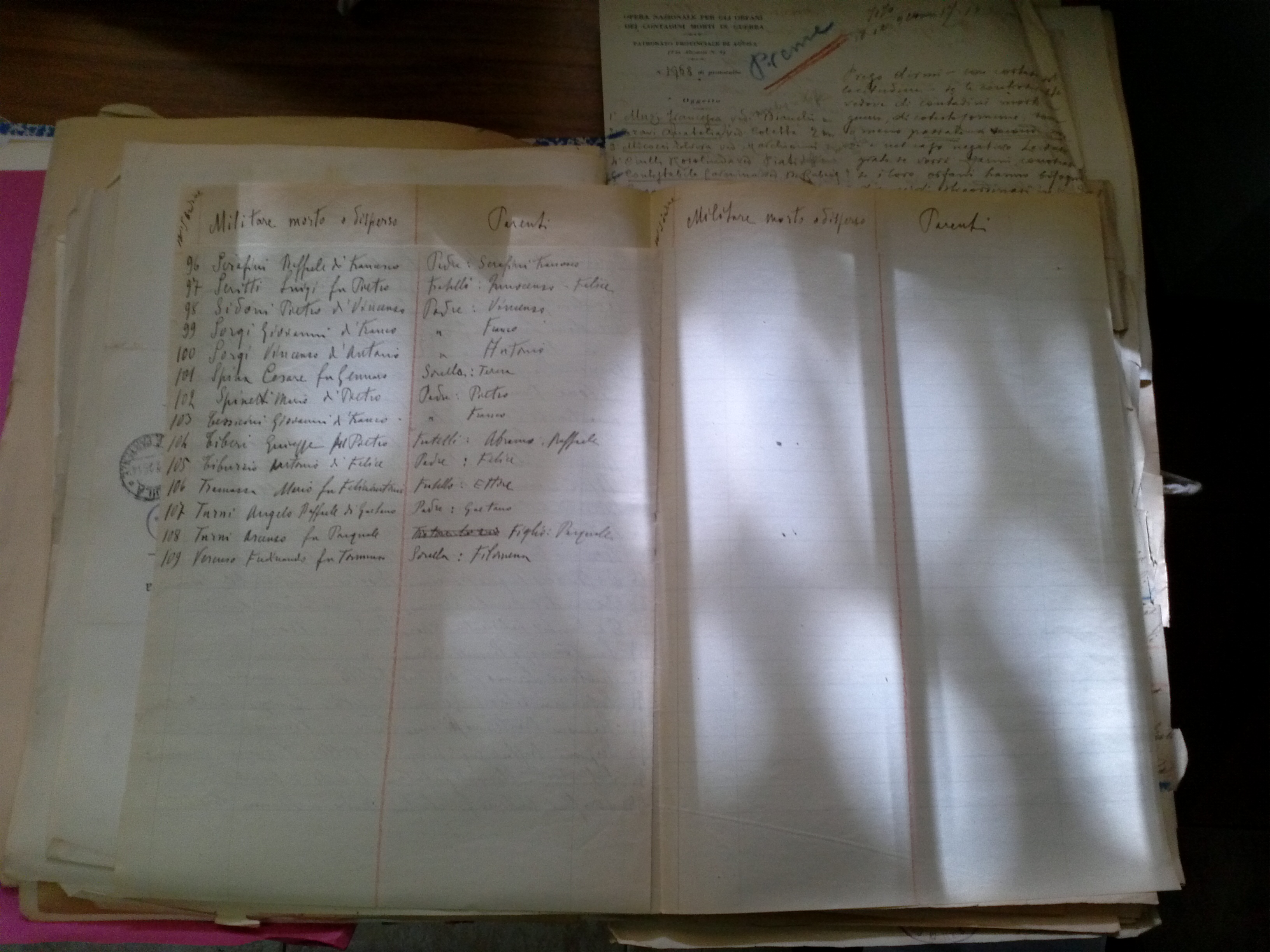 “Elenco dei Militari della frazione Cese morti in guerra”, documento ritrovato nell’archivio comunale di Avezzano e relativo ai soli Caduti della Prima guerra mondiale. Nell’elenco non sono riportati i nomi di Antonio Nuccetelli e Sabatino De Sperdutis, nativi di altri Comuni, e di Federico Marchionni, arruolato nell’esercito americano. Essendo il documento dei primi anni ‘20, mancano ovviamente tutti i Caduti della seconda guerra mondiale.