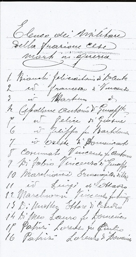 I primi tre nomi dei diciannove riportati nell’elenco avevano un legame familiare molto stretto. Francesco e Martino Bianchi erano infatti fratelli, e cugini diretti di Felice Antonio Bianchi (chiamato Felice “j’appardadόro”). Su di loro non sono rintracciabili molte notizie. Si sa solo che Francesco Bianchi morì il 6 luglio 1916 sul monte Zebio, a soli 20 anni, per ferite riportate in combattimento. Martino fu invece fatto prigioniero a Pradamano, nel Friuli, e morì per malattia pochi mesi dopo la cattura, il 26 gennaio 1918, a Francoforte sull’Oder; aveva 32 anni. Pochi mesi dopo, il cugino Felice fu fatto rientrare in Italia del fronte balcanico, e ricoverato presso l’ospedale di Sulmona, perché colpito da arma da fuoco alla schiena, con danni rilevanti ad un polmone. A Sulmona sarebbe poi morto il 14 giugno 1918, lasciando a neanche 30 anni una moglie e quattro figli (Pasqua, Giacomo Vincenzo, Domenico Antonio e Rosamata).