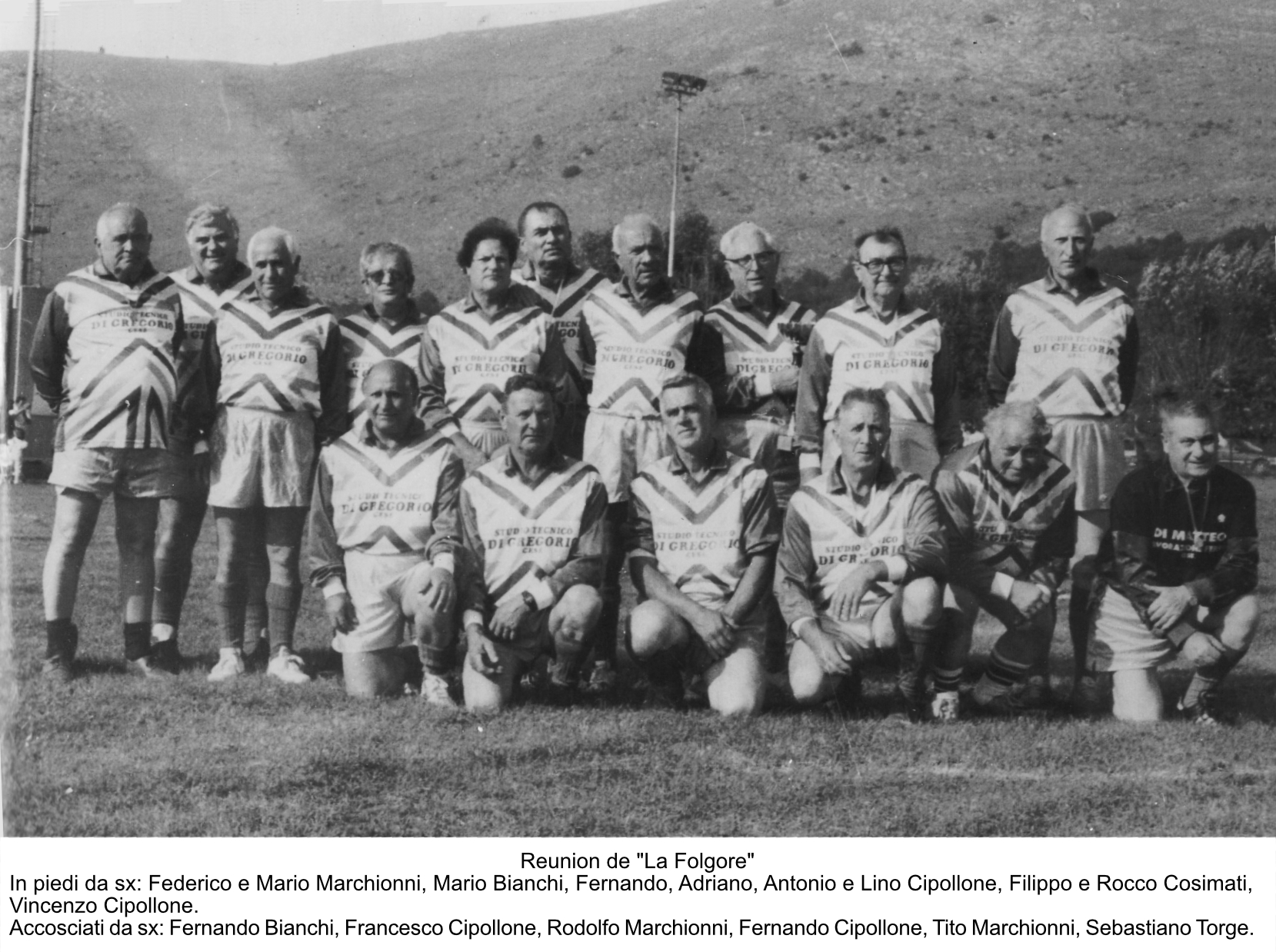 Tuttavia, la squadra ufficialmente riconosciuta come prima in ordine cronologico, in quanto disputava incontri (senza esclusione di colpi) con i tanti paesi del circondario, si chiamava “La Folgore”. È relativo a questo gruppo il primo documento fotografico conosciuto. Ne facevano parte (da sinistra con riferimento alla foto): Sebastiano Torge (professore, portiere), Vincenzo Cipollone (diacono), Mario Bianchi, Antonio Cipollone (professore), Adriano Cipollone, Fernando Cipollone (“Boniperti”), Francesco Cipollone (de ‘Rientale), Giuseppe Di Fabio, Vincenzo Petracca (di Attilio), Tito Marchionni, Fernando Bianchi. Sebbene non compaiano nella foto, in origine facevano parte della squadra anche il maestro Cassetti e Lino Cipollone (veterinario), che fungeva anche da allenatore. Della stessa rosa facevano parte anche altri, a seconda delle esigenze tecniche e delle assenze. Tra questi rientrano: Augusto Torge (Roma), Rodolfo Marchionni, Fernando e Pierino Cipollone (de Palono), Dante Cipollone, Stati, Mario Marchionni, Ughetto Cipollone, Antonio Faonio e via via quelli che crescevano. Vale a dire Fulvio Marchionni, Peppino Rantucci, Raffaele Galdi, Domenico, Isaia e Felice Cipollone… Questa squadra aveva elementi di valore in tutti i reparti e vinceva con facilità contro tutti i paesi del circondario, riuscendo a tenere testa a compagini più blasonate come quelle di Capistrello, di Villa San Sebastiano, di Torano e di Santa Croce. Fu proprio durante una partita contro quest’ultima che successe un episodio increscioso tra gli spettatori; tra l’altro, i nostri giocavano fuori casa ed erano in vantaggio fino a pochi minuti dalla fine. Accadde però un litigio tra un genitore ed il figlio e a quanto pare il padre inferse una coltellata al ragazzo, il quale rimase a terra ma poi fu soccorso e si salvò. Nel parapiglia generale, anche qualcuno dei nostri subì degli affronti, fortunatamente senza grossi danni. La partita venne comunque interrotta e la squadra poté far ritorno a Cese con i propri tifosi a bordo della corriera della ditta Cosimati. Il mezzo solitamente trasportava tutti coloro che potevano permettersi la spesa, mentre gli altri, pur di seguire la squadra, raggiungevano i vari luoghi delle trasferte a bordo di carretti, motocicli e biciclette. Oltre alla prima squadra ce n’era anche una seconda di buon livello, munita di regolare divisa amaranto, pantaloncini e scarpini. Da questa man mano uscivano rimpiazzi per la prima squadra, che vedeva assottigliarsi i propri elementi poiché erano molti coloro che, raggiunta una certa età, si arruolavano nelle forze armate oppure lasciavano il paese per motivi di lavoro.