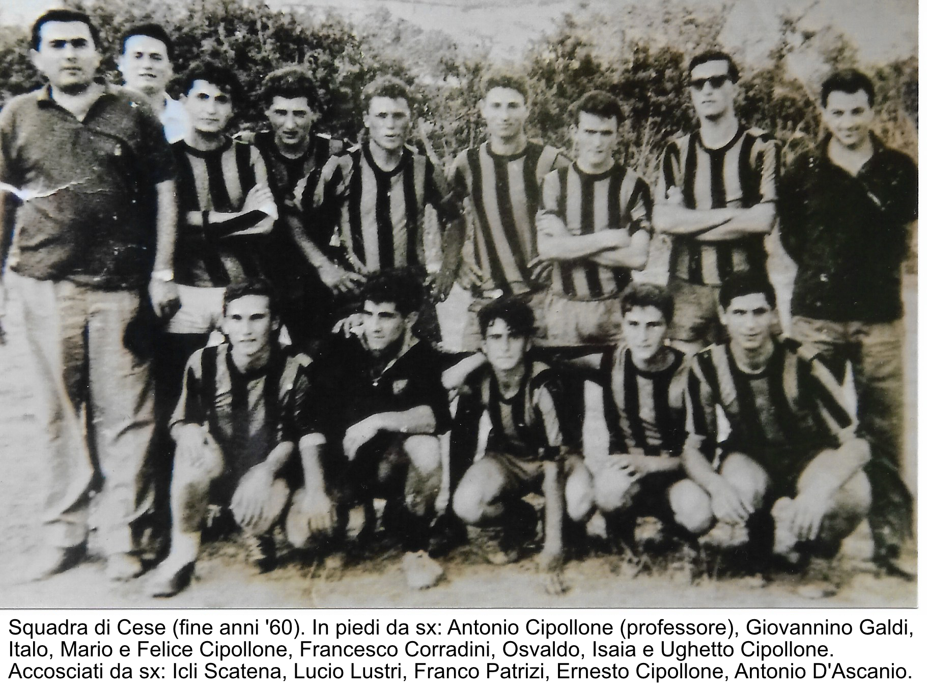 Negli anni a venire ci fu un’altra squadra che fece ben parlare di sé e che, oltre a gareggiare in tutto il circondario, negli anni ’70 si iscrisse ai tornei estivi organizzati dalla Federazione. Dei quattro tornei a cui partecipò, due si svolsero nel paese di Sante Marie, uno a Scurcola Marsicana e uno proprio a Cese. Ebbene quella compagine si aggiudicò le ultime due competizioni, sconfiggendo la Scurcola a casa propria e Cappelle a Cese. Questa squadra era molto seguita sia in trasferta che in casa proprio perché per la prima volta le partite erano dirette da arbitri federali e presiedute in ogni occasione da un dirigente della F.I.G.C. che annotava tutti i dettagli della gara. Inoltre tutte le settimane veniva stilato un bollettino, inviato alle varie squadre partecipanti, in cui erano riportati dettagliatamente l’esito degli incontri, i marcatori, gli espulsi e gli ammoniti, l’andamento sintetico delle partite, la classifica aggiornata e i migliori in campo. I tifosi più accaniti seguivano il gruppo anche in trasferta con macchine, motociclette o bici. La squadra, invece, si spostava a bordo di un pulmino familiare e di pochi mezzi dei tifosi che comunque venivano ripagati da prestazioni convincenti anche quando l’esito degli incontri non era appannaggio del proprio paese. Facevano parte di quella squadra: Dante, Isaia, Osvaldo, Italo, Ernesto, Alfredo e Mario Cipollone (di Maddalena), Giuseppe Di Matteo, Marcello Petracca, Franco e Anselmo Patrizi, Alfonso Marchionni, Francesco Corradini. Ad essi si aggiunsero poi alcuni amici di Capistrello che potenziarono il gruppo nei vari reparti. Si ricordano tra i primi: Icli Scatena, Antonio D’Ascanio e Lucio Lustri (il piccolo grande portiere) e poi Bruno Persia e Fausto Guidoni, tutti partecipanti a tornei regolamentati dalla FIGC, mentre Ulderico Panico (portiere detto “Spago”) giocava nelle amichevoli importanti. In quegli anni gli elementi “esterni” che venivano a giocare a Cese provenivano tutti da Capistrello e non ricevevano rimborsi-spese né pagamenti concordati; la squadra locale beneficiava infatti dei rapporti scolastici e (soprattutto) di amicizia. In origine, e prima che il fratello Alfredo cambiasse ruolo per giocare in porta, era Sergio (di Quintilio) il portiere della squadra; poi però partì per arruolarsi in Finanza e nelle cosiddette partite “inter nos” tra paesi giocavano da portiere anche i vari Giovanni Cosimati, Renzo Cipollone e Cesidio Marchionni. Di sicuro qualche nome risulterà omesso, ma non certo per volontà; i ragazzi che praticavano il calcio erano al tempo tanti e qui si sono riportati i nomi conservati dalla memoria.