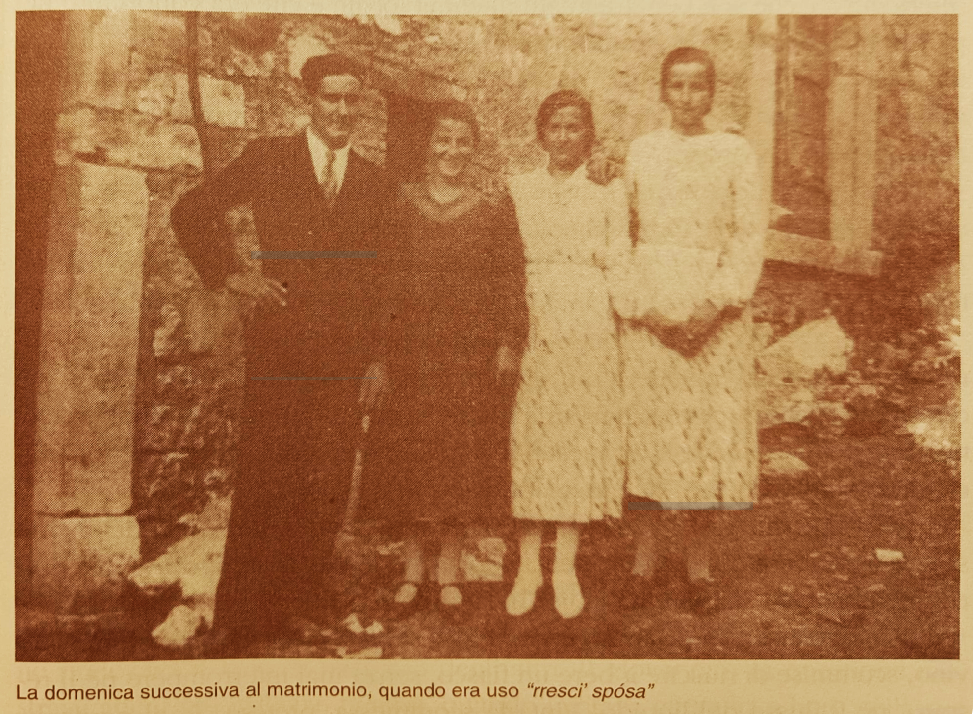 La domenica della “rrescita”, poco prima della messa solenne, due donne della famiglia andavano a prendere la sposa nella nuova abitazione e la accompagnavano in chiesa. Nel condurla in pubblico era come se volessero presentarla alla comunità sotto la nuova veste di moglie. L’appartenenza alla nuova famiglia ufficializzava la subalternità a quella dello sposo. Il rituale “dello rrescì spósa” era anche l’occasione per indossare il vestito o il cappotto avuto in regalo dalla suocera proprio per quel giorno. La suocera, infatti, era tenuta regalare alla nuora un vestito da utilizzare per l’evento. Salutata e riverita da compaesani e parenti, la sposa non rimaneva mai sola. Prima di mezzogiorno si concedeva una breve passeggiata lungo il corso per poi raggiungere la famiglia d’origine. In casa si sarebbe tenuto un modesto banchetto, al quale prendevano parte i familiari più stretti della coppia; si trattava in pratica del primo pranzo tra parenti di sangue ed acquisiti. Dopo quell’occasione, gli sposi avrebbero iniziato il loro cammino di coppia tra riservatezza e, spesso, difficoltà economiche. Avrebbero affrontato così una nuova vita ostacolata di sovente da ristrettezze ma a tratti generosa di soddisfazioni, magari sottolineate dall’arrivo della numerosa, benedetta prole.