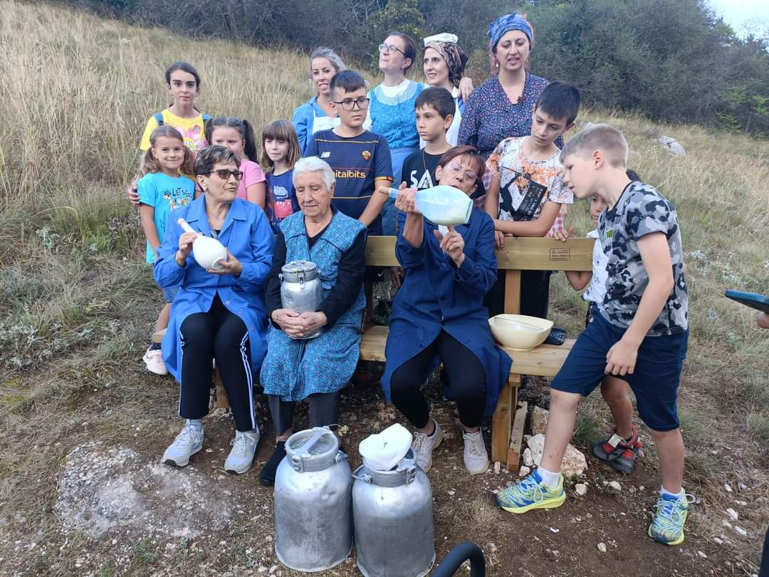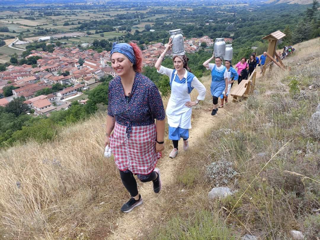 Sostenendo il prezioso liquido sul capo, portavano anche altri due recipienti (di latta) con le mani, mentre percorrevano il sentiero montano. La nuova attività permetteva di raggranellare denaro necessario per gli acquisti particolari, come l’abbigliamento, oppure per allestire il corredo da dare in dote alle figlie. Nel tratto in salita venivano spesso coadiuvate dai familiari, facevano qualche sosta (la prima “alle péschie de Sant’Anna”, ricorda Elena “de Pierina”) e, raggiunta la sommità che costeggia il santuario di Pietraquaria, si fermavano brevemente per proseguire poi il tragitto da sole. A volte qualcuna inciampava lungo il viottolo impervio riportando abrasioni agli arti; in questi casi non sempre il prezioso liquido veniva salvato. Anche la rottura di fiaschi e contenitori, tuttavia, veniva “riparata” dallo spirito di solidarietà e dalla generosità del gruppo. Ognuna si privava di una parte di latte per offrirlo alla sfortunata di turno che, in tal modo, poteva onorare l’impegno quotidiano. Qualche anno fa Esterina, una delle poche lattaie ancora in grado di testimoniare la propria esperienza, ha raccontato che già a 13 anni si sobbarcava di ingenti pesi per recarsi ad Avezzano a vendere il latte porta a porta. Lei, come le altre “lattaròle”, aveva le sue “poste” (i clienti abituali), e spesso capitava che, dopo la fatica e la scalata di tanti gradini dei palazzi, si sentisse dire: “Mi dispiace, ma per oggi ce l’abbiamo, il latte”. Come lei, tutte dovevano affrontare sforzi e pericoli da sole lungo tutta la discesa e, a costo di sbucciarsi mani e ginocchia, erano costrette a proteggere il prezioso liquido in ogni circostanza. Ha anche ricordato che, in un’occasione particolare, verso “Pucetta” un grosso montone le è piombato addosso, facendola cadere con tutto il latte.