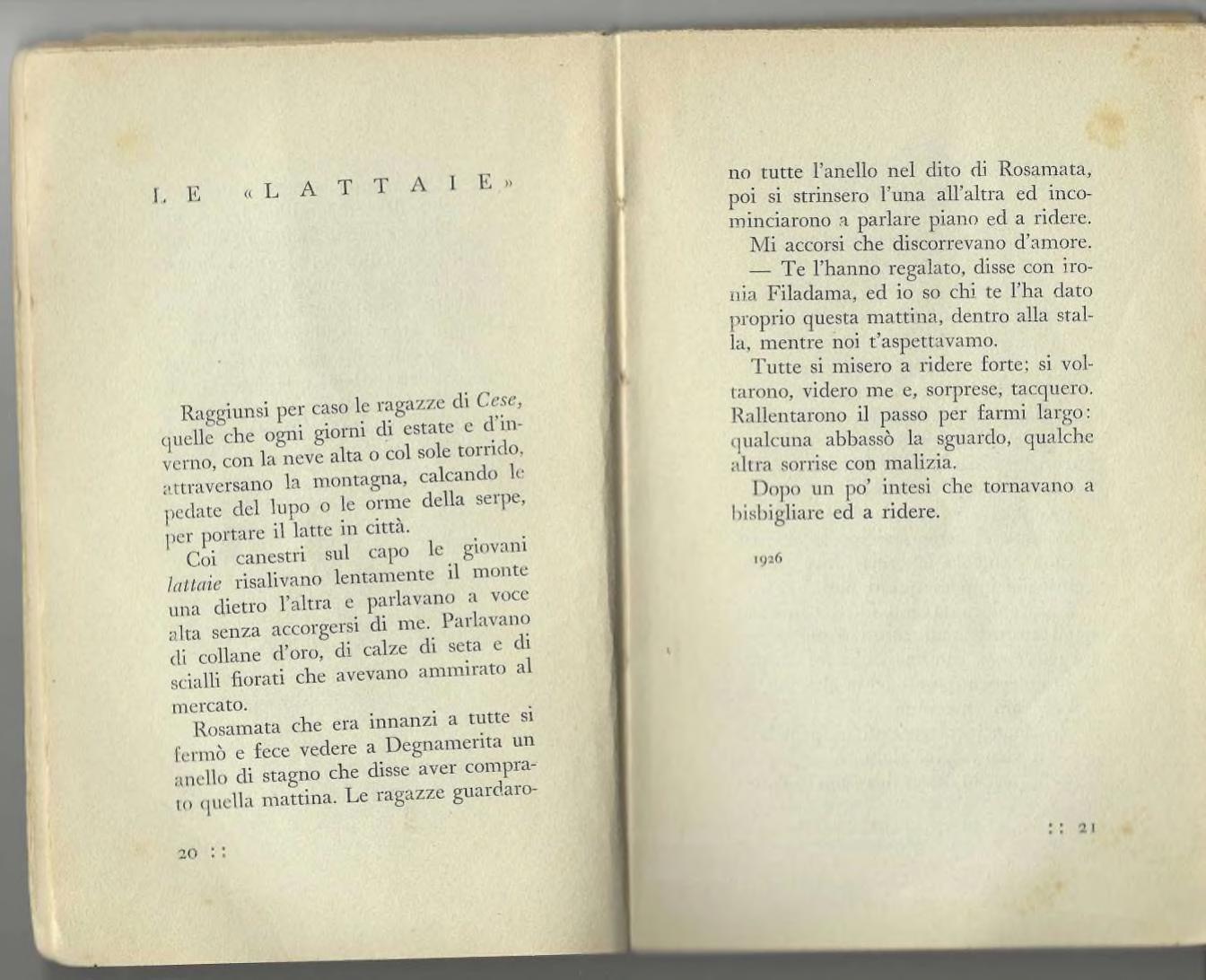 Raggiunsi per caso le ragazze di Cese, quelle che ogni giorno di estate e d’inverno, con la neve alta o col sole torrido, attraversano la montagna, calcando le pedate del lupo o le orme della serpe, per portare il latte in città. Coi canestri sul capo le giovani lattaie risalivano lentamente il monte una dietro l’altra e parlavano a voce alta senza accorgersi di me. Parlavano di collane d’oro, di calze di seta e di scialli fiorati che avevano ammirato al mercato.