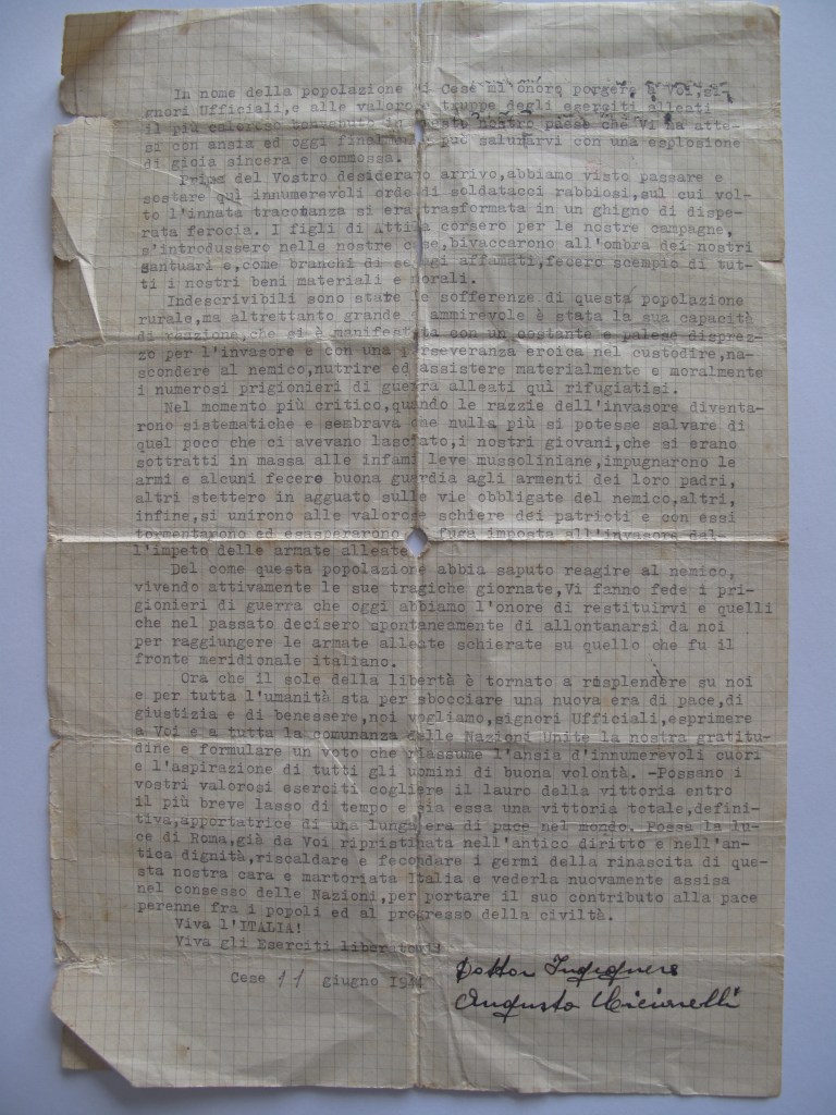 Come riportato nel resoconto delle truppe neozelandesi, in quella circostanza si tenne un discorso pubblico di cui, sempre grazie a Simon Allsebrook, siamo riusciti a recuperare il testo, plausibilmente preparato qualche giorno prima dell’evento (si noti, nel documento originale, l’iscrizione a penna del giorno 11). L’arrivo degli Alleati, d’altra parte, era nell’aria, e tutta la popolazione era in fibrillante attesa. Nell’occasione, il discorso fu tenuto dall’ingegner Augusto Ciciarelli, nominato ufficiale di governo a Cese circa un mese prima[3]..