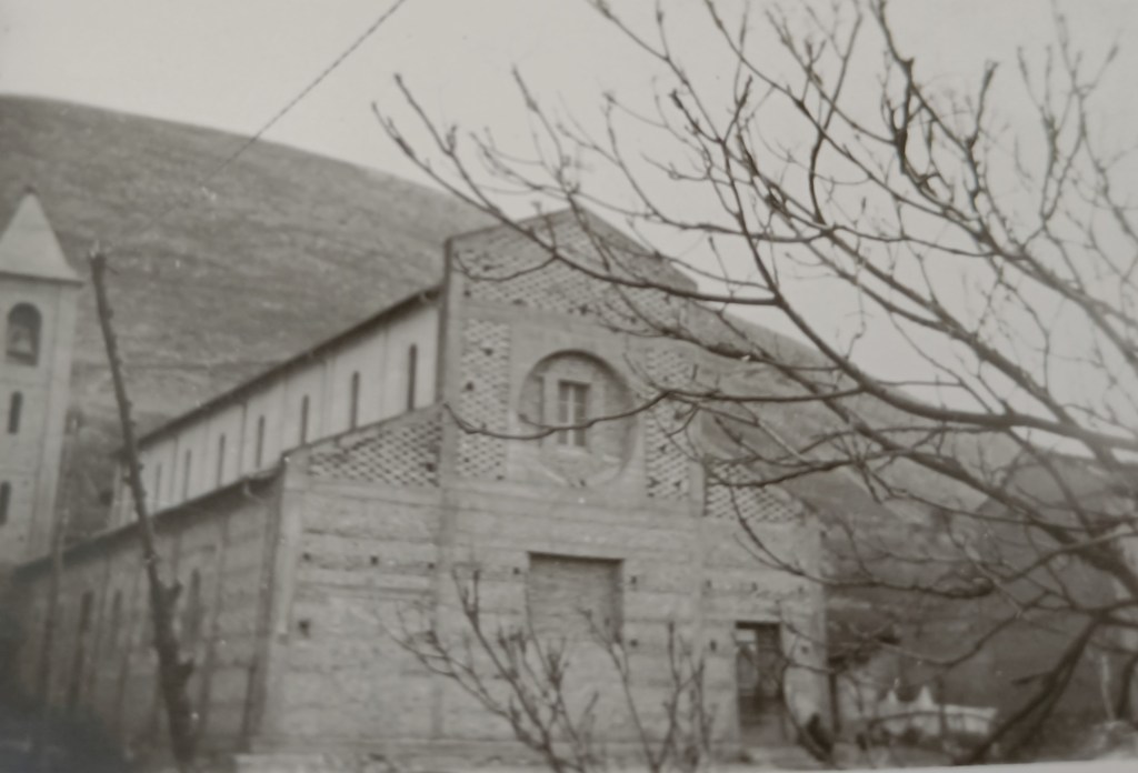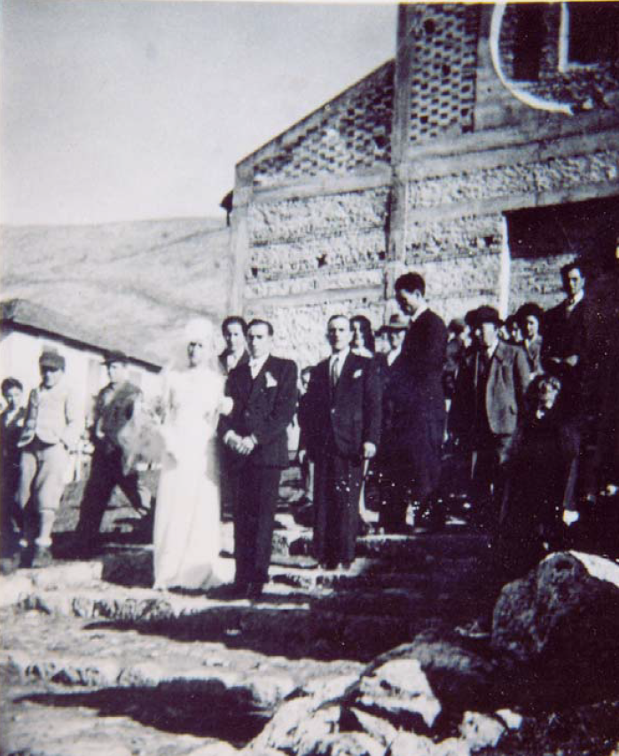 Negli anni che vanno dalla riedificazione fino al 1950, dunque, il fronte esterno della chiesa parrocchiale ha mantenuto un aspetto inedito e molto particolare, con mattoni a vista, pietre nella parte inferiore e, soprattutto, un finestrone rettangolare installato all’interno dell’incasso circolare del rosone. Nelle foto di proprietà della famiglia di Carmine Cosimati, inoltre, si nota un solo portone montato sul lato destro della facciata, lo stesso verso cui confluisce l’unica parte di “scalinata” apparentemente presente. Nella zona centrale si nota un incasso parziale predisposto per il portone principale, mentre sul lato sinistro si intravede solo un montante all’interno della muratura “piena”. Medesima configurazione è riscontrabile, seppur parzialmente, in una foto relativa al matrimonio tra Maria Cipollone e Giovanni Tomei (“de Caciaro”), celebrato il 19 gennaio 1947 (stessa data e stessa celebrazione, tra l’altro, del matrimonio tra un’altra Maria Cipollone e Armando Cipollone, futuri genitori di Wanda e Sergio). In un’altra foto delle eredi di Sofia Marchionni si nota invece la sistemazione a pietre e mattoni della parte esterna posteriore, tra l’abside ed il campanile.