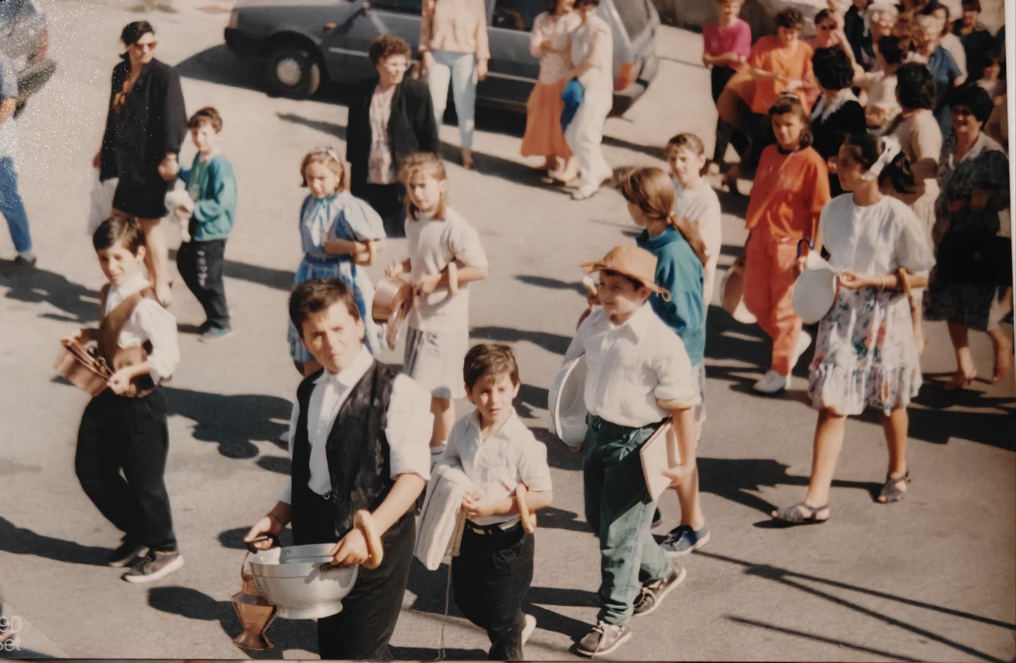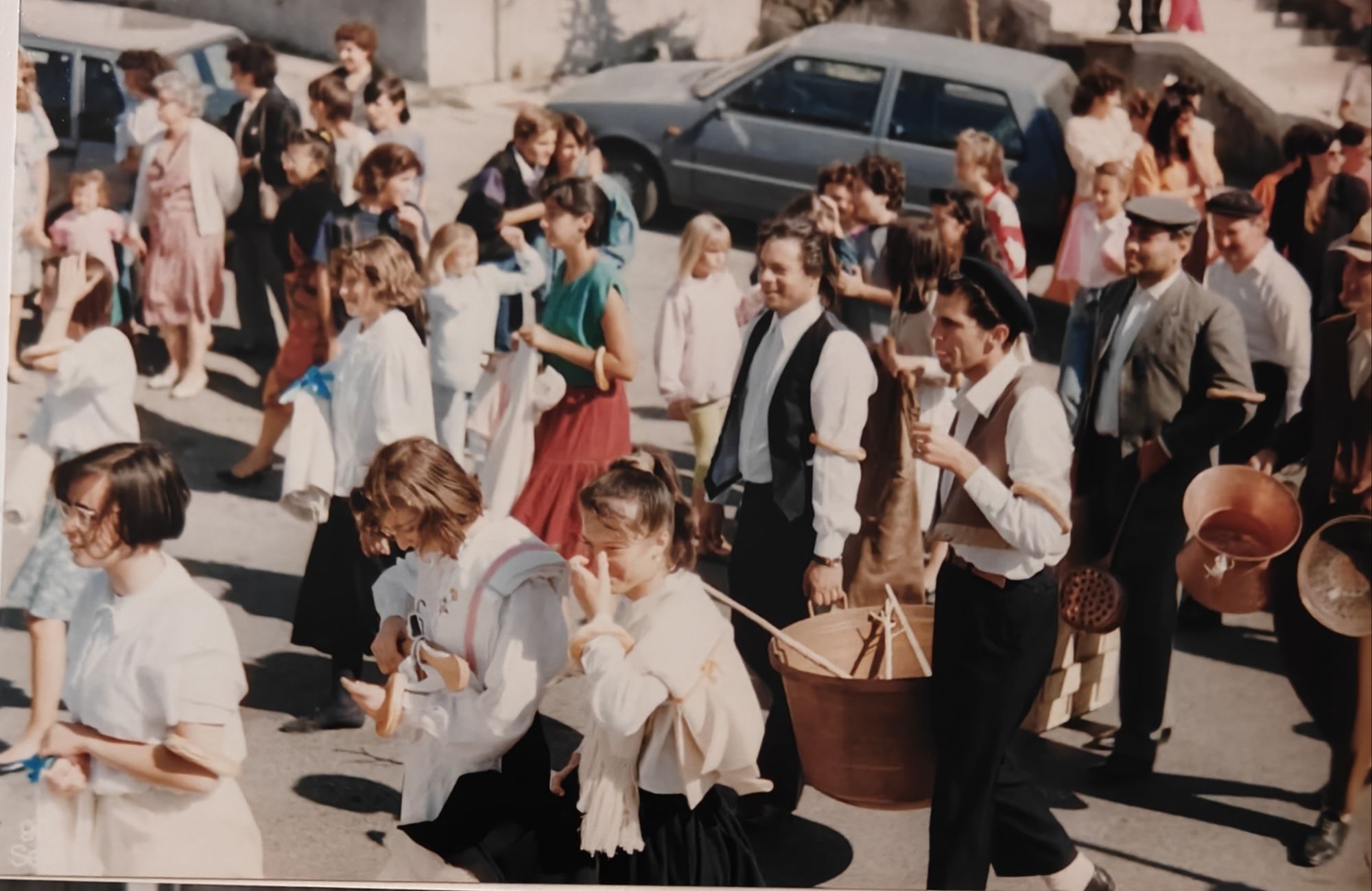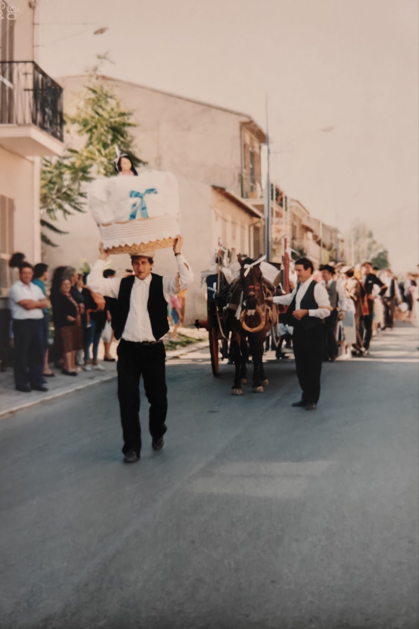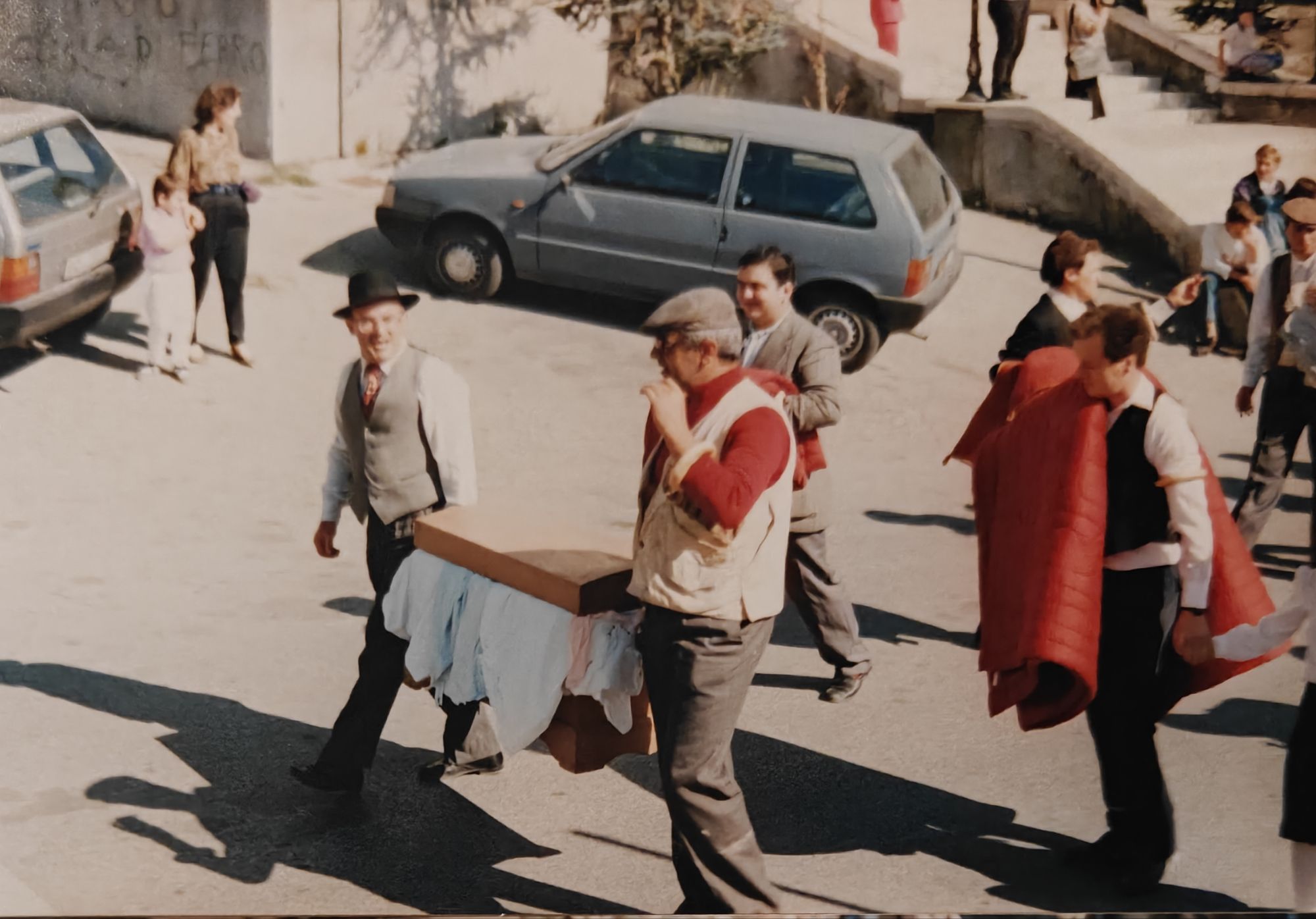 Le donne, di solito, portavano la biancheria e gli indumenti intimi della sposa, mentre agli uomini erano destinati i capi più pesanti, gli utensili, la “batteria” di rame e i pezzi della mobilia. Il corteo precedeva sia la sposa che la sua famiglia. Era la madre a chiudere la fila, sostenendo sul capo una “conca” ricolma di vino. Raggiunta la nuova abitazione degli sposi, quindi, la dote veniva portata in casa. Il recipiente di vino, invece, veniva offerto ai consuoceri, in segno di legame parentale. Con quello e con altre vivande, “chiòrtaji” e biscotti, venivano rifocillati tutti i partecipanti. Un andirivieni di vassoi, boccali, fiaschi e bicchieri faceva da piacevole scenografia a tutto il singolare contesto. Questo particolare costume è in verità quello che rimane più vivo e indelebile nella mente di chi lo ha vissuto direttamente, ma anche nella memoria dei ragazzi che lo hanno conosciuto marginalmente.