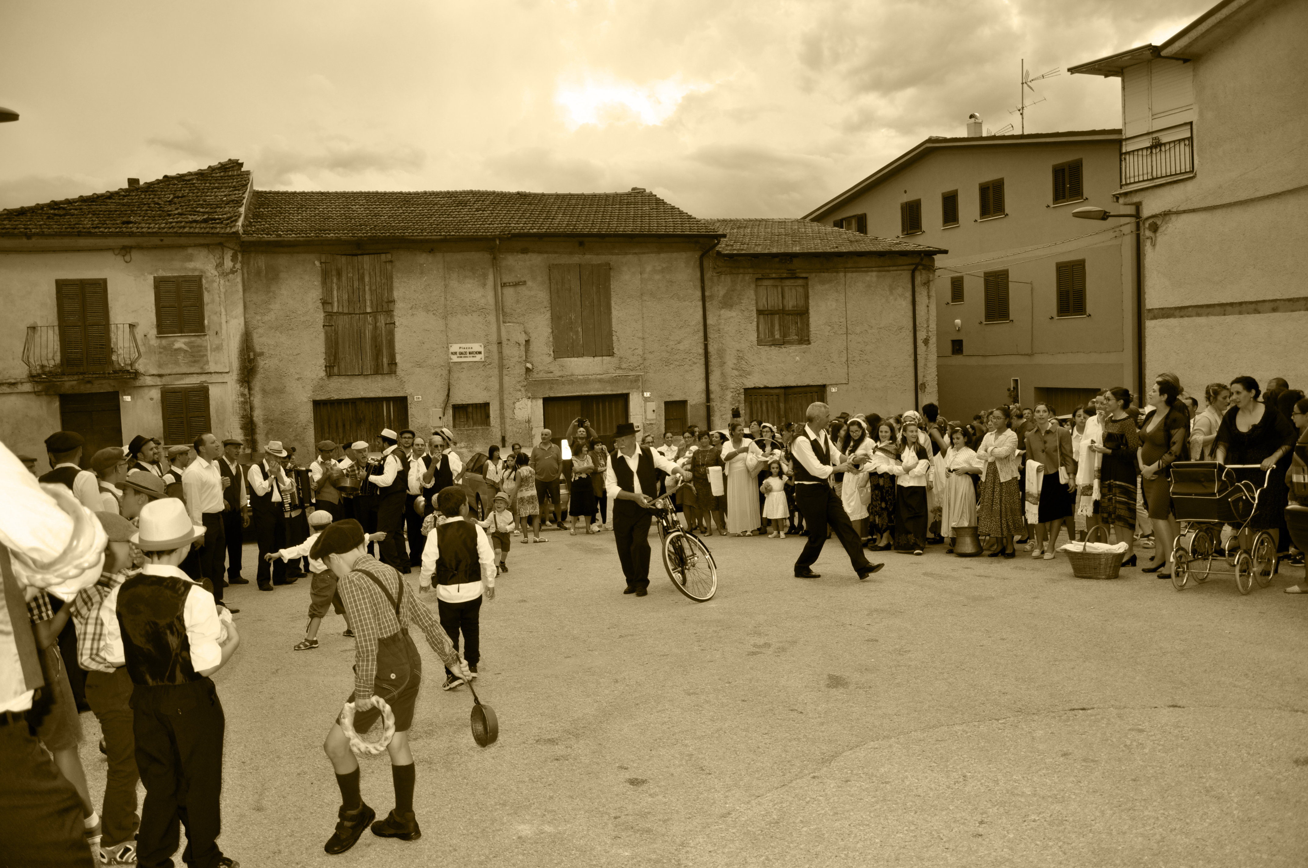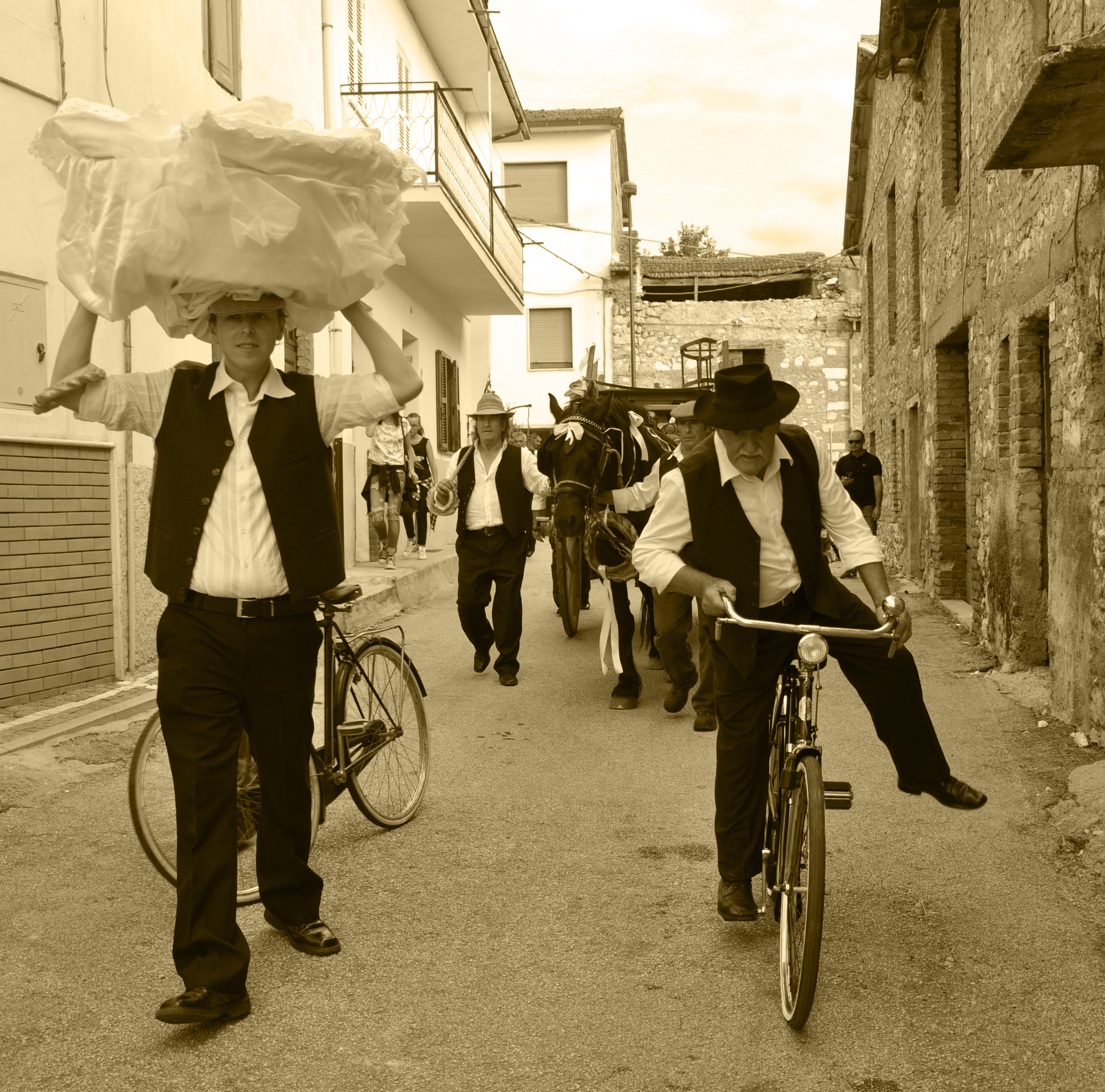 Il portatore del canestro doveva possedere anche una buona dose di “spirito”. Nel condurre il corteo, infatti, si concedeva anche diverse divagazioni. Simulava disorientamento, cambiava strada, si affacciava in vicoli secondari, bussava alle porte chiuse e con il suo fare scanzonato arricchiva il clima festoso di estemporanee “scenette”. Le due file del corteo seguivano le sue mosse in sincronia, di solito assieme ad un carretto trainato da un mansueto quadrupede. Il mezzo trasportava gli oggetti più pesanti ed era anch’esso adornato con nastri, lenzuola e coperte, mentre al collo della bestiola veniva posta un’enorme ciambella appositamente preparata. Al termine del rituale sarebbe stata donata al carrettiere o al proprietario dell’animale. Tutti i portatori “dejjo carraggio” e le ali che accompagnavano il corteo rumoreggiavano festosi generando un insolito frastuono ed un’atmosfera singolarissima. Qualcuno, nel contesto, anticipava scherzosamente la richiesta dei confetti (contemplata solo per il giorno del matrimonio) strillando: «Non ji tè’, ji tè’, ji tè’… Non ji tè’, ji tè’, ji tè’ …». A questi facevano eco altri bontemponi, che aggiungevano: «Non la tè’, la tè’, la tè’… la cioccolattièra pe’ ffa’ jo caffè».