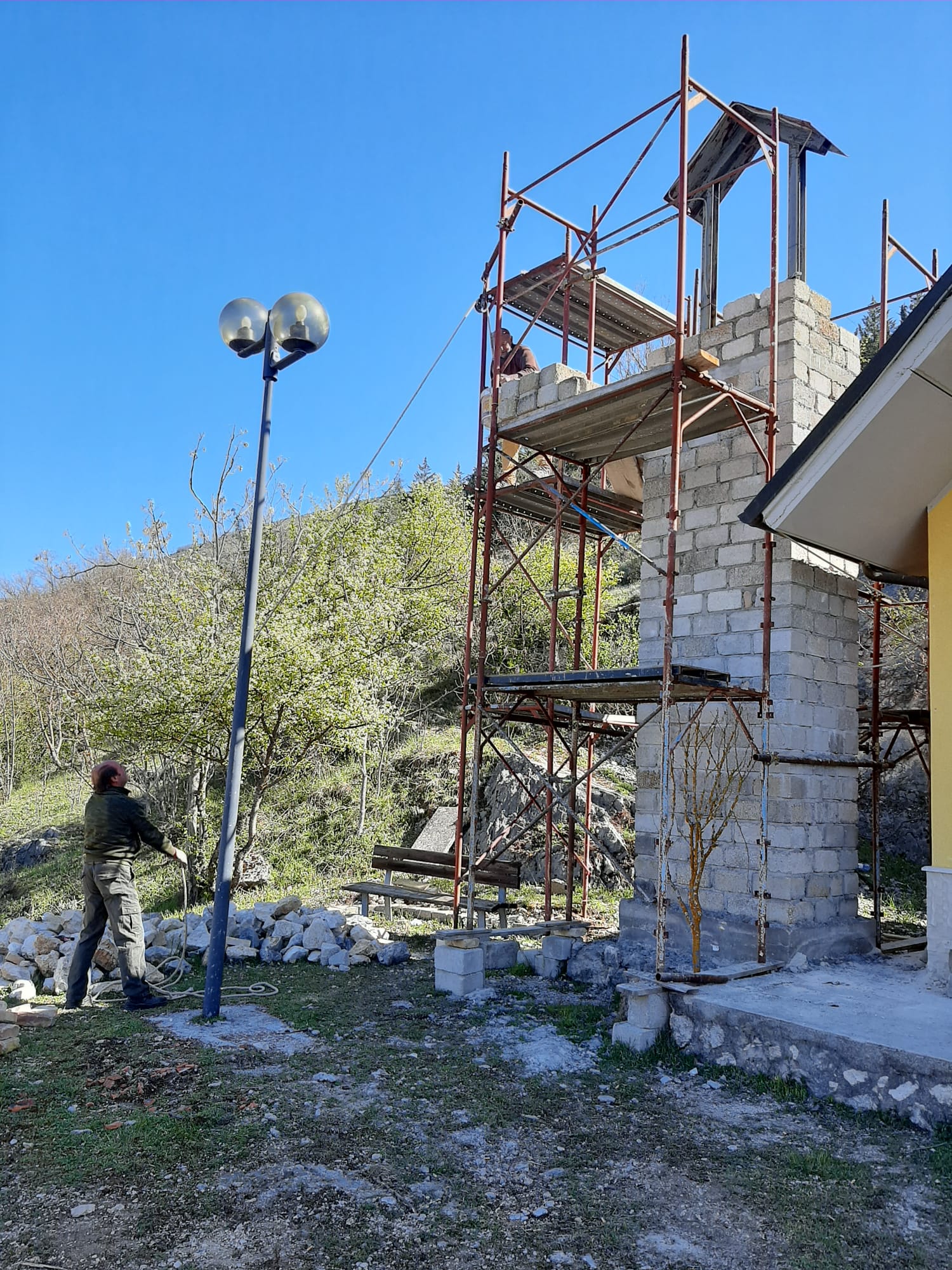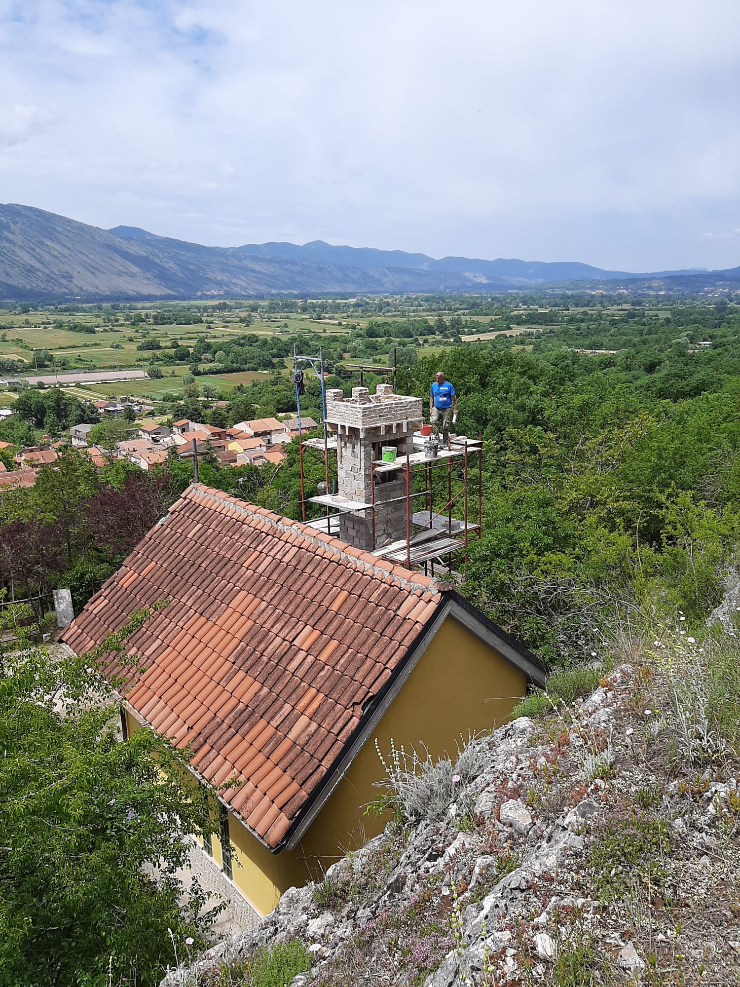 Sulla base dei documenti storici citati, si deduce che nel tempo la chiesa di San Rocco è stata più volte abbandonata e restaurata a seguito di diversi eventi naturali. Alla fine degli anni ’80, infine, un gruppo di volontari, in primis i promotori Emilio Cipollone (“Jo Ruscio”) ed Enrico Di Matteo, Antonio Cipollone (“‘Ntoniuzzo”), Angelo Di Bartolomeo, Sergio, Alfredo, Emilio (di Oreste) e Oliviero Cipollone, Lucio Bonari, Raimondo Patrizi, ha portato a termine una decisiva opera di ricostruzione[3]. Le mura perimetrali sono state realizzate con blocchi di cemento ed il tetto, sorretto da pannelli di cemento armato precompresso, è stato edificato con la pendenza tipica delle chiese alpine, conferendo alla chiesetta una singolare e simpatica caratteristica. Sulle pareti sono state ricavate vetrate alte e strette che, con quelle dell’ingresso, donano all’interno una buona illuminazione naturale. Nel 2007, accanto alla chiesa è stata posta un stele intitolata al Gruppo Alpini “Paolo Cipollone” di Cese. Tra il 2020 ed il 2021, inoltre, è stata edificata una torre campanaria in muratura che ha sostituito l’esistente struttura in ferro. La pregevole opera è stata realizzata da Massimo Tomei con il fondamentale aiuto di Vittorio Di Giamberardino ed il sostegno economico di un gruppo di coetanei della classe 1967. La nuova campana, fusa ad Agnone, è stata invece donata dai figli di Francesco Cipollone ed Agnese Tucceri in loro memoria. Non è poi da dimenticare, in questo contesto, il gruppo di devoti e benefattori che cura costantemente la manutenzione della chiesetta e dell’area circostante con dedizione e discrezione.