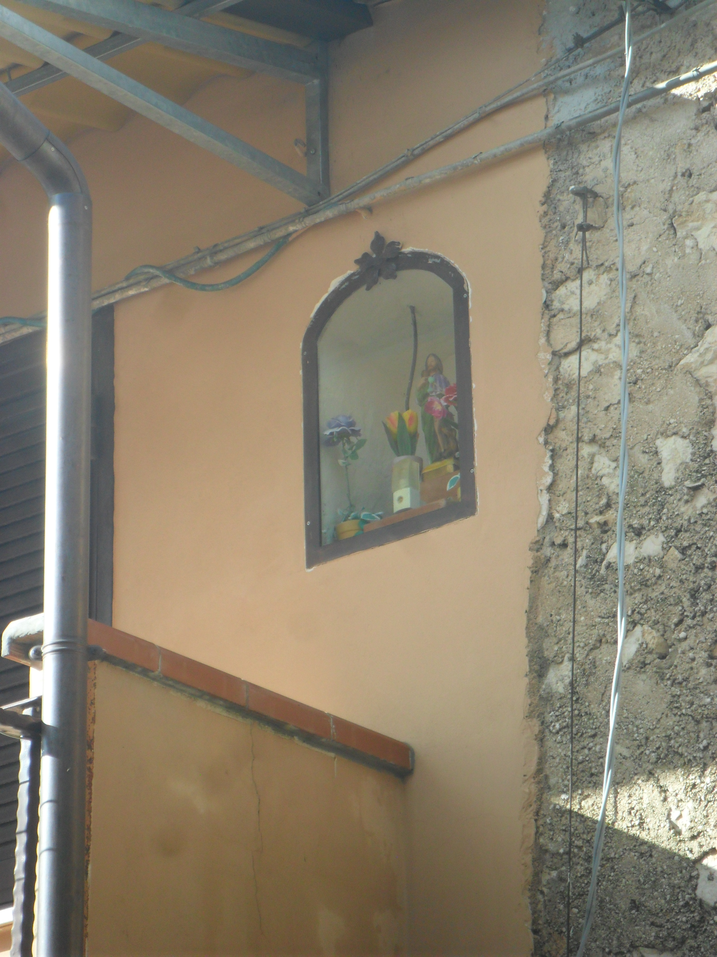Pur non entrando nel contesto della simbologia religiosa di matrice strettamente privata, si deve tuttavia rilevare che diversi icone ed immagini installate su facciate e nicchie del paese sono visibili a tutti. Nello specifico, diverse nicchie sono incastonate tra le mura, incorniciate e protette da lastre di vetro, ad incuriosire quei viandanti che, alzando gli occhi, osservano e fanno riflessioni sulle antiche consuetudini legate al culto religioso locale. Quelle più note sono tutte successive al terremoto del 1915 e molto probabilmente sono state realizzate al tempo della ricostruzione, tra gli anni ’20 ed i ’30. Se ne contano almeno sei, la metà delle quali lungo il corso: San Vincenzo Ferrer sulla parete di Rantucci, il Sacro Cuore sulla facciata dei Bianchi, la Madonna col bambino sulla facciata di Galdi, la Madonna sulla facciata di Alfonsi, San Rocco sulla via omonima. Altre immagini religiose sono invece poste all’interno di riseghe, finestrelle e piccole cavità (come San Pio da Pietrelcina alla strettoia di via Pietro Marso, o la Madonna con bambino presso la stalla di Di Giamberardino su via dell’Ara), a simboleggiare una dedizione nella quale si mescolano sacro e popolare, sempre con la stessa autenticità.