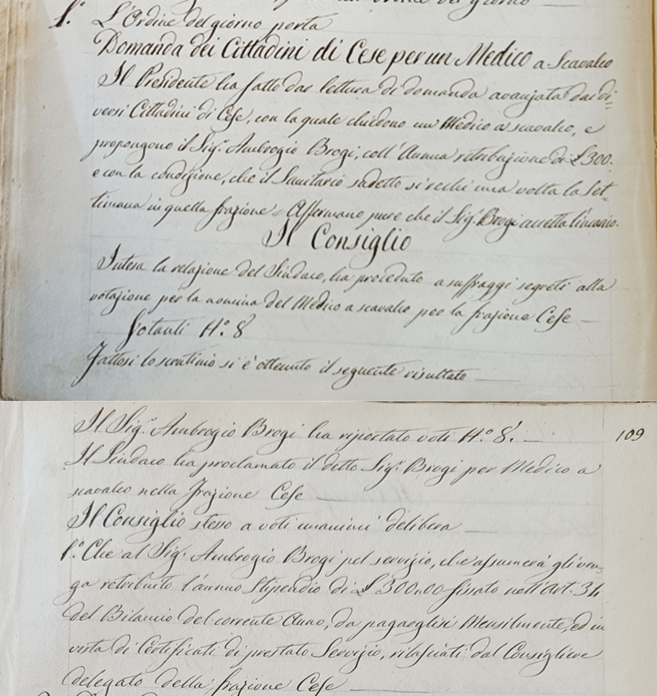 [2] Con la legge 12 dicembre 1816 n. 570 il re Ferdinando I Borbone intese dare una sistemazione razionale alle amministrazioni locali, riprendendo a grandi linee le disposizioni già emanate nel 1806 da Giuseppe Bonaparte. La legge suddivise il Regno delle due Sicilie in province, distretti e comuni, affidandone la responsabilità governativa rispettivamente all’intendente, al sottintendente e al sindaco. Nella stessa legge veniva in particolare specificato: “In un comune non piò stabilirsi più di un solo onorario di medico e di cerusico, salvo qualche eccezione comandata da circostanze locali …”.