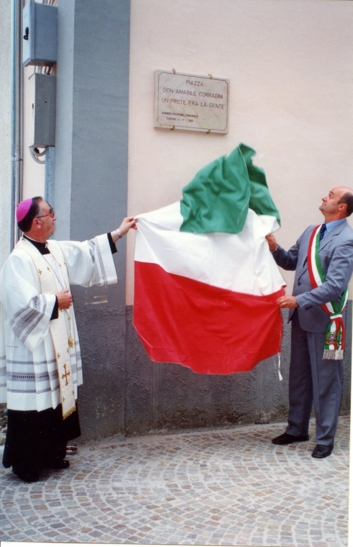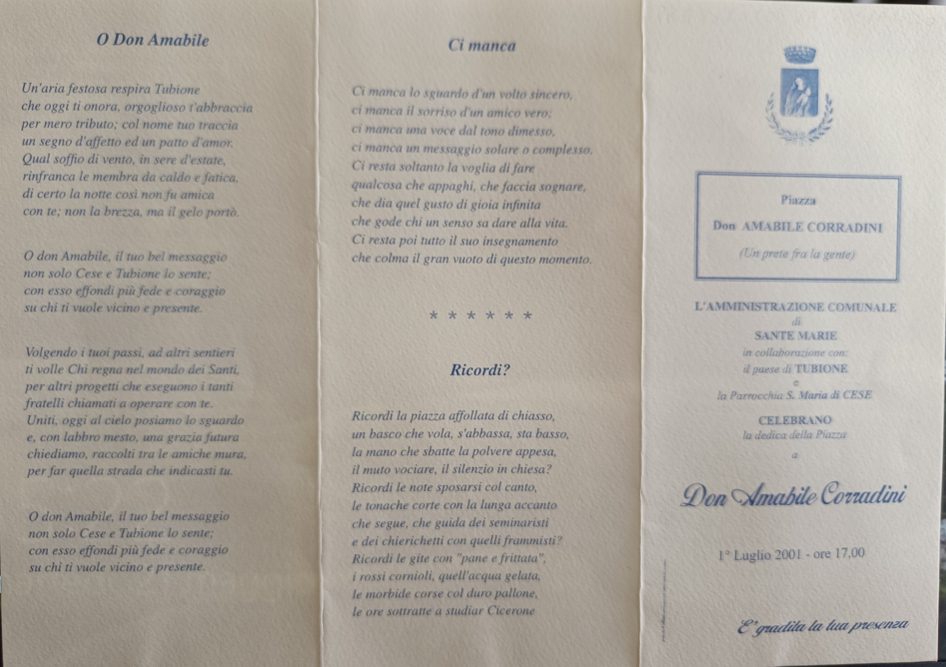 Il 1° Luglio 2001 così i fedeli di Tubione, insieme all’Amministrazione Comunale di Sante Marie e alla parrocchia di Cese, hanno voluto ricordare il loro sacerdote Don Amabile Corradini, dedicandogli una piazza, chiamandolo “prete tra la gente”. Erano numerosi i presenti alla manifestazione: S.E. Mons. Lucio Renna Vescovo dei Marsi, molti sacerdoti, il Sindaco di Sante Marie Lorenzo Berardinetti, l’assessore Gianluca Nanni, il consigliere Stefano Giovanni, il vice presidente della Comunità Montana Vincenzo Patrizi, gli amici carissimi Don Nino Balestra, Don Martino Valerii, Don Aldo De Angelis, Don Vincenzo Angeloni, il Dott. Mario De Simone, direttore ASL di Roma, il Dott. Mario Antonini, ex sindaco di Sante Marie, ex alunni e colleghi di Avezzano, la cognata Gabriella Guadagnoli, la nipote Antonella, gli zii, i cugini, la banda di Santo Stefano e… la gente, tanta gente di Tubione, di Scanzano, di Verrecchie, di S. Stefano, di S. Marie, di Avezzano, di Cese, di Corcumello, di Tagliacozzo. Don Amabile aveva amato, seguito, compreso, educato la “gente”, non imponendo idee e convinzioni, ma interpretando e mettendo a confronto esperienze, pensieri, aspettative, impegni al fine di realizzare progetti, ma soprattutto perché in ogni creatura nata si realizzasse il “PROGETTO” che il Signore aveva indicato e tracciato con la sua “PAROLA”.