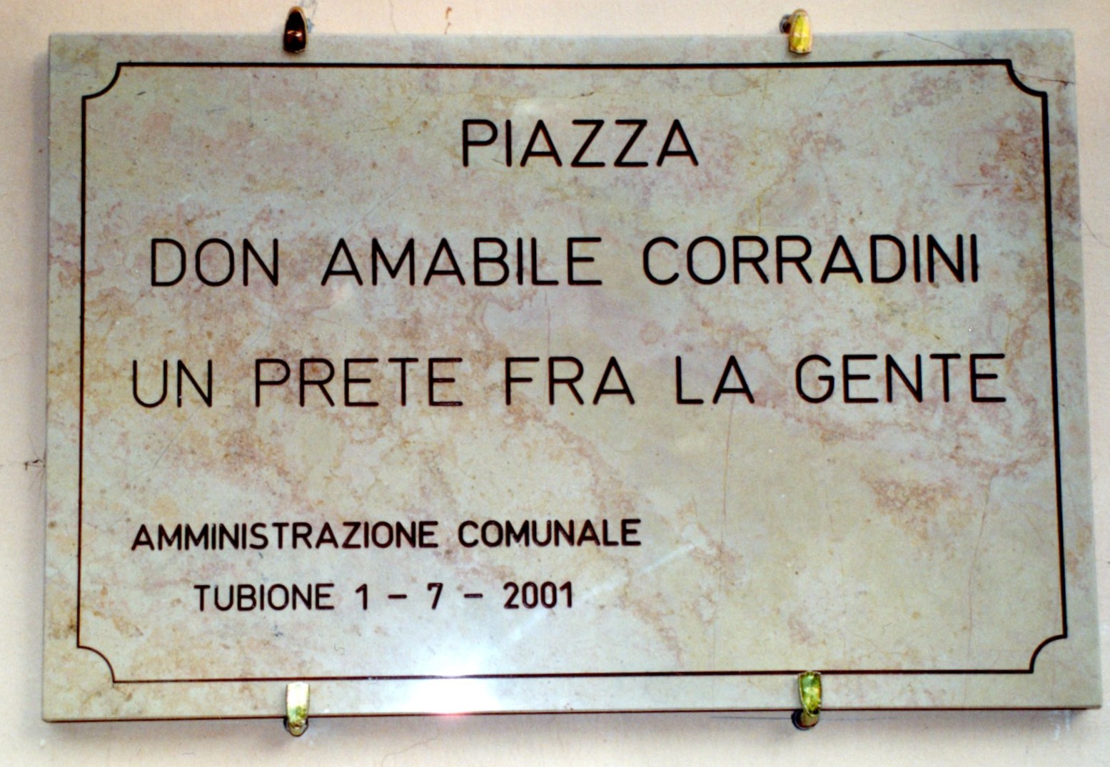 Il 1° Luglio 2001 a Tubione veniva inaugurata Piazza Don Amabile Corradini, “un prete tra la gente” come recita la didascalia, a sottolineare la dimensione profondamente umana ed il carattere di generosa fraternità che ha accompagnato l’esistenza e l’operato del sacerdote originario di Cese. Don Amabile era purtroppo morto in un incidente stradale nel 1992, a soli 55 anni, ma la targa sulla piazza di Tubione rimane lì a testimoniare la bontà della sua missione.