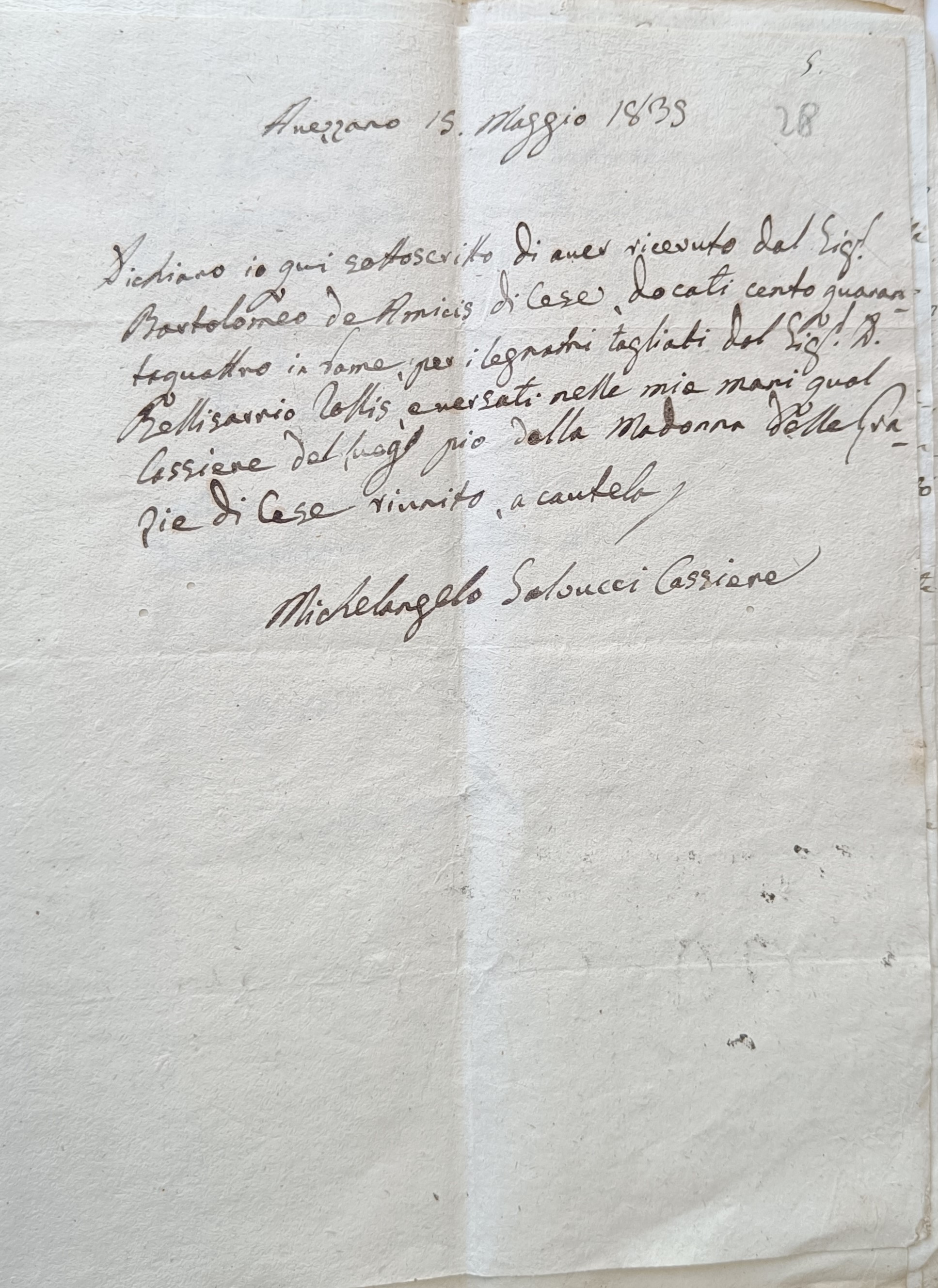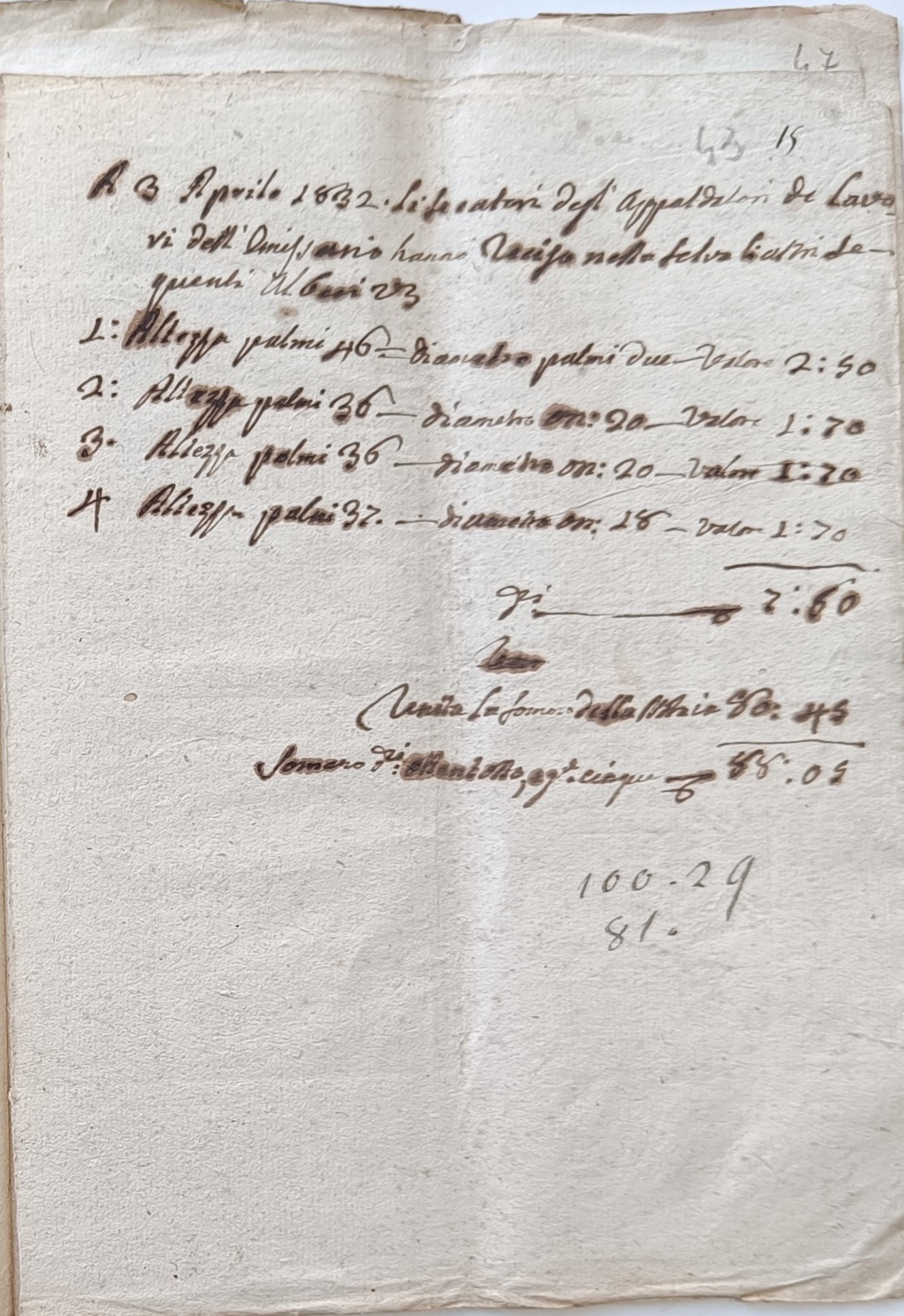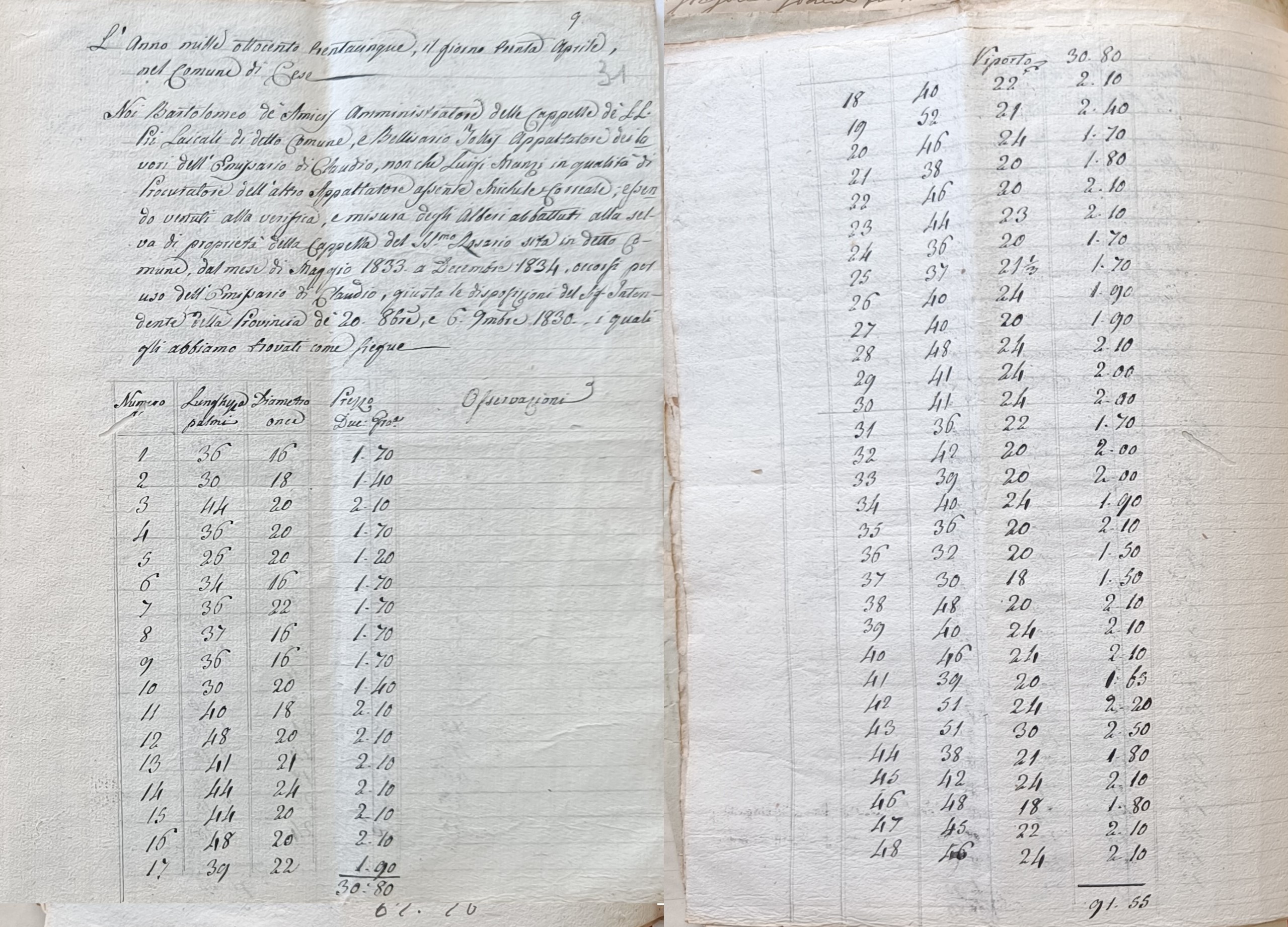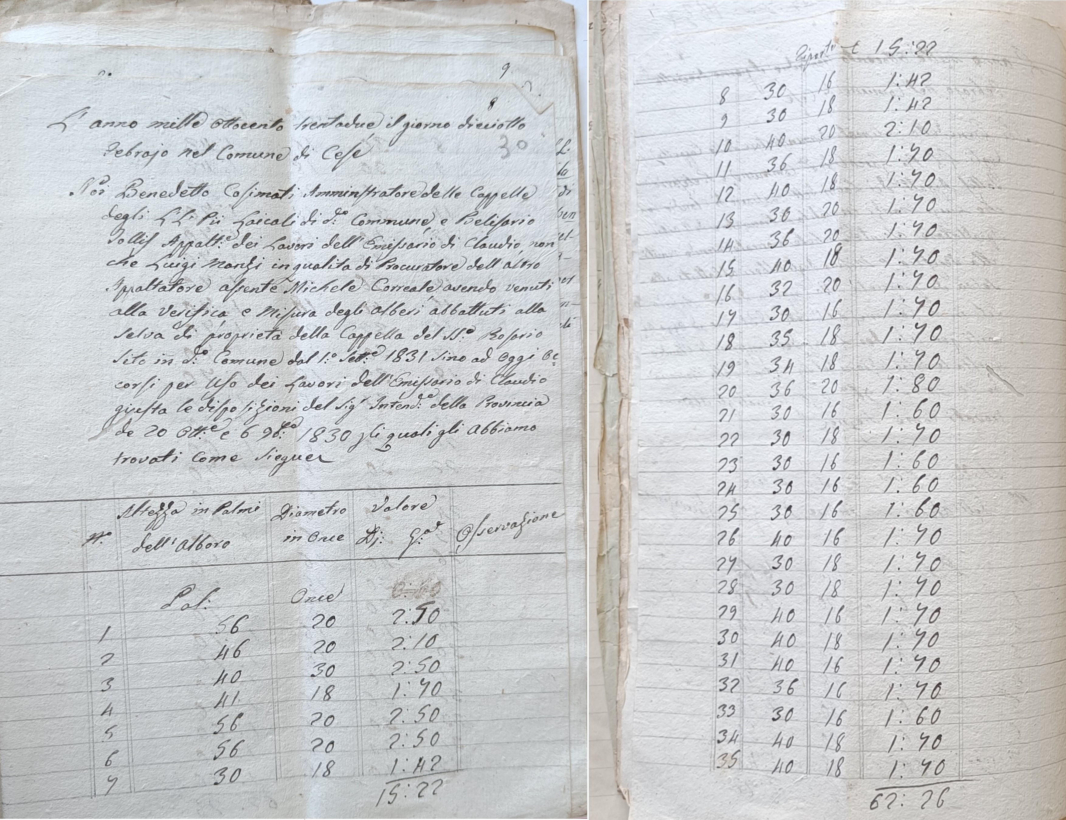 Tra la fine del 1700 e l’inizio del 1800 il tema del prosciugamento tornò di grande attualità e il Re Ferdinando I Borbone incaricò numerosi ingegneri di studiare la fattibilità dell’impresa. Dopo le iniziali previsioni pessimistiche ed un successivo studio del 1816, nel 1825 l’ingegnere Carlo Afan de Rivera riuscì a realizzare osservazioni più precise, ottenendo un adeguato stanziamento per i primi lavori di saggio. Nel 1826 si avviò così l’opera di espurgo e restauro dell’antico emissario che si protrasse fino al 1834. In quegli stessi anni iniziò dunque un secondo sterpamento che interessò ancora il bosco presente nel territorio di Cese, per tutte le esigenze legate ai lavori in atto. Fulvio D’Amore, nel suo libro “La Marsica tra il Viceregno e l’avvento dei Borboni”, scrive che “il governo del tempo decise il taglio di 200 alberi nei boschi dei Piani Palentini, per far delle travi; ugual numero di tavole di faggio dovevano essere tagliate nella selva di Capistrello e in quella della Madonna in tenimento di Cese”. Nello stesso libro, il nostro paese viene citato anche in riferimento ad un giudice, Giovanni Melchiorre, che a quanto pare formalizzò la garanzia del tesoriere locale rispetto agli stanziamento del governo napoletano: “Per l’opera di rispurgo dell’emissario di Claudio, il governo napoletano mise a disposizione 6000 ducati il cui tesoriere, il facoltoso Don Vincenzo Minicucci, con atto notarile firmato alla presenza del regio giudice Giovanni Melchiorre di Cese, dette ampie garanzie, enumerando i suoi grandi possedimenti in tutta la Marsica e nella città di Roma”. Nei documenti presenti nella sezione avezzanese dell’Archivio di Stato sono rintracciabili diversi resoconti relativi al taglio degli alberi effettuato all’interno della “Selva della Madonna” di Cese per i lavori dell’emissario. Il primo elenco è del 1831 e riguarda gli “Alberi che si recidono alla Selva di Cese dagli Appaltatori dei lavori dell’Emissario di Claudio dal 1° Settembre 1831 in avanti da pagarvi”; contiene la lista enumerata con indicazioni delle misure di altezza e diametro e relativa valutazione per il pagamento. Da un documento del 1832 si evincono anche i nomi degli appaltatori interessati e della controparte cesense; i primi due sono Belisario Tollis e Michele Correale (quest’ultimo rappresentato in qualità di procuratore da tale Luigi Manzi), mentre per il “Comune di Cese” il nominativo è quello di Benedetto Cosimati, figlio del notaio Felice Antonio e “Amministratore delle Cappelle degli I.I. Pii Laicali di detto Comune”. In tale documento si fa riferimento agli “alberi abbattuti alla Selva di proprietà della Cappella del S.S. Rosario sito in detto Comune dal 1° Settembre 1831 sino ad oggi, occorsi per uso dei lavori dell’Emissario di Claudio, giusta le disposizioni del Sig. Intendente della Provincia de … 1830”. Nel 1834 gli introiti derivanti dal taglio degli alberi sarebbero stati versati nelle casse della Commissione di Beneficenza del Comune di Avezzano, come attestato dal cassiere Michelangelo Salucci. Nel 1835, poi, si sarebbe stilato un ulteriore elenco a firma degli stessi appaltatori e del nuovo Amministratore per la parte di Cese, Bartolomeo De Amicis.