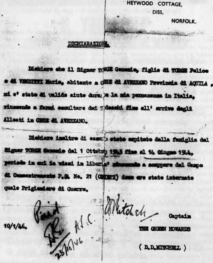 Dichiaro inoltre di essere stato ospitato dalla famiglia del Signor Torge Genesio dal 1° ottobre 1943 fino al 14 giugno 1944, periodo in cui io vissi in libertà riuscendo a scappare dal Campo di Concentramento P.G. No. 21 (Chieti) dove ero stato internato quale Prigioniero di Guerra.