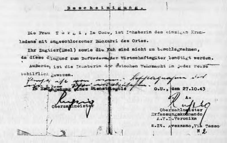 La Sig.ra Torgi, Le Cese, è proprietaria dell’unico negozio, con vicino il forno. Le sue bestie da tiro, così come la mucca, non sono da sequestrare, in quanto servono a fornire beni per l’economia. Inoltre la proprietaria è stata d’aiuto in ogni modo alle autorità tedesche.