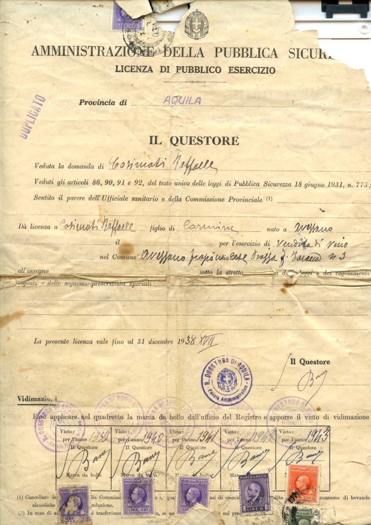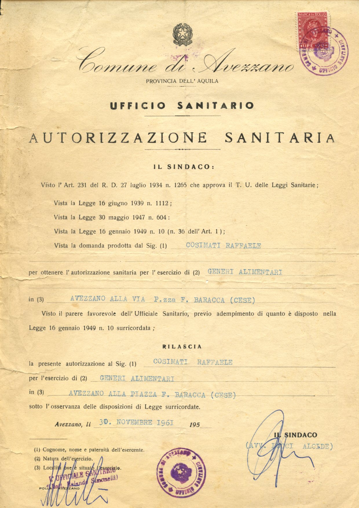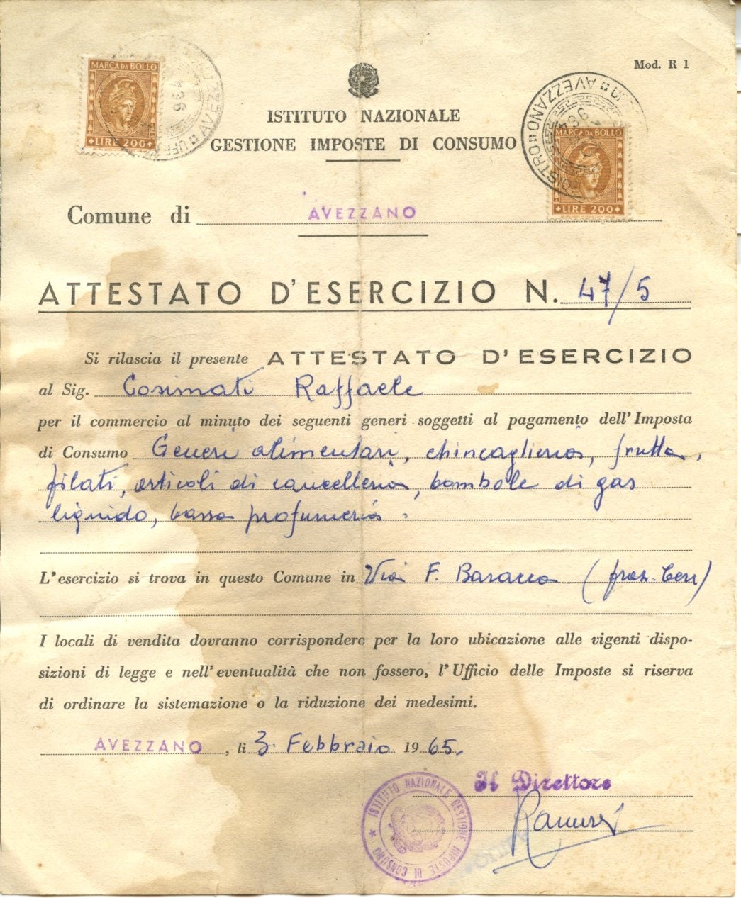 Altri due locali storici di Cese, quello di Giuditta e quello di “Rafaeluccio”, abbinavano all’attività di locanda (poi bar) la rivendita di generi alimentari e di altri prodotti. La prima licenza assegnata a Raffaele Cosimati è datata 1938 ed è relativa alla “vendita di vino”. Nel corso del tempo, a questa si sono affiancate la “somministrazione di piatti caldi”[1] e la rivendita di generi alimentari ed altro. Nell’attestato di esercizio del 1965, in particolare, si fa riferimento al “commercio al minuto” di “generi alimentari, chincaglieria, frutta, filati, articoli di cancelleria, bombole di gas liquido, bassa profumeria”. L’attività si è fisiologicamente trasformata nel tempo: il bar, come noto, è stato gestito in primis da Lina (con l’aiuto dei figli), mentre suo marito Rocco (secondogenito di Raffaele e di Maria Basile) gestiva anche la macelleria, rimasta in vita fino ai primi anni 2000. La piccola rivendita, nella quale si potevano acquistare anche i biglietti della “corriera”, era invece gestita da Giovannina, moglie del primo figlio di Raffaele, Carmine, ed è rimasta attiva fino agli anni ‘90.