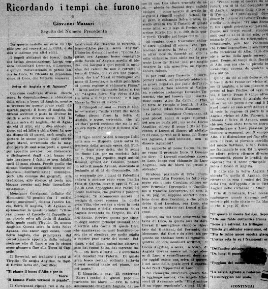 Nell’edizione del 23 maggio 1922, in particolare, trova posto nel periodico la seconda parte di un ampio articolo di Giovanni Massari intitolato “Ricordando i tempi che furono”4. Questa seconda sezione è incentrata appunto sulla questione del “bosco di Angizia/di Agnano” e nella ricostruzione operata dall’autore viene fatto specifico riferimento alla teoria che voleva il bosco ubicato nel versante palentino del monte Salviano, proprio in corrispondenza del territorio di Cese. Massari confuta la tesi con argomentazioni ben fondate, ma lascia spazio ad una teoria “di compromesso” che vorrebbe appunto il territorio di Cese ascrivibile ad estensione di un ampio bosco chiamato di Angizia ma avente diverse denominazioni locali. La collocazione del bosco di Angizia resta ben individuata attorno al monte Penna, nel territorio luchese, tuttavia l’ipotesi della sua estensione fino all’area di Cese costituisce un’affascinante, per quando labile, suggestione.