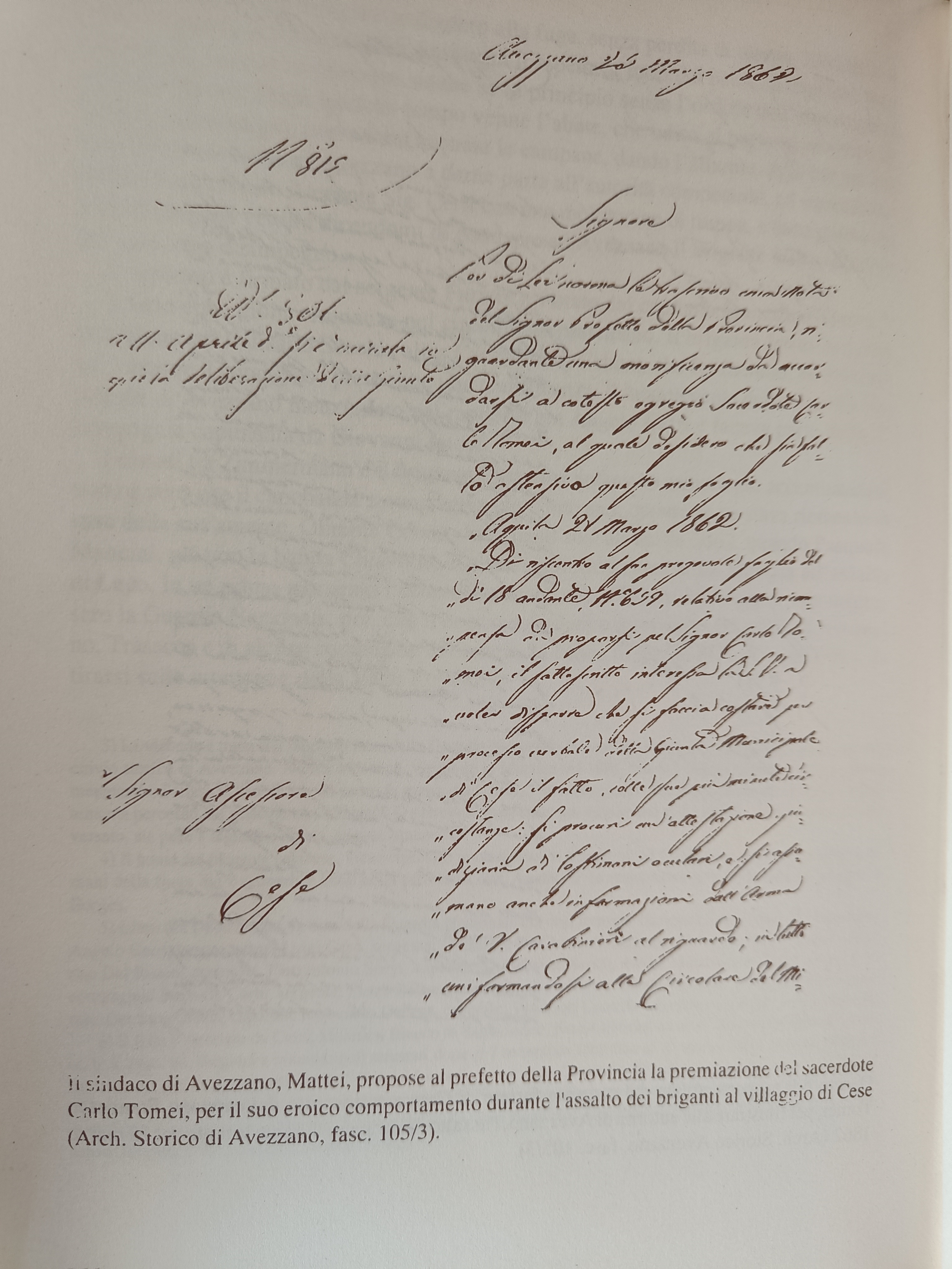 Il 15 dello stesso mese [marzo 1862], nel circondario di Avezzano, e precisamente nel piccolo paesino di Cese, un gruppo di briganti, senza alcun «capo» importante, assaltò la Guardia Nazionale, cercando di invadere la casa della famiglia Tomei. Riportiamo interamente il rapporto compilato dal furiere che in quella notte «incontrò» i banditi, scritto con molti errori, e come poteva esprimersi un povero contadino marsicano: