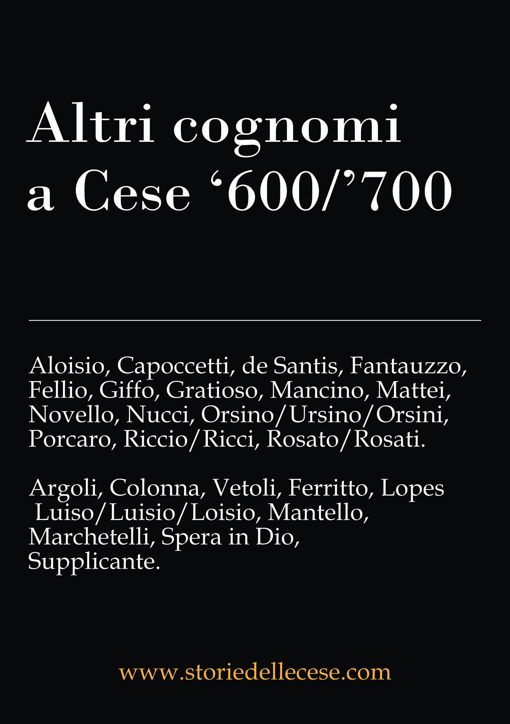 Nel catasto gentilesco del 1616 e in quello del 1700 sono presenti anche altri cognomi pressoché scomparsi o mai insediatisi a Cese in termini di residenza, ma presenti nei registri con i propri possedimenti. Alcuni di questi cognomi hanno un immediato riferimento patronimico, come nei casi di d’Amico, d’Antonio, d’Anzelmo, di Benedetto, di Berardino, di Cenzo, di Cola, d’Ercole, di Francesco, di Giovanni Paolo, di Giulio, di Giuseppe, di Iulio, di Lorenzo, di Loreto, di Luca, di Lucido, di Meo, di Marino, di Micchele, di Novello, d’Orsino, d’Oliviero, di Pasquale, di Pasquazio, di Pompeo, di Santo, di Scipione, di Sebastiano, di Serio, di Simone, di Stasio, di Valerio e di Virgilio; rientra plausibilmente in questa casistica anche il cognome di Ruscio, che appare però anche nella forma simile Roscio. Altri cognomi sono ad oggi presenti in centri limitrofi della Marsica e, seppur molto limitatamente e in forme leggermente diverse, anche a Cese. Si tratta di Aloisio, Capoccetti, de Santis, Fantauzzo, Fellio, Giffo, Gratioso, Mancino, Mattei, Novello, Nucci, Orsino/Ursino/Orsini, Porcaro, Riccio/Ricci, Rosato/Rosati. Altri ancora non sono più presenti o sono scarsamente diffusi nel nostro territorio, come nel caso delle casate decadute (Argoli, Colonna, Vetoli) o di altri ex possidenti come Ferritto, Lopes, Luiso/Luisio/Loisio, Mantello, Marchetelli, Spera in Dio, Supplicante. Nomi rimasti sulle pagine ingiallite di antichi registri come tracce di quel mondo che non c’è eppure non è morto del tutto.
