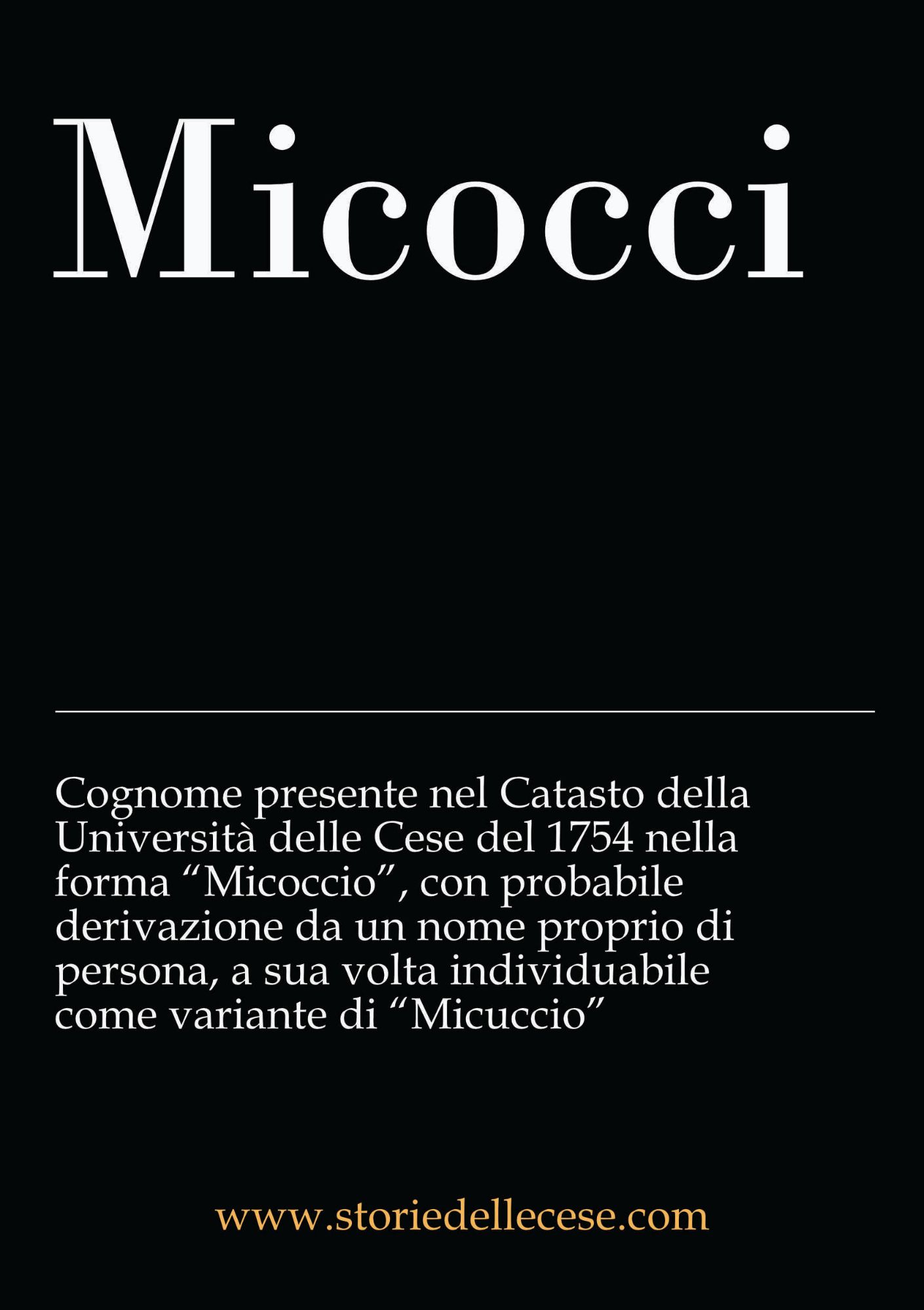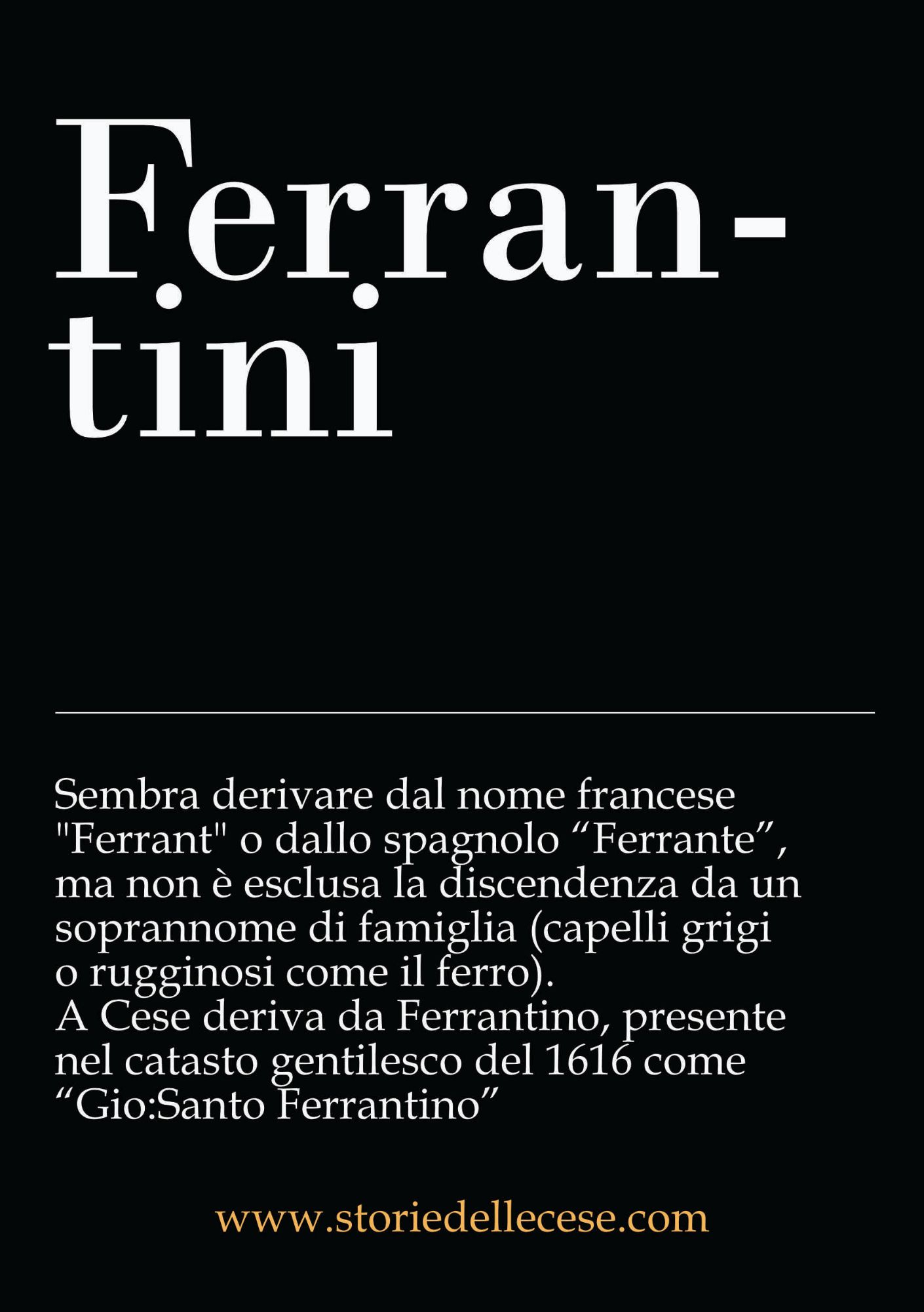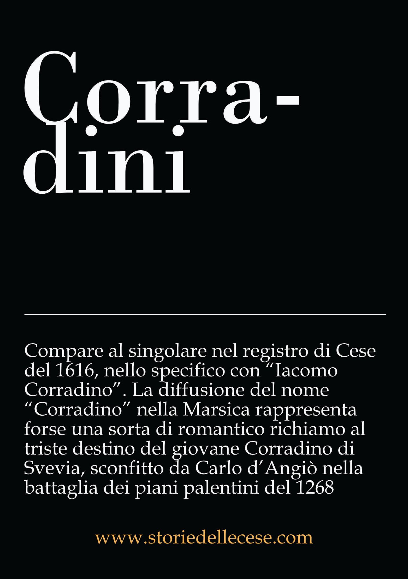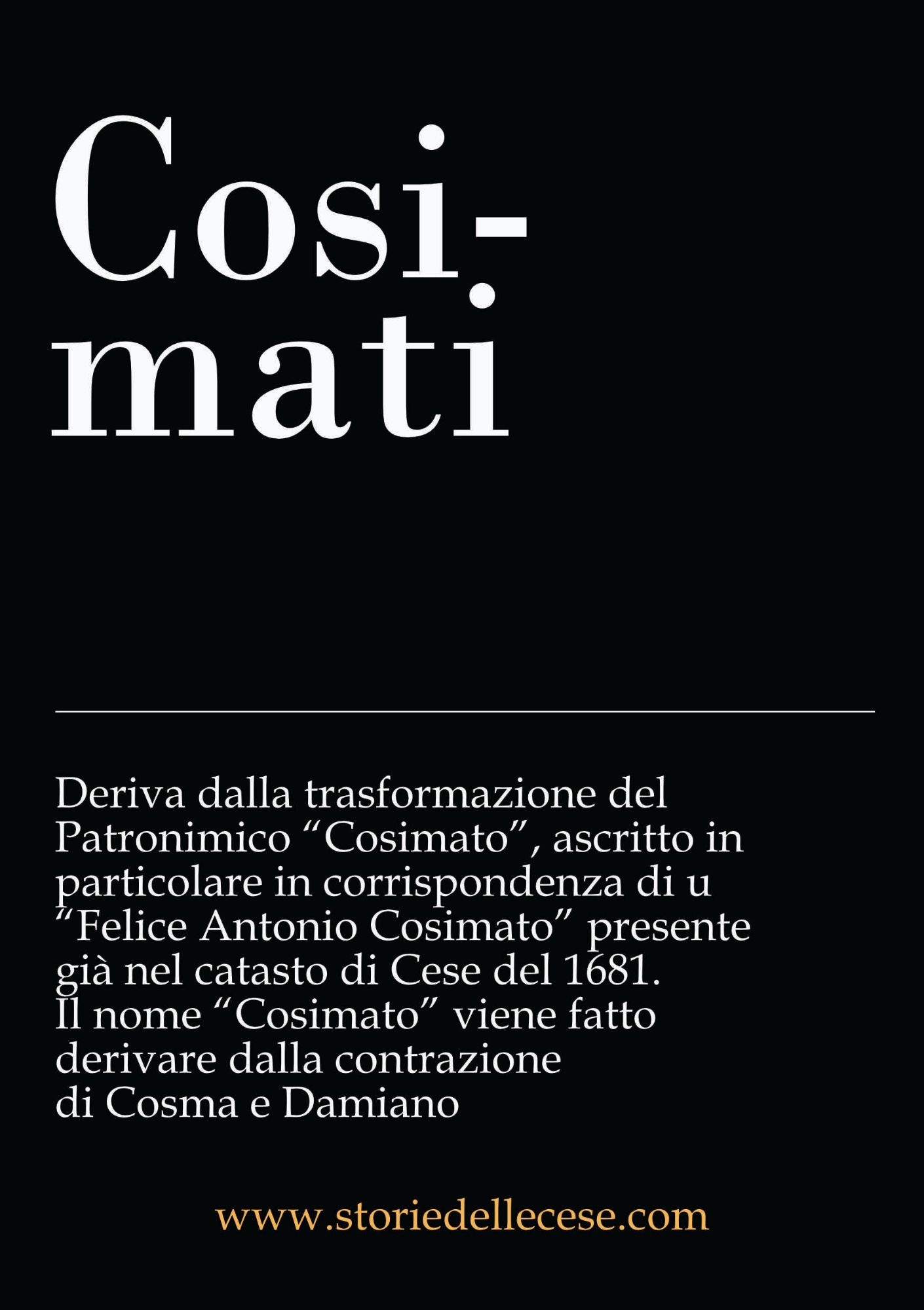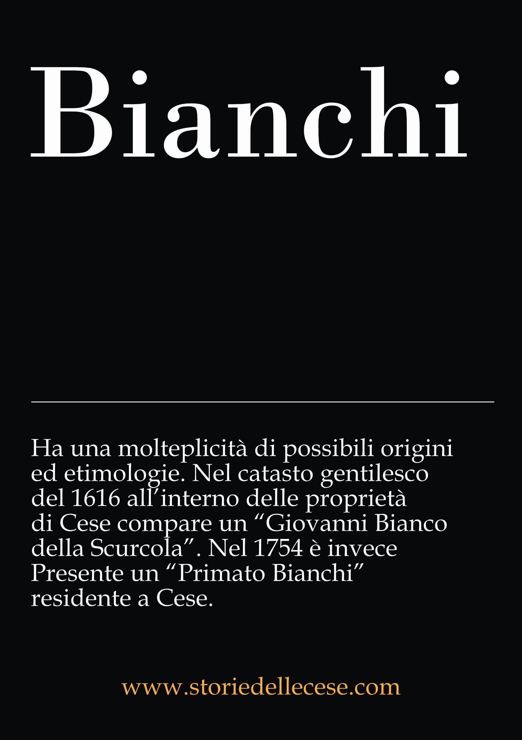 Altri cognomi locali non hanno mai avuto al proprio interno la parte preposizionale “di”, almeno stando ai registri ad oggi disponibili, ma sono sempre comparsi con un solo termine distintivo, molto spesso nella forma derivata dal nominativo latino singolare (ossia con la “o” o – più raramente – con la “e” finale). La gran parte dei cognomi italiani, d’altro canto, ha nel tempo subito la nota trasformazione che ha portato a quella “i” finale riscontrabile in quasi la metà degli attuali cognomi. Tale trasformazione, a sua volta, nasce dall’uso del genitivo (“Bartholomeus”–>”Bartholomei”, ossia “Di Bartolomeo”) ad indicare proprio la discendenza/appartenenza, o del nominativo plurale, usato magari per indicare sinteticamente le proprietà appartenenti a fratelli o a persone dello stesso ceppo (“I Bartholomei”). Diversi sono i cognomi di Cese riconducibili a questa casistica, a partire da alcuni dei più diffusi, come Cosimati, Corradini, Micocci e Ferrantini. La forma attuale COSIMATI, in particolare, deriva dalla trasformazione del cognome “Cosimato”, ascritto in particolare in corrispondenza di un “Felice Antonio Cosimato” presente già nel catasto del 1681. Lo stesso nome sarà invece registrato come “Cosimati” in quello del 1754, in cui, oltre a Felice Antonio (plausibilmente nipote dell’omonimo registrato nel 1681), compaiono anche Francesco, Giuseppe e Filippo (il quale, invece, in alcuni punti appare ancora come “Cosimato”). Il nome “Cosimato”, poi, viene fatto derivare dalla contrazione di Cosma e Damiano, i due fratelli medici che furono decapitati sotto Diocleziano e vennero proclamati santi. Anche il cognome CORRADINI compare al singolare nel primo registro conosciuto, nello specifico con “Iacomo Corradino”. Il nome “Corradino”, di suo, nel nostro territorio richiama in maniera immediata la vicenda di Corradino di Svevia e la battaglia dei piani palentini del 1268; non si può escludere, d’altronde, che questo nome di origine germanica si fosse diffuso al tempo con una sorta di romantico richiamo al triste destino del giovane duca sconfitto da Carlo d’Angiò. La forma attuale compare solo nel catasto del 1754, in cui si trovano diversi “Corradini”: Francesco e Giacomo (aggiunto), figli di Sabatino, Michele (Micchele) e Romolo. Alcuni di loro, tuttavia, all’interno dello stesso registro sono annotati anche come “Corradino”; un altro, invece, è riportato solo in quest’ultima forma, ossia “Angelo Corradino”, a dimostrare che a metà ‘700 la dualità non era stata ancora del tutto risolta. Un’evoluzione analoga è ipotizzabile per il cognome MICOCCI, che compare in questa forma soltanto nel catasto del 1754, ma solo in alcune parti del registro. In tutto il resto e nell’elenco dei nominativi, infatti, le proprietà sono registrate sotto il cognome “Micoccio” (in particolare affianco a Giovanni, Giovanni Paolo, Giuseppe e Carlo). Nel catasto gentilesco del 1681, invece, compare soltanto con la “o” finale, nello specifico in corrispondenza di “Gioseppe Micoccio”. L’eventualità che anche “Micoccio” derivi da un nome proprio di persona è suffragata dalla presenza in tale forma in diversi registri del tempo, come ad esempio il catasto di Pereto, dove si trovano “Micoccio Faccione” e “Micoccio di Bernabeo”. La presenza, negli stessi registri, di nomi simili come “Micuccio Ciovetta” e “Micuccio di Fran.co” lascia inoltre ipotizzare che il nome “Micoccio” derivi da una variante di “Micuccio”, a sua volta derivato da “Minicuccio” e da “Domenico”. Il cognome FERRANTINI, invece, in termini generici sembra derivare dal nome francese “Ferrant” o dallo spagnolo “Ferrante”, entrambi usati in epoca medioevale, ma non è esclusa una possibile discendenza dal soprannome dato alla famiglia di origine in riferimento al colore dei capelli (grigio o rugginoso come il ferro). A Cese il cognome Ferrantini deriva da Ferrantino, presente nel catasto gentilesco del 1616 come “Gio:Santo Ferrantino” e “Martio Ferrantino”, con un possibile legame al nome proprio “Ferrante”, portato anche da molti illustri membri del casato Gonzaga durante il periodo di dominazione spagnola in Italia (ad esempio il re Ferdinando I di Napoli era anche noto come “Ferrante I” o “Don Ferrante”). Nel catasto del 1681 il cognome è presente nella variante Ferrandini sotto il nome di “Pietro Ferrandini” (o “Ferrandino”), mentre in quello del 1754 compare nella forma attuale, ossia “Ferrantini” (Antonio e, più avanti, Domenico, Tomasso e Arcangelo). Un caso a parte è probabilmente rappresentato dal cognome BIANCHI, che ha una molteplicità di possibili origini ed etimologie. Nel catasto gentilesco del 1616, in particolare, all’interno delle proprietà di Cese compare un “Giovanni Bianco della Scurcola”, che coincide plausibilmente con un altro nome riportato più avanti, ossia “Gio: di Dom.co Bianco della Scurgula”. Nel catasto del 1754, invece, è riportato il nominativo di un certo “Primato Bianchi”, che non viene annoverato tra i “forastieri bonatenenti” e che dunque doveva essere residente a Cese. Se il ceppo familiare di questo “Bianchi” sia lo stesso del precedente “Giovanni Bianco”, però, attualmente non è dato sapere.