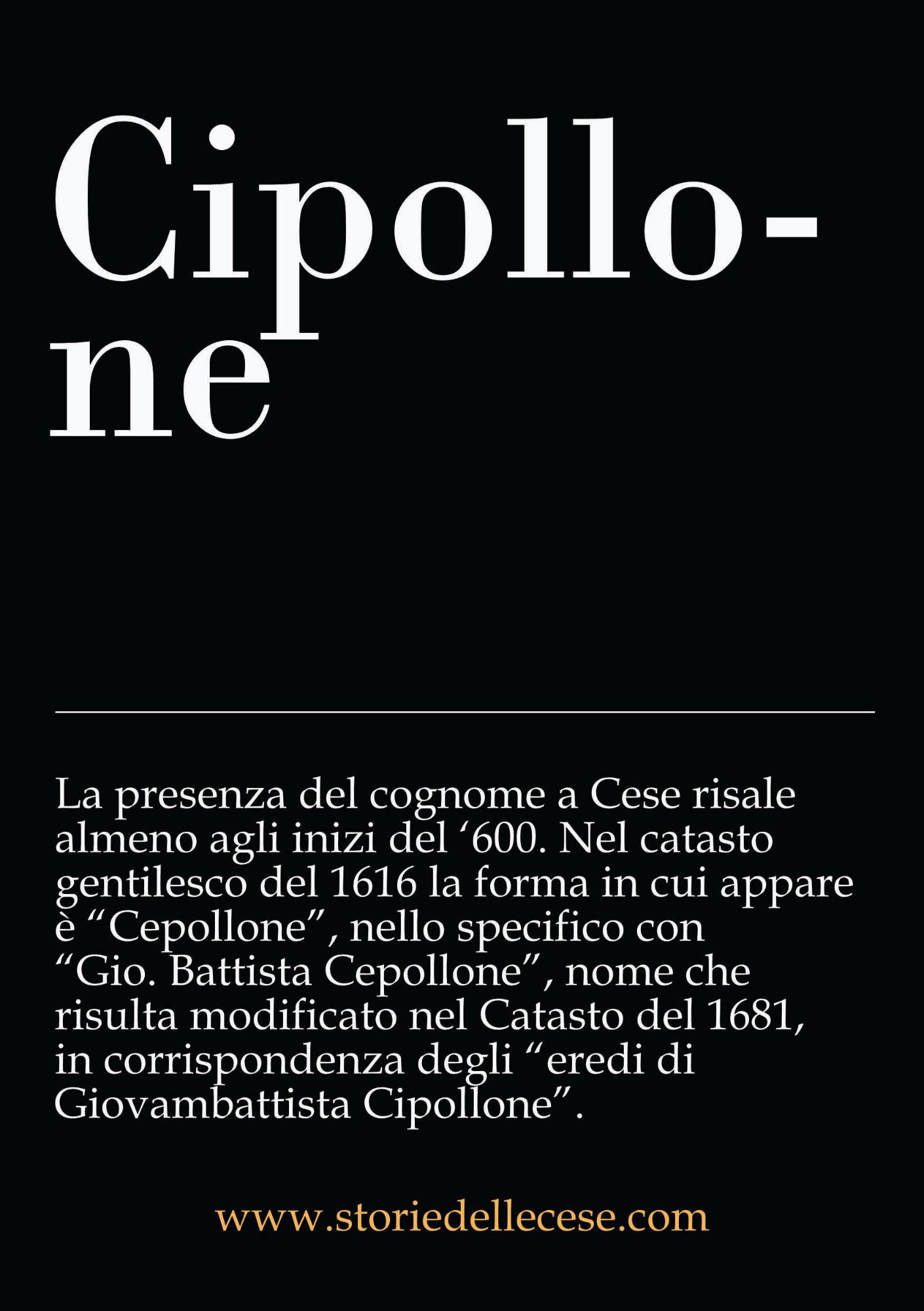 Sull’origine del cognome attualmente più diffuso a Cese, CIPOLLONE, non si hanno dati certi, almeno allo stato attuale; si sa, però, che la presenza di questo cognome nel paese risale quantomeno agli inizi del ‘600. L’elemento inedito che emerge dal catasto gentilesco del 1616 è dato dalla singolare forma in cui lo stesso cognome appare in questo primo registro, ossia “Cepollone”, nello specifico in corrispondenza del nome “Gio. Battista Cepollone” (pro uxore, dunque per la moglie), a quanto pare titolare di numerosi possedimenti. Nel catasto successivo, quello del 1681, si trova invece la forma attuale del cognome sotto il nome di “Don Geronimo Cipollone” e degli “eredi di Giovambattista Cipollone”, il cui nome risulta dunque qui variato. Nel catasto del 1754 i Cipollone sono già più numerosi e sembrano aver raggiunto un ceto sociale più elevato, soprattutto per merito di Angelo Cipollone, che compare con la carica di “massaro”. Gli altri nomi presenti nel catasto settecentesco sono quelli di Domenico, Francesco, Geronimo (a volte riportato come Girolamo), Giovanni (Cecilia, vedova di), Don Angelo, Don Filippo, Silvestro, Giuseppe e Nunzio. Sull’etimologia del cognome, in linea generale si ipotizza che “Cipollone” derivi direttamente (in questo caso tramite un accrescitivo), da soprannomi che riportano al consumo di cipolle o al mestiere di contadino coltivatore di cipolle. Allo stesso modo, l’origine soprannominale potrebbe derivare da caratteristiche fisiche o caratteriali del capostipite. In merito all’arrivo ed alla diffusione del cognome a Cese si possono azzardare solo alcune ipotesi, che restano grosso modo invariate anche alla luce di questa inedita forma trovata nel catasto del 1616. “Cepollone” rimanda infatti alla stessa famiglia cognominale di “Cipollone” e in epoca medioevale risulta presente sia in Abruzzo (a Pescocostanzo, ad esempio) che in Molise, nel basso Lazio e in Campania.