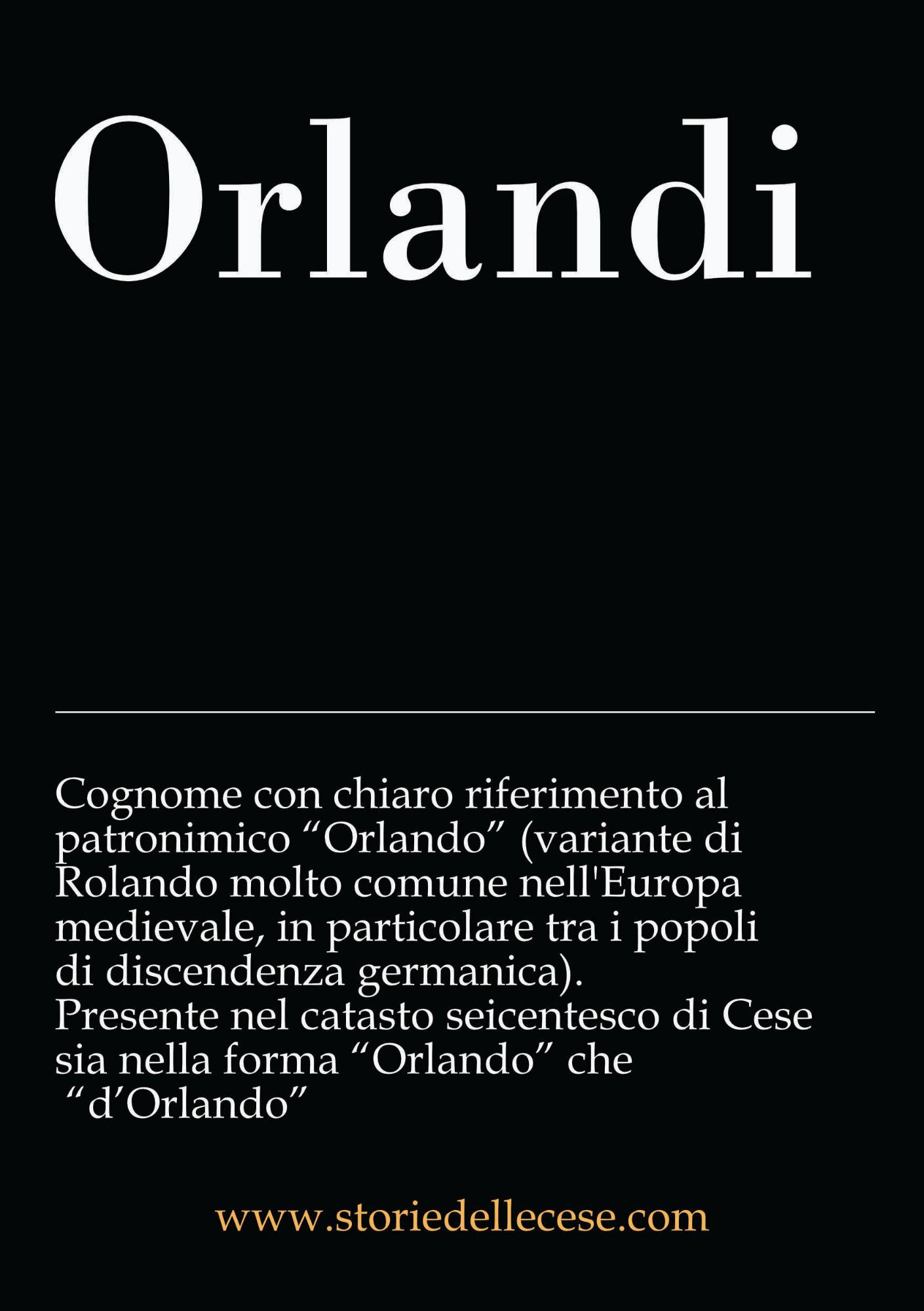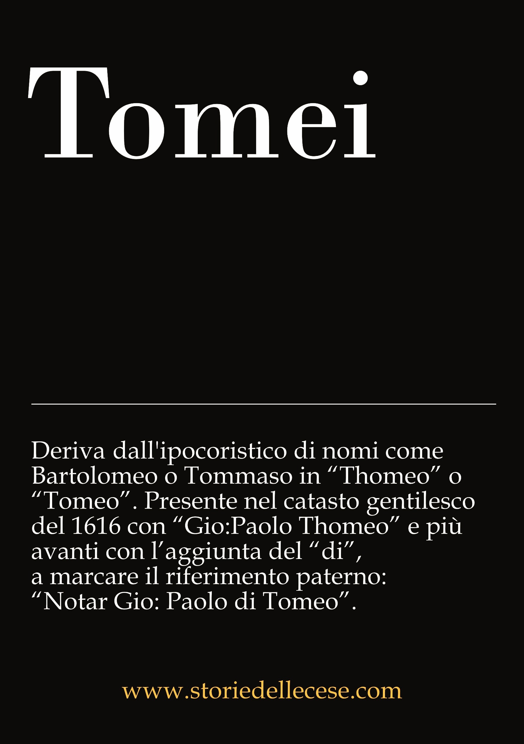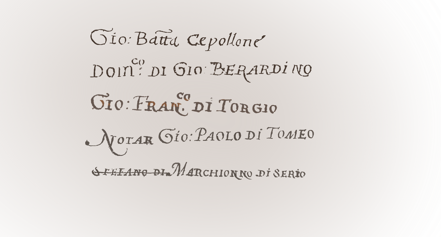 Altri cognomi hanno perso nel tempo la parte preposizionale per assumere natura propria, pur mantenendo a volte entrambe le forme anche all’interno dello stesso documento (come i catasti qui esaminati). È il caso, ad esempio, del cognome ORLANDI, con chiaro riferimento al patronimico “Orlando” (variante del nome Rolando e molto comune nell’Europa medievale, in particolare tra i popoli di discendenza germanica); nel catasto seicentesco di Cese è infatti presente sia “Domenico Orlando” che “Gio.Battista”, “Aurelio” e “Natale d’Orlando”. Quest’ultimo nome, appartenente ad un possidente di Celano, nel catasto successivo diventa semplicemente “Natale Orlando”, a testimoniare il passaggio su menzionato. Anche il cognome TOMEI rientra nella stessa casistica, derivando dall’ipocoristico di nomi come Bartolomeo o Tommaso. Si tratta dunque di una modificazione fonetica, nello specifico un raccorciamento, di un nome proprio di persona, nel caso particolare “Thomeo” o “Tomeo” come riduzione di Bartolomeo o Tommaso. È presente infatti nel catasto gentilesco del 1616 con “Gio:Paolo Thomeo” e più avanti con l’aggiunta del “di”, a marcare il riferimento paterno: “Notar Gio: Paolo di Tomeo”, “Patritio di Tomeo” e “Martio di Tomeo”. La forma comprensiva del “di” scompare già nel catasto del 1681, dove è presente solo “Cesidio Antonio Tomei”, mentre il “notar Giovanni Paolo Tomei” figura già nel 1616. Nei catasti successivi, invece, si trovano sia “Giuseppe Thomeo” e “Carlo Thomeo” che “Carlo Thomei”, mentre nel registro del 1754 si ritrova soltanto la forma moderna, in corrispondenza di “Don Carlo”, “Fabiano”, “Giovambattista” e “Don Gaetano Tomei”. Anche il cognome MARCHIONNI fa plausibilmente riferimento ad un nome proprio di persona, in questo caso “Marchionno”. Nel catasto gentilesco del 1616 figura in particolare “Stefano di Marchionno di Serio”, scritto esattamente in questa forma, ossia con il depennamento di “Stefano di”, ad indicare chiaramente che Marchionno era il nome del padre (a sua volta figlio di tale Serio). Il cognome deriva dunque dal nome medioevale Marchionus o Marchione, che è una forma evoluta dal nome composto Marcus Johannes, ossia Marco Giovanni, trasformato poi in Marchionne e Marchionno. Nel catasto gentilesco di inizi‘700 il “di” è già scomparso e la stessa persona o un suo discendente viene riportato come “Stefano Marchionno”; un altro, invece, è presente come “Gio. Marchionno”. Nel catasto del 1754 compare soltanto la forma moderna “Marchionni” affianco ai nomi di “Pietro Paolo” (riportato anche come “Marchionne”, all’interno), “Don Francesco” e “Benedetto” (deputato). Un’evoluzione analoga sembra aver seguito anche il cognome PATRIZI. A livello locale, infatti, l’antesignano si riscontra nel nome di un “Marco Patritio” presente all’interno del catasto del 1681. Nello stesso registro si trovano anche “Angelo” e “Gio. Santo Patritio”, ma entrambi i nomi appaiono anche nel Catasto del 1754, seppure nella forma “di Patrizio”, ad indicare proprio la discendenza paterna. Il legame del nome “Patritio” con i patrizi romani, ossia i membri della nobiltà capitolina, è immediato e ben conosciuto; resta interessante, tuttavia, rimarcare la derivazione da patricius e da pater, ossia “padre”. Meno immediata è l’etimologia del cognome TORGE, che sembra in ogni caso far riferimento ad un nome paterno. Nel catasto gentilesco del 1616 sono infatti presenti le due forme “Torgio” e “di Torgio”; nello specifico, i nomi riportati sono quelli di “Marc’Antonio di Torgio”, “Berardino di Torgio”, “Cesare di Torgio”, ma anche “Domenico Torgio” e “Gio:Antonio Torgio”. In un caso particolare si leggono le due forme addirittura all’interno della stessa proprietà, indicata come appartenente agli “eredi di Gio:Francesco di Torgio, fu’ dell’erede di Marcantonio Torgio”. Nei documenti medioevali italiani si ritrova spesso il cognome “Del Torgio”, che ha plausibilmente la stessa radice e rimanda ad un possibile legame con il termine “torchio” ed alle professioni o alle casate collegate. Nel registro successivo si trova invece la forma Torgi nel nome “Marcantonio Torgi”, mentre nel catasto del 1754 compare già la forma moderna “Torge” (Marcantonio e Sabatino).